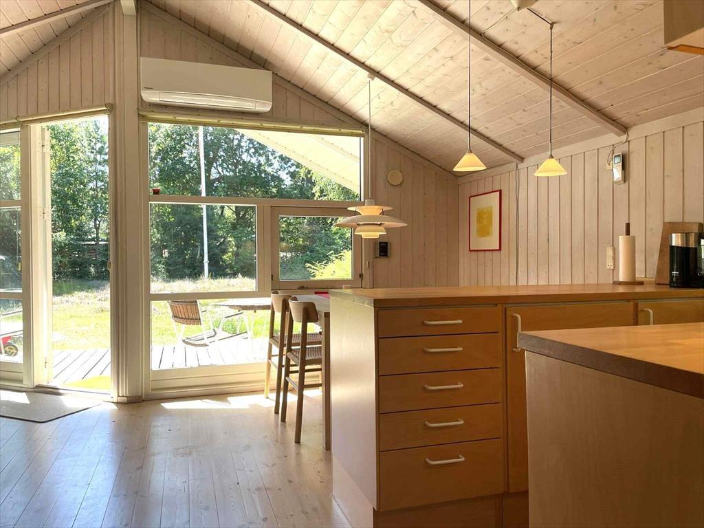 Das Ferienhaus präsentiert sich hell und ausgesprochen einladend. Innen genießt du einen wunderschönen Blick hinaus auf das naturbelassene Grundstück. Der Wohn- und Essbereich bildet das Herzstück des Hauses. Hier kannst du viele schöne Momente genießen – bei einem guten Abendessen oder mit einem spannenden Buch auf dem Sofa, während der Kaminofen leise knistert. In der schönen offenen Küche kannst du wunderbar eine gemütliche Zeit mit deinen Kindern oder Enkelkindern verbringen, zum Beispiel beim Backen von Muffins oder Brötchen, die ihr anschließend gemeinsam auf dem überdachten Teil der Terrasse genießt.
