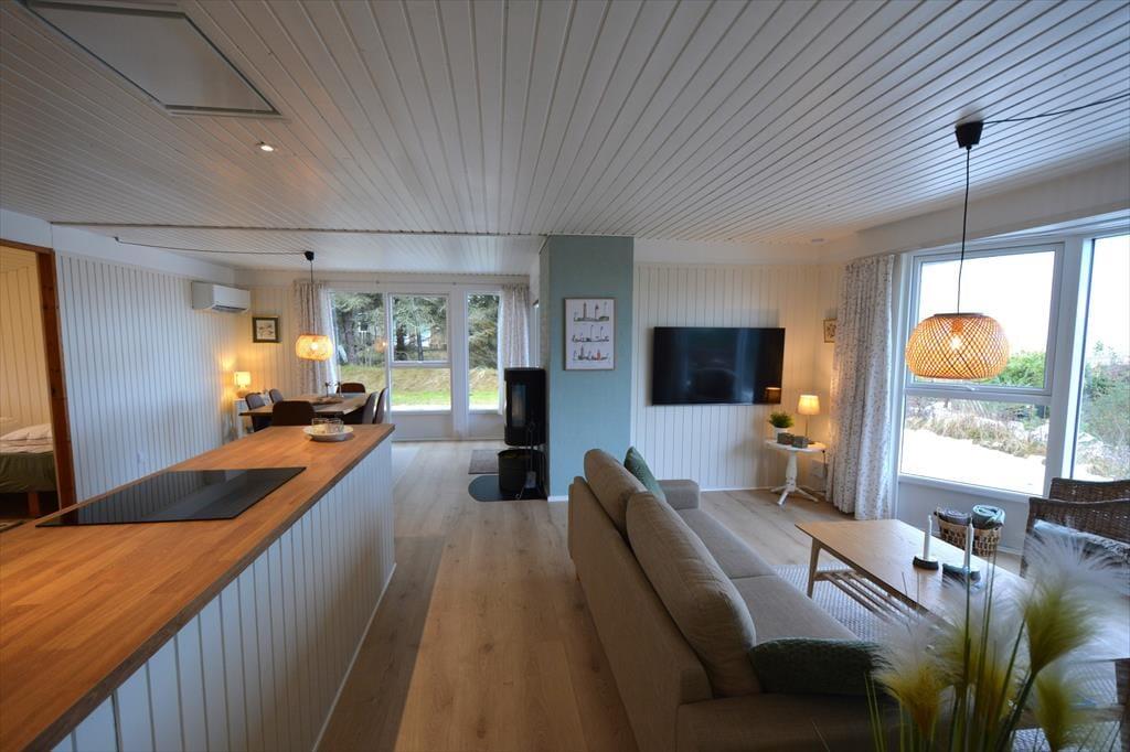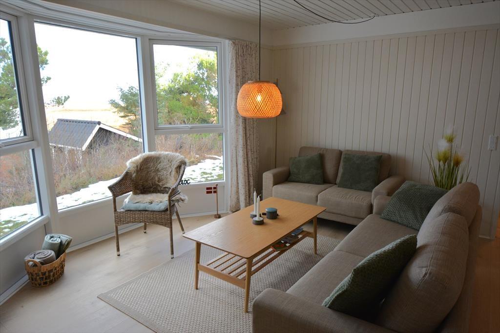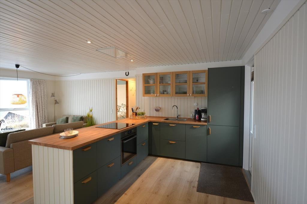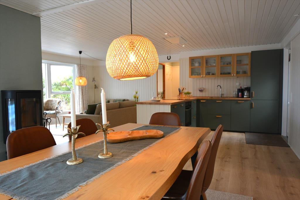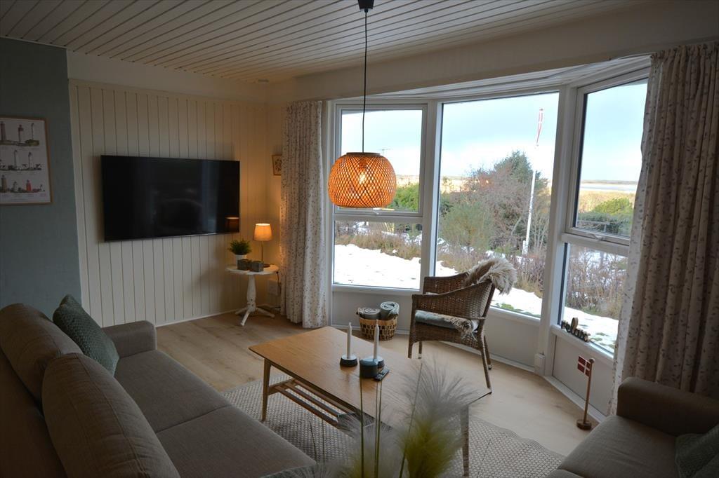 Dieses schöne Ferienhaus in Nr. Fjand bietet eine der fantastischsten Aussichten der Region – mit Panoramablick über den Fjord und die Dünen sowie mit Blick bis zur Fischerstadt Thorsminde in der Ferne. Das Haus liegt leicht erhöht in der Landschaft, sodass Sie die herrliche Aussicht sowohl im Haus als auch draußen auf den Terrassen genießen können. Das Ferienhaus wurde modernisiert, hat sich jedoch seine gemütliche Ferienhausatmosphäre mit ruhigen Farben und einer entspannten Stimmung bewahrt, in der Sie sich schnell wie zu Hause fühlen werden. Finden Sie einen gemütlichen Platz mit Aussicht, lehnen Sie sich zurück mit einem guten Buch oder genießen Sie eine ruhige Tasse Kaffee, während die Erholung einkehrt. Das Herz des Hauses ist der große Wohn- und Essbereich, in dem viel Platz für alle ist und in dem Küche und Wohnzimmer offen miteinander verbunden sind – ideal für gemeinsames Kochen, gemütliche Gespräche und Nähe.