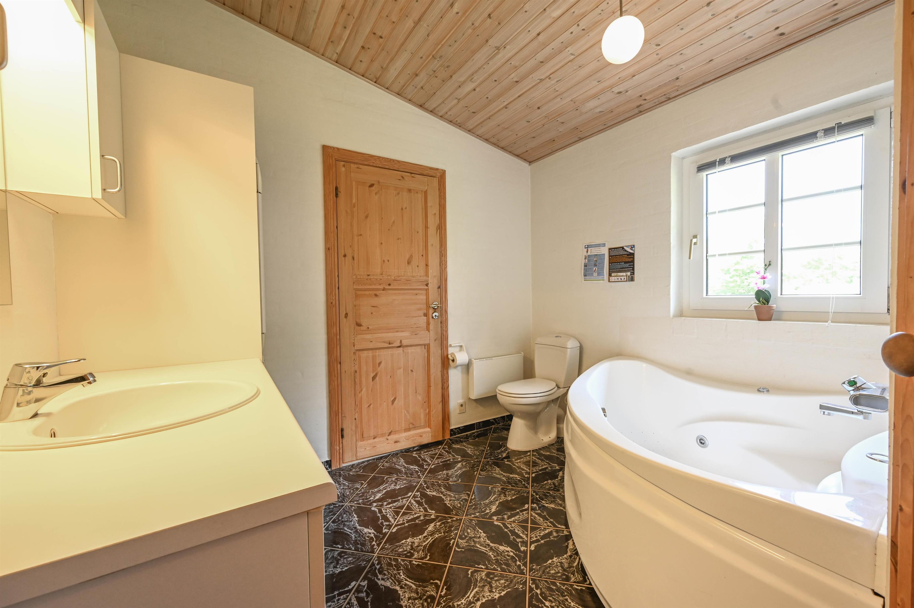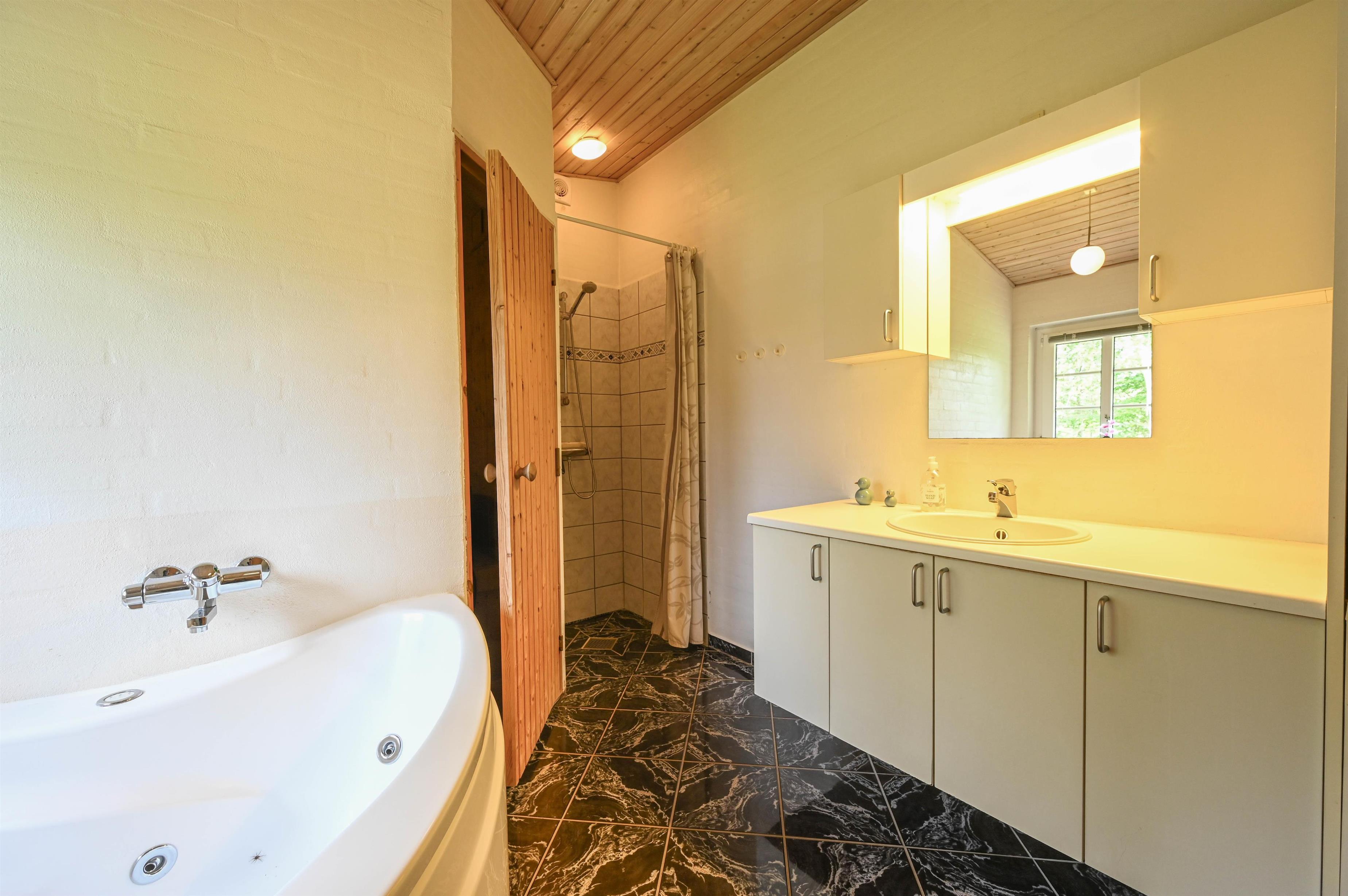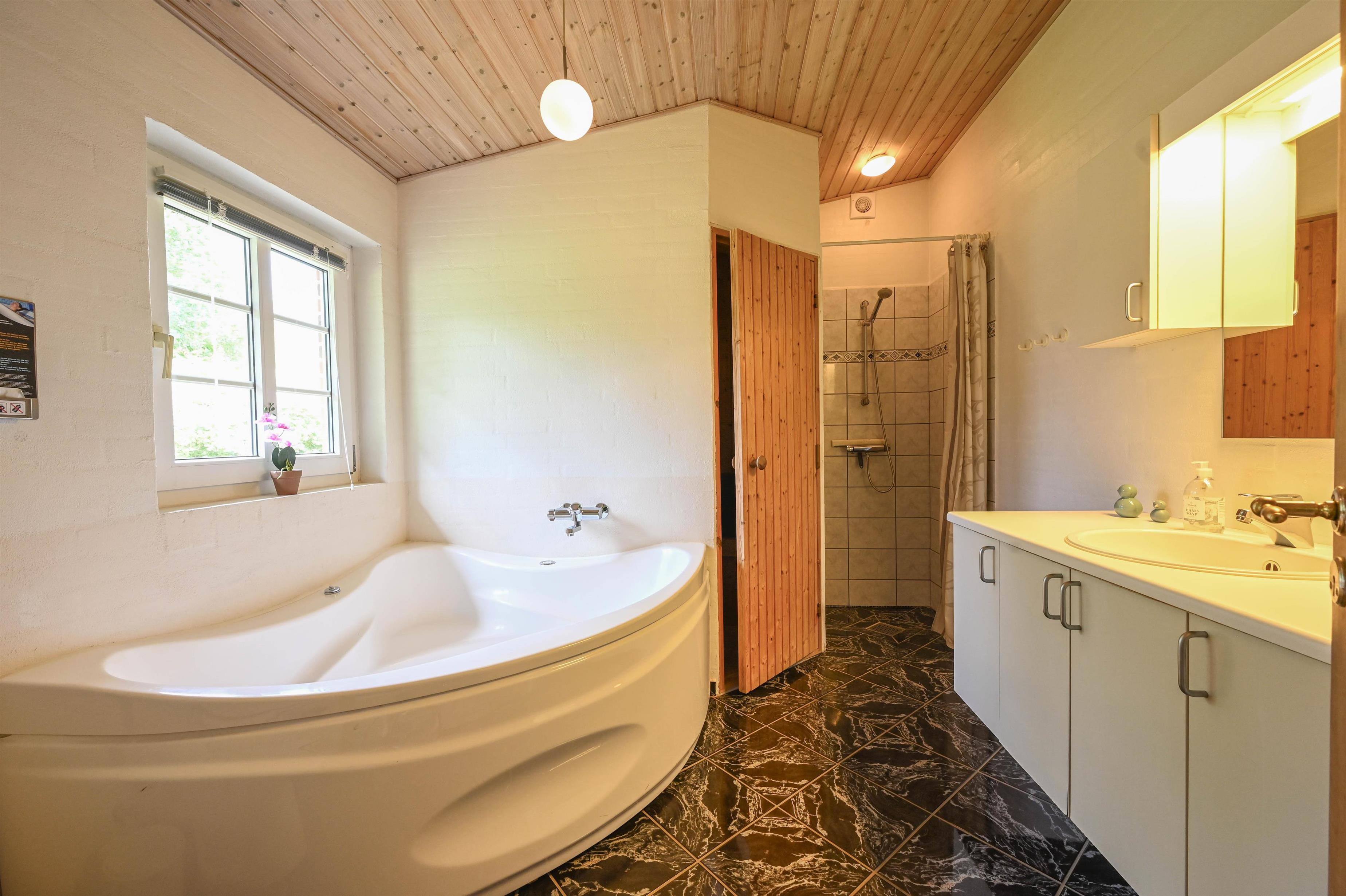 Das moderne Badezimmer bietet sowohl Whirlpool als auch Sauna – ideal, um sich nach einem Tag an der frischen Fjordluft zu entspannen.