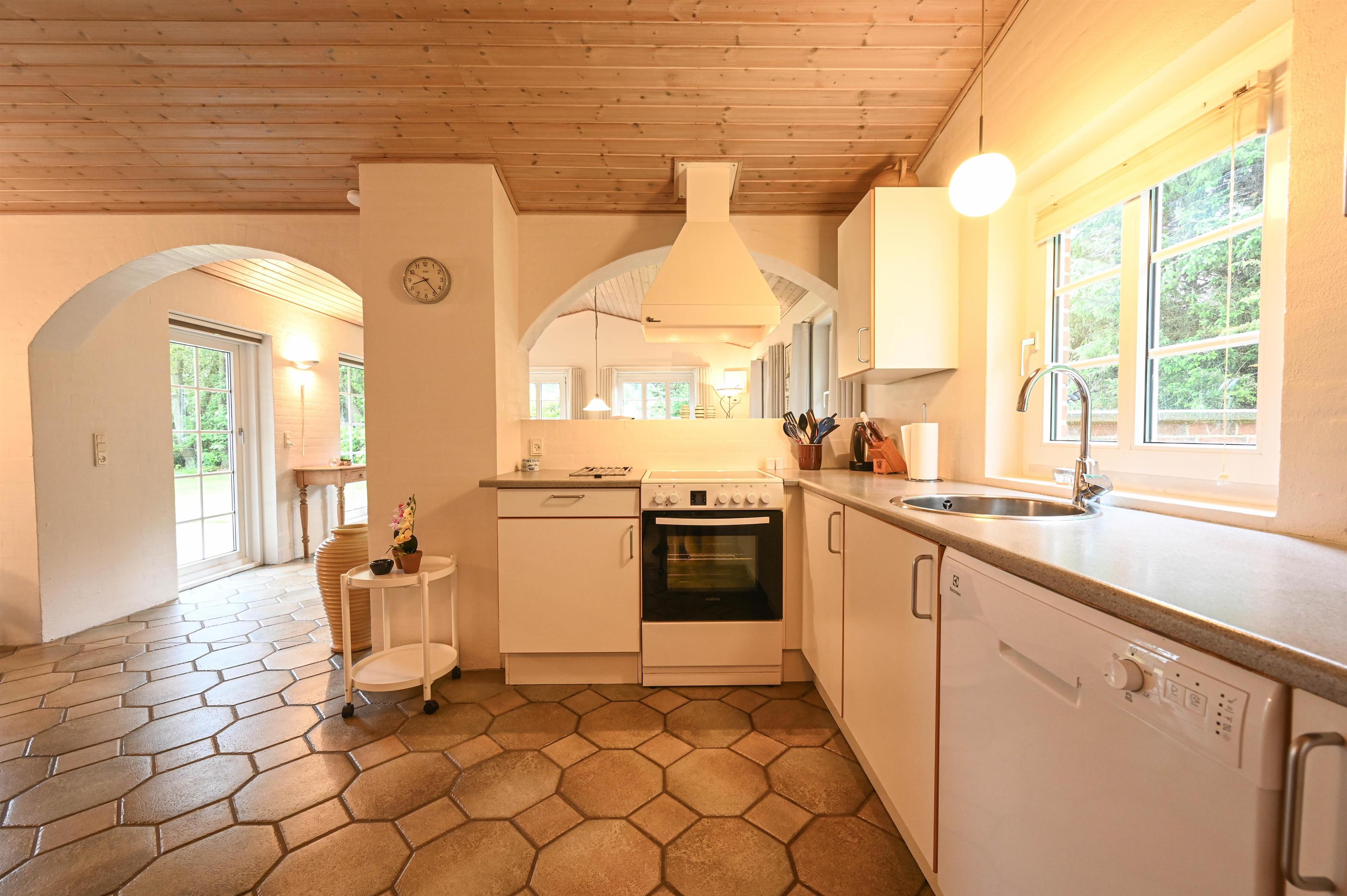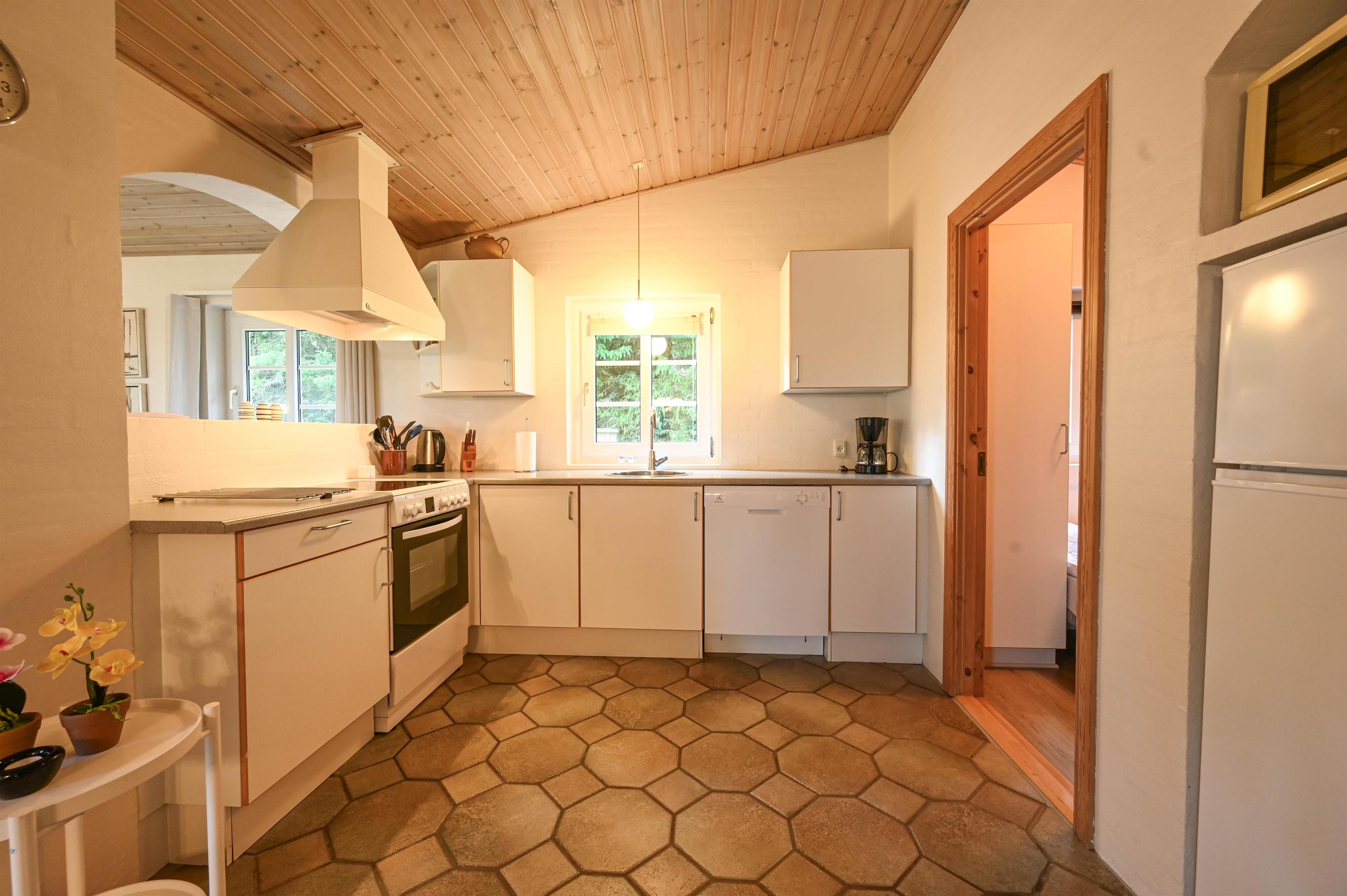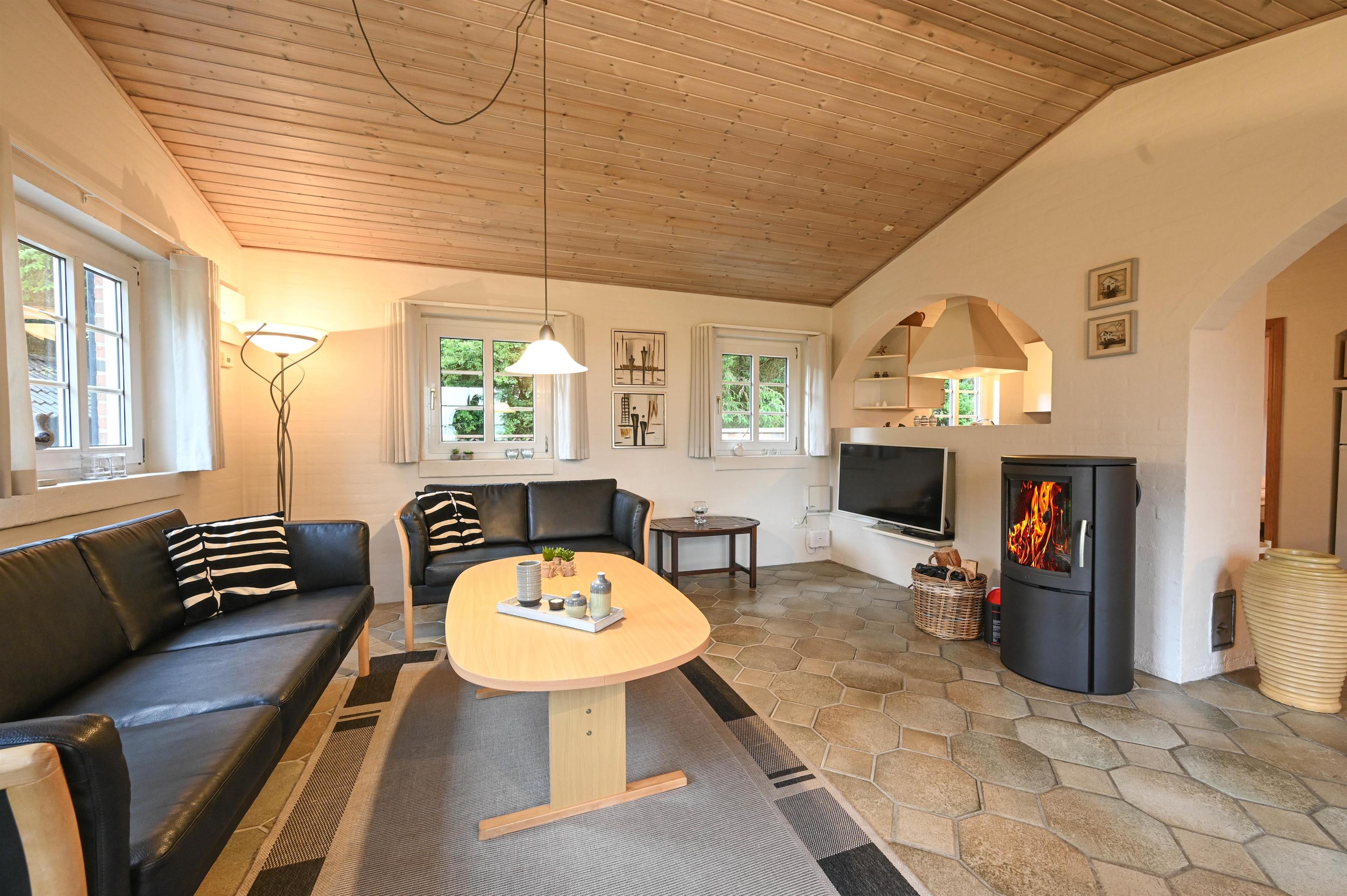 Die schöne, gut ausgestattete Küche verfügt unter anderem über einen Geschirrspüler. Sie ist offen mit dem Wohnraum verbunden, in dem sich ein Essbereich, eine gemütliche Sofaecke, ein Holzofen und der Ausgang zur Terrasse befinden – von hier habt ihr sogar einen kleinen Blick auf den Fjord.