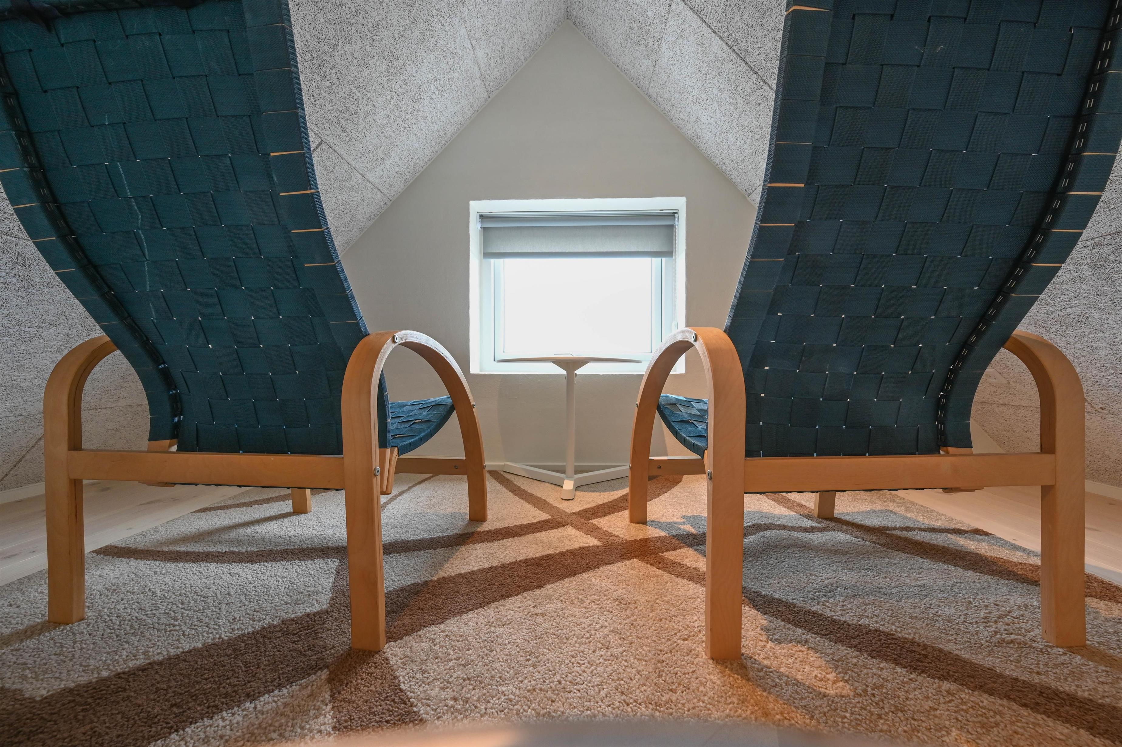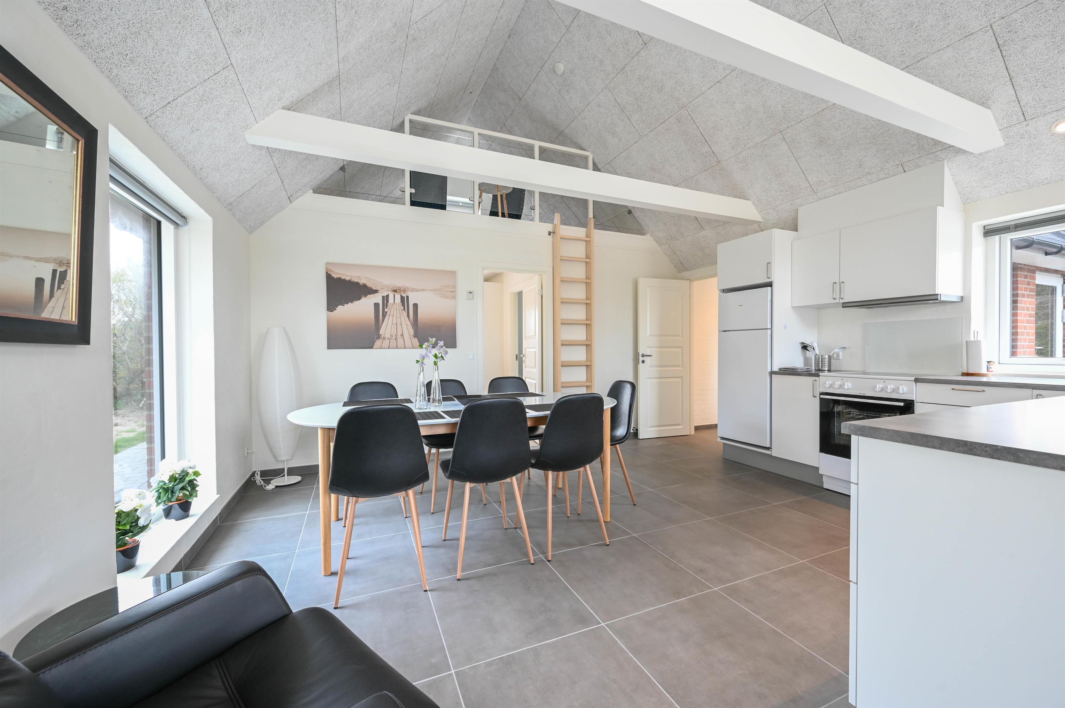 Vom Wohn- und Küchenbereich führt eine Leiter auf den gemütlichen Hems – ein wunderbarer Rückzugsort mit schöner Aussicht über die Wiesen und den Nissum Fjord.