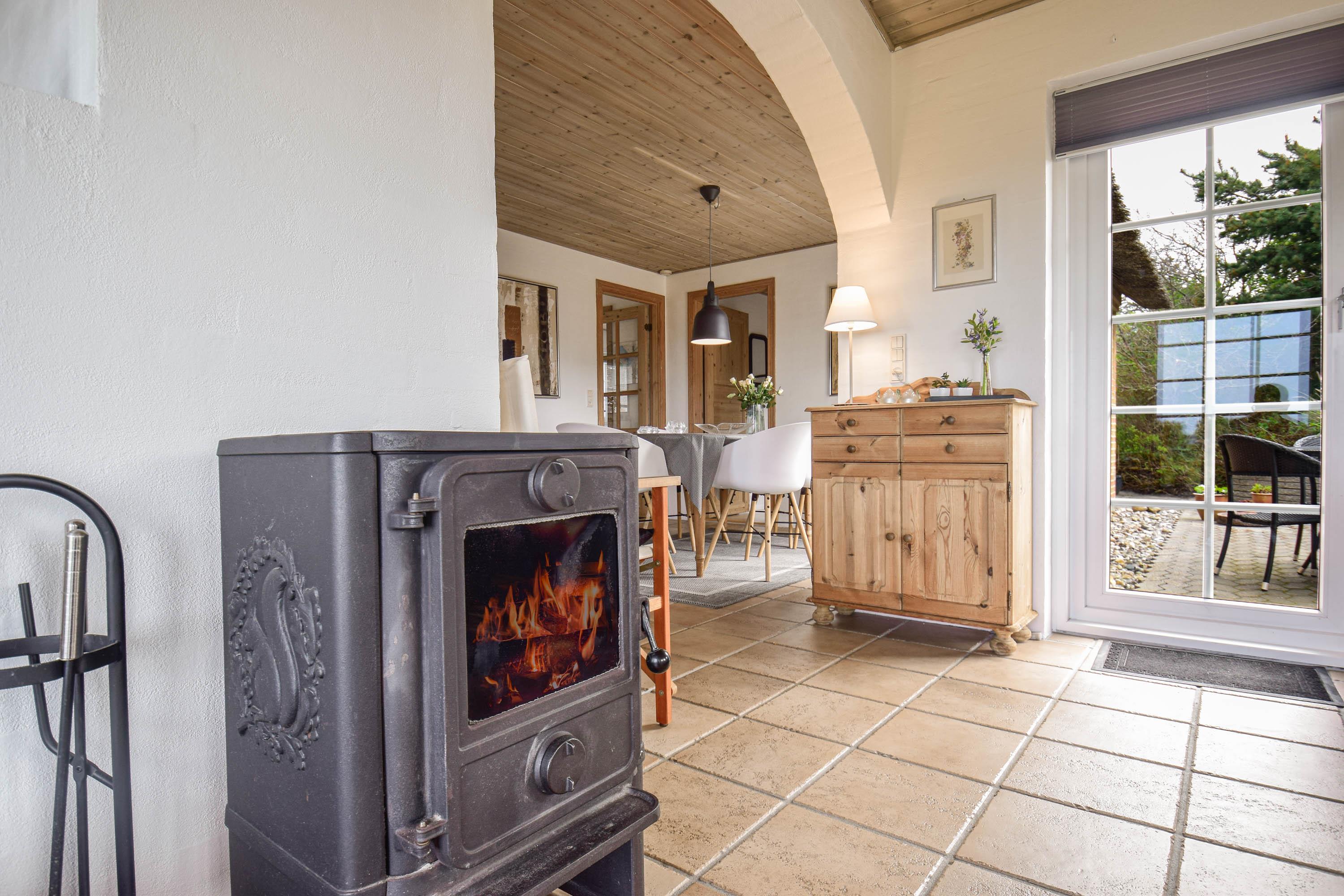 Die moderne, gut ausgestattete Küche verfügt unter anderem über einen Geschirrspüler und ist offen mit dem Wohnbereich verbunden. Hier sorgen Essplatz, Sofaecke und Holzofen für eine gemütliche Atmosphäre – der ideale Ort für gemeinsame Stunden mit Familie oder Freunden.