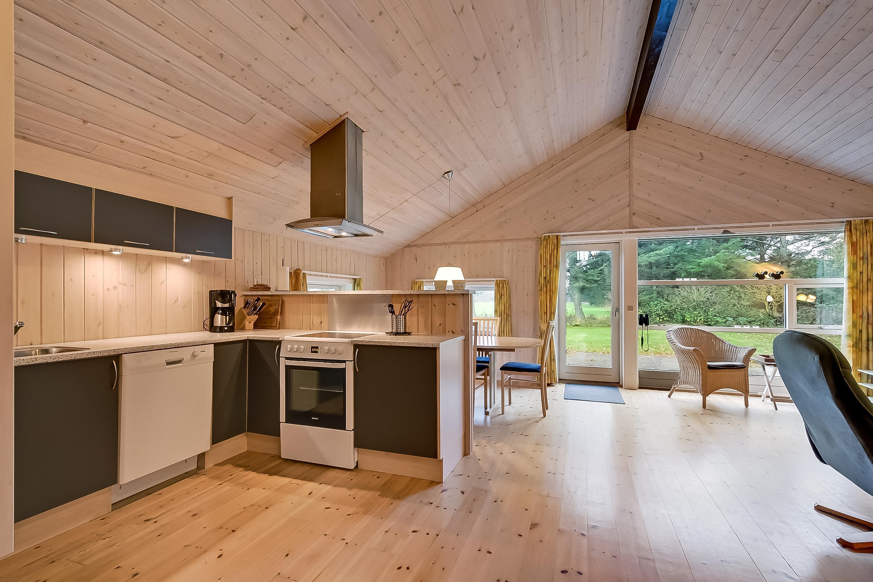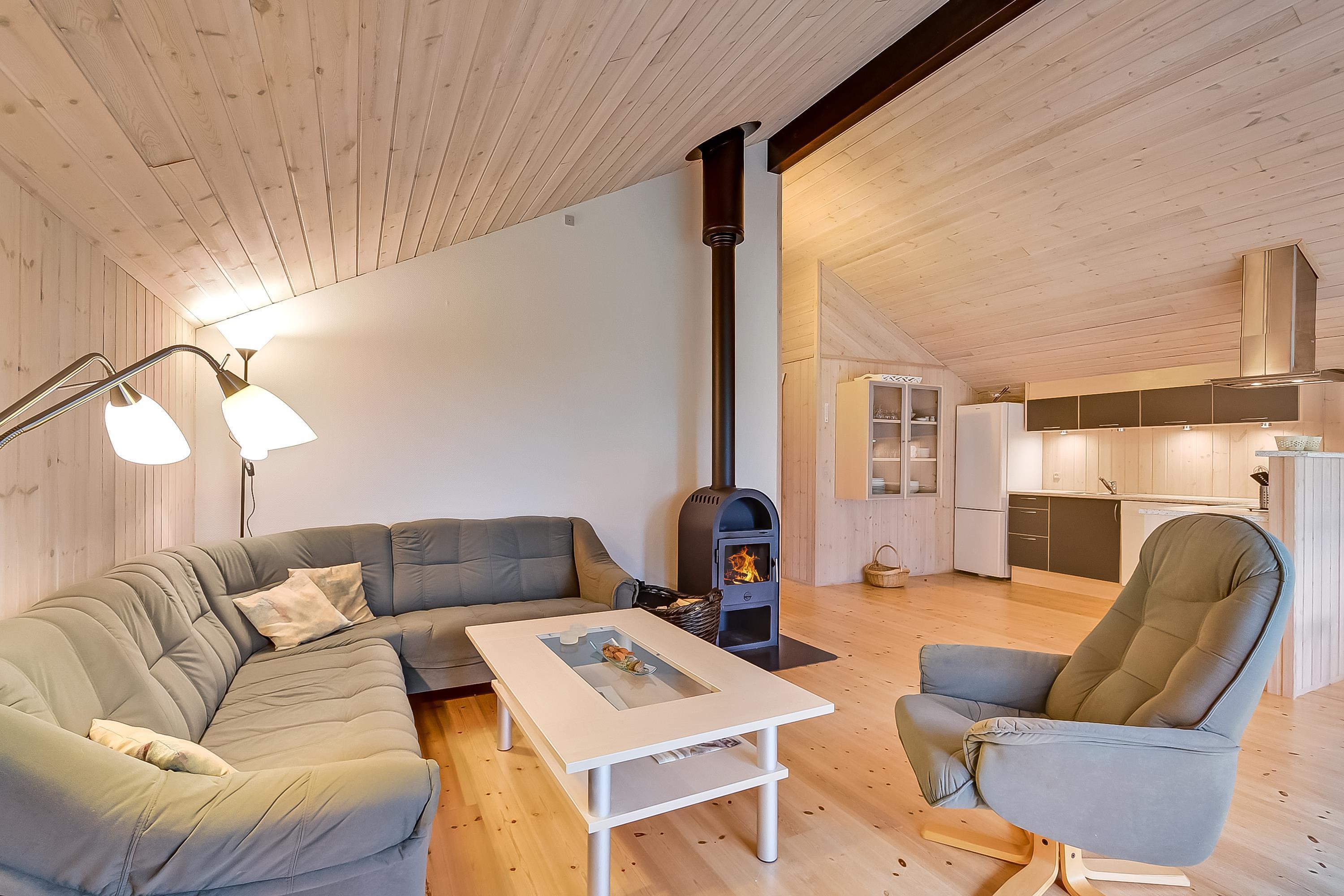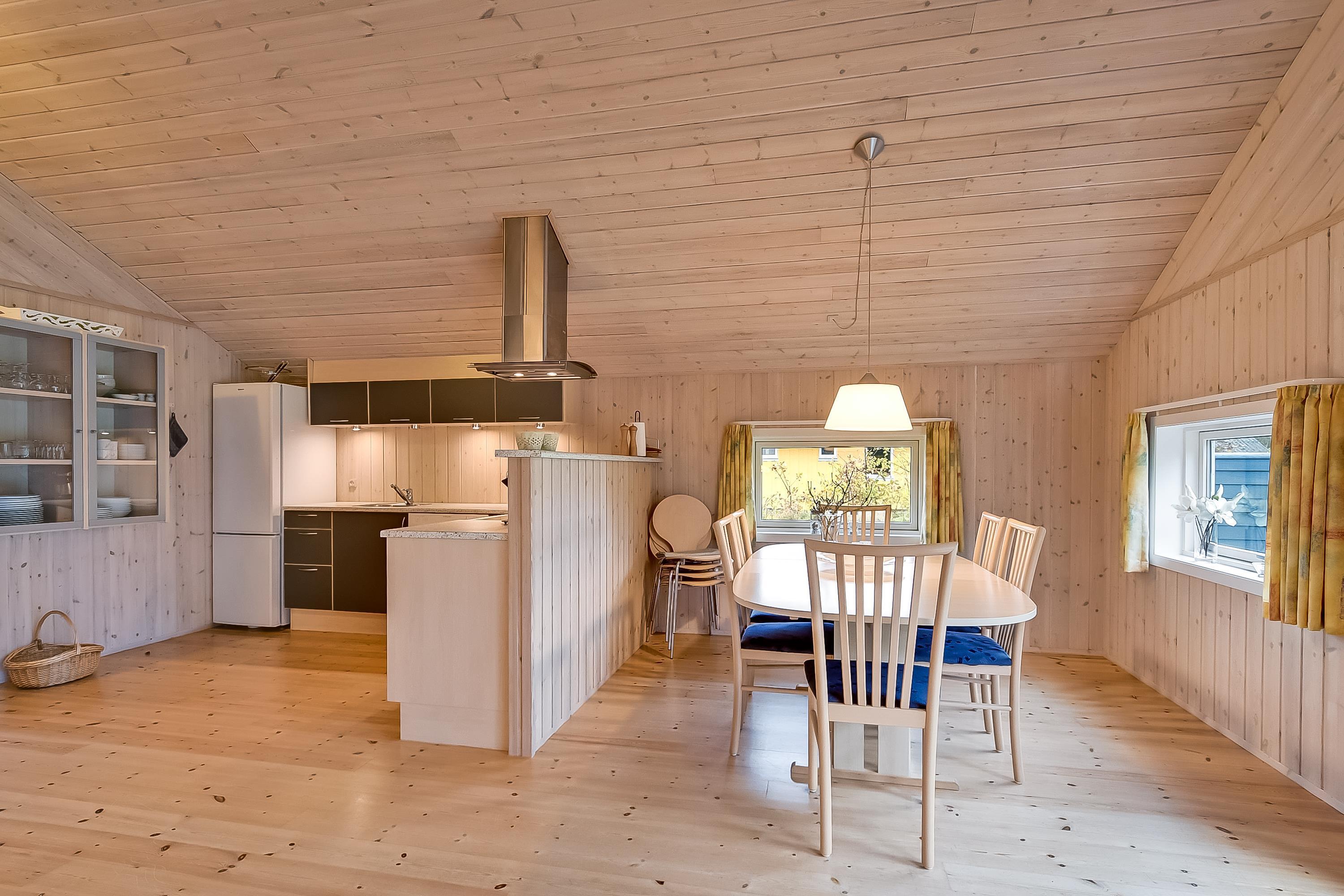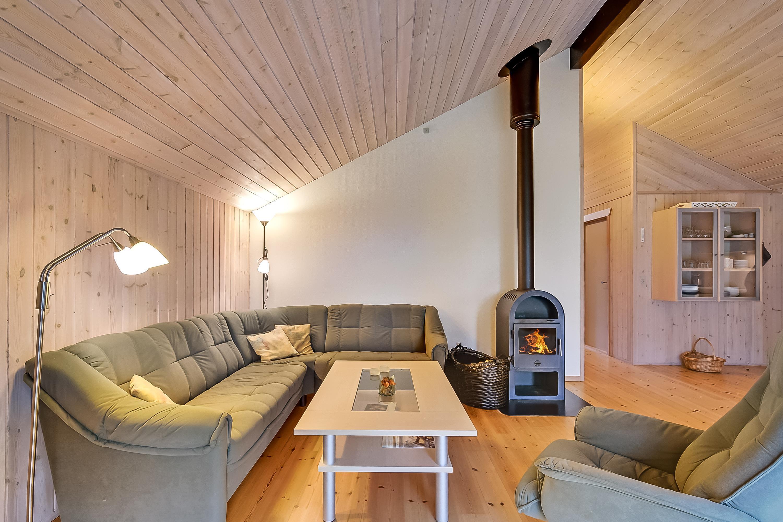Das Ferienhaus ist hell und funktional eingerichtet – mit einer guten Raumaufteilung, bei der alles gepflegt und durchdacht ist. Die helle Küche ist offen mit dem Essbereich und dem Wohnzimmer verbunden, sodass hier viel Platz für gemeinsame Stunden und gemütliche Abende vor dem Kaminofen bleibt. Die großen Südfenster sorgen für viel Licht und holen die Natur direkt ins Haus.