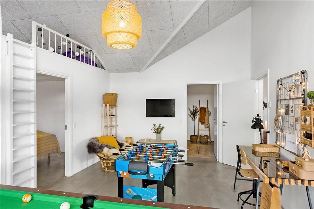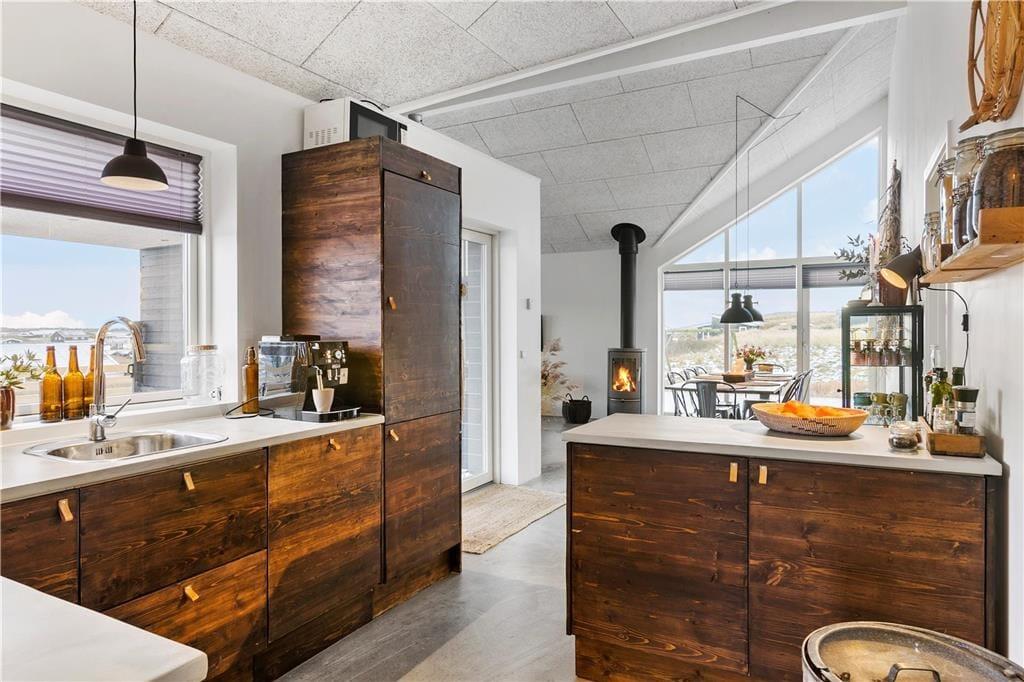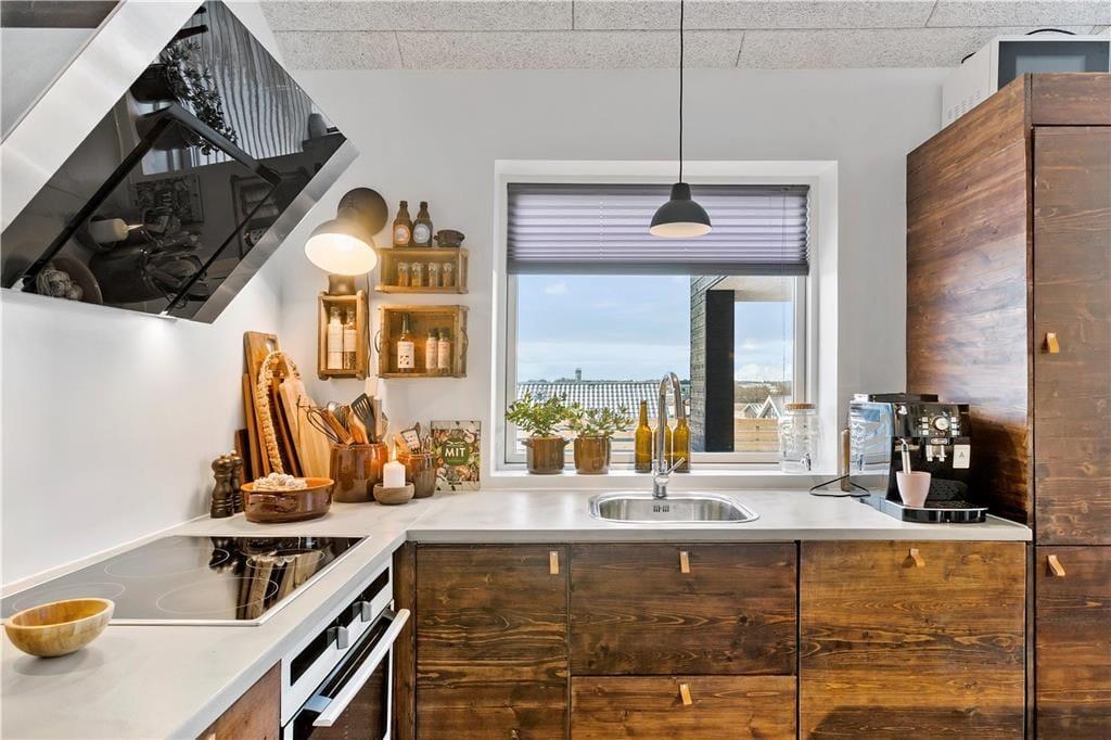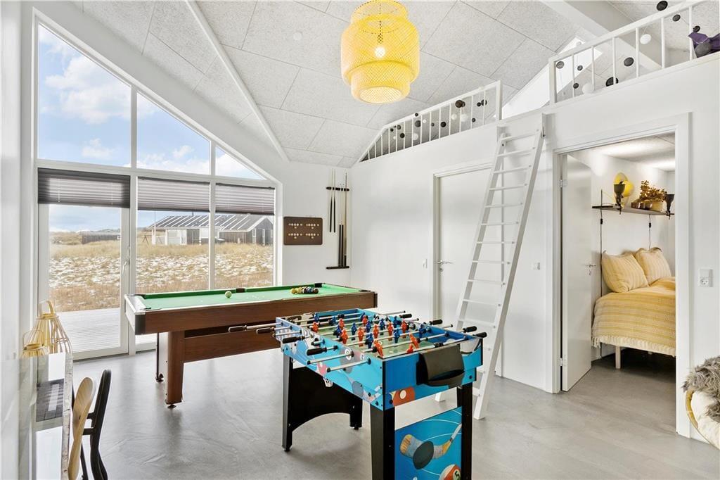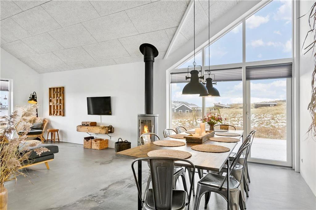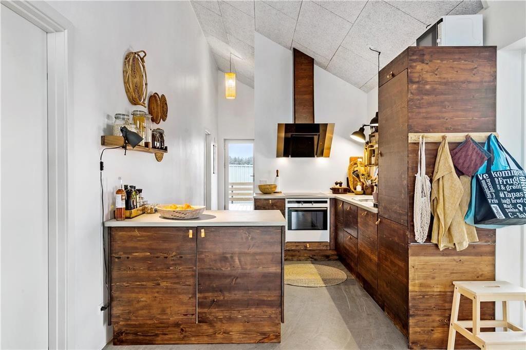 Das Haus ist in einem eleganten und minimalistischen Baustil errichtet, mit großen Fensterpartien, die viel Licht hereinlassen und einen herrlichen Blick auf die Umgebung bieten. Mit 125 m² Wohnfläche habt ihr viel Platz zum Entspannen. Es gibt helle Wohnbereiche mit offener Decke, drei Schlafzimmer und zwei Badezimmer sowie ein herrliches Aktivitätszimmer mit Hems. Das Haus ist geschmackvoll in einem einfachen und rustikalen Ferienhausstil eingerichtet, sodass man sich sofort wohlfühlt. Die Küche ist gut ausgestattet und steht in offener Verbindung mit dem Wohnzimmer, was ideale Bedingungen für gemeinsames Kochen und Beisammensein schafft.