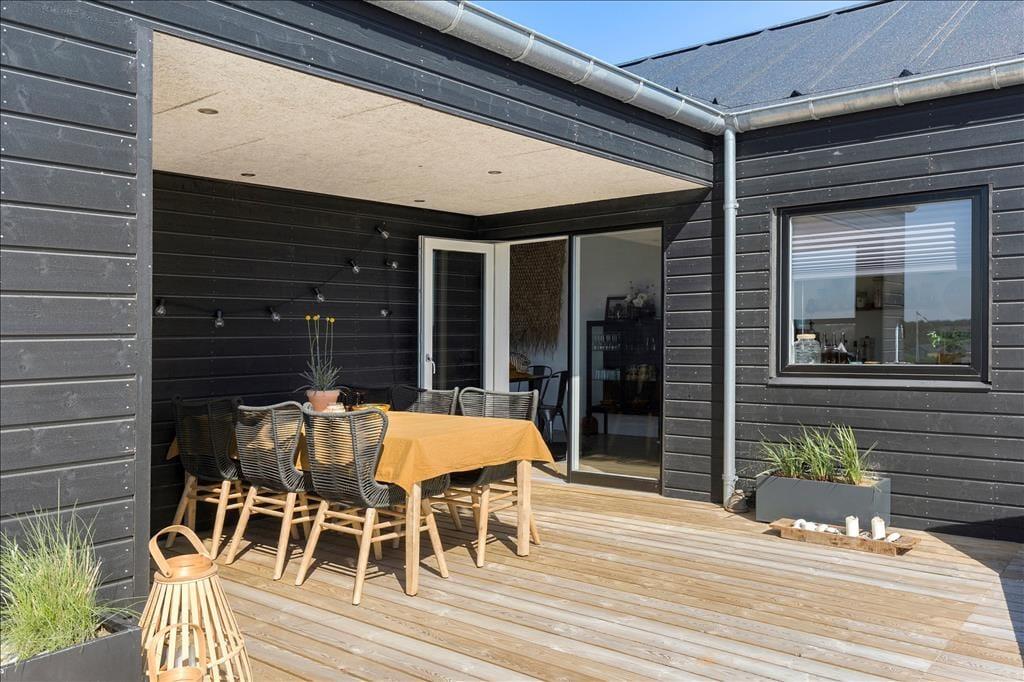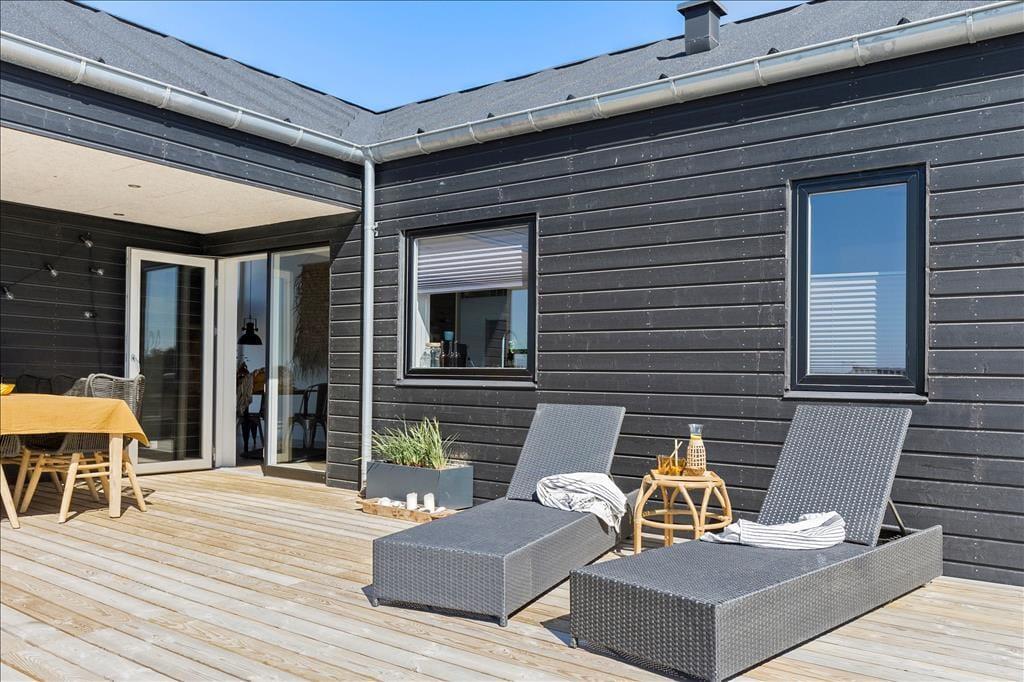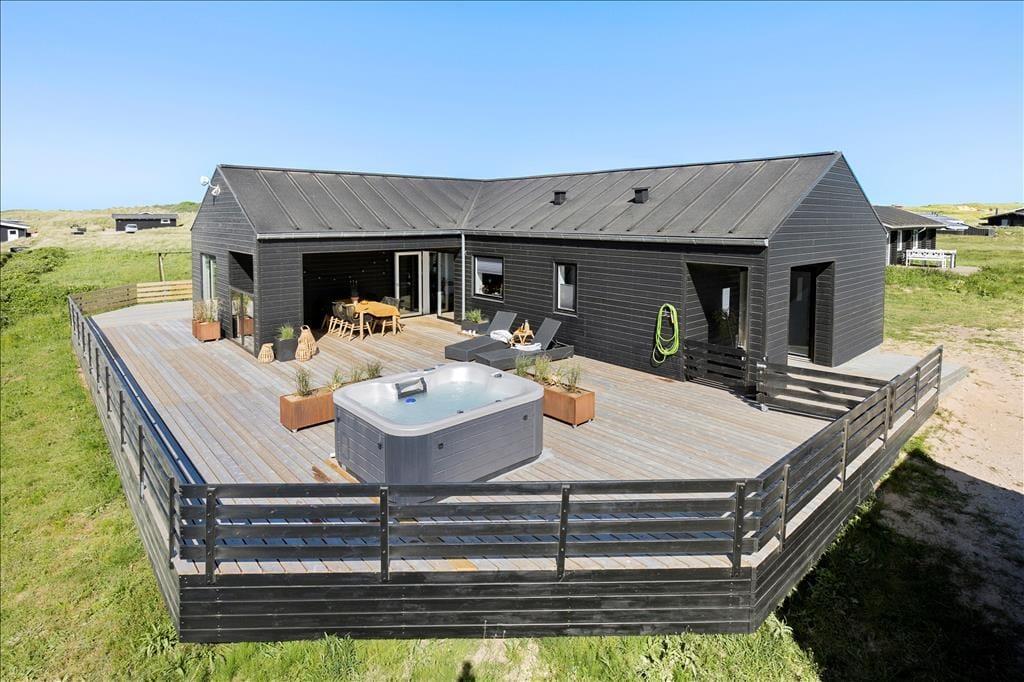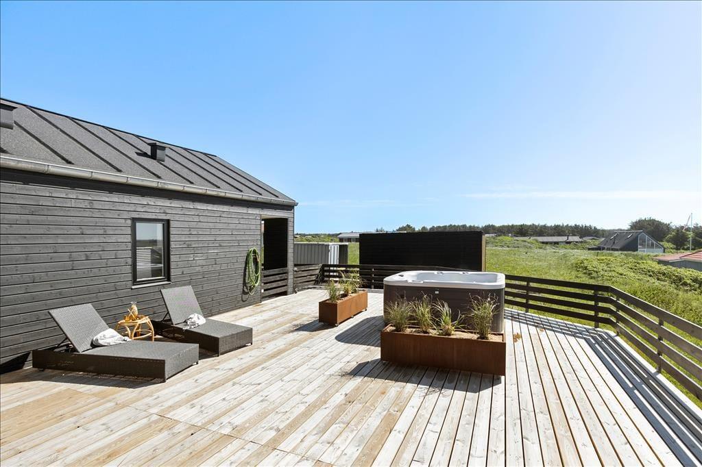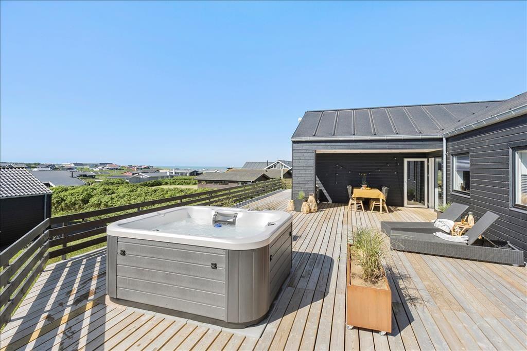 Die Hauptattraktion des Ferienhauses ist zweifellos die große Holzterrasse, die euch einen herrlichen Außenbereich mit fantastischem Meerblick bietet. Da das Haus hoch in der Landschaft liegt, könnt ihr über das gesamte Ferienhausgebiet bis hinunter nach Nr. Lyngby schauen. Die Terrasse verfügt über einen Außen-Whirlpool, und es gibt viel Platz zum Entspannen auf Sonnenliegen, zum gemütlichen Mittagessen oder einfach zum Genießen der schönen Umgebung. Da die Terrasse dem Haus entlang folgt, findet ihr immer einen Platz in der Sonne oder im Windschutz.