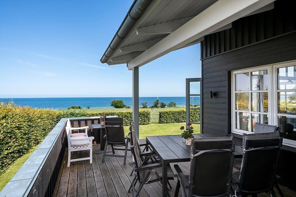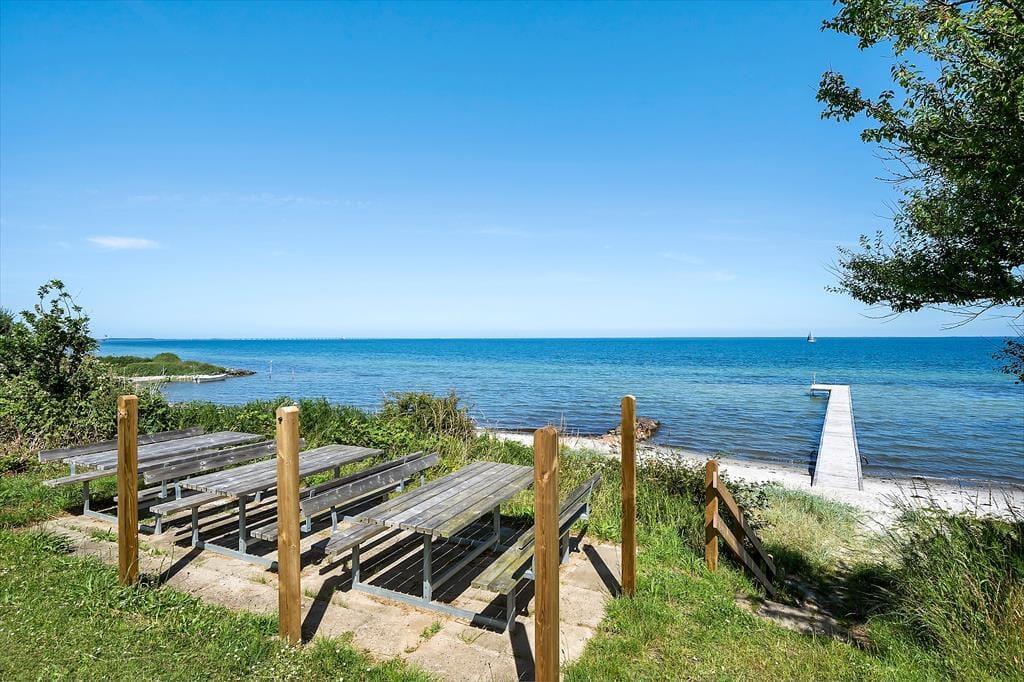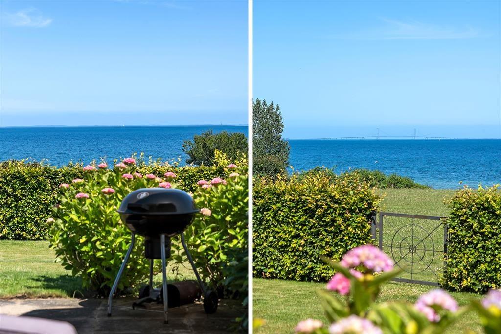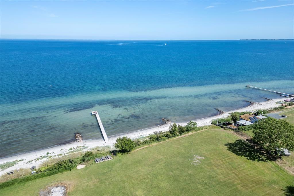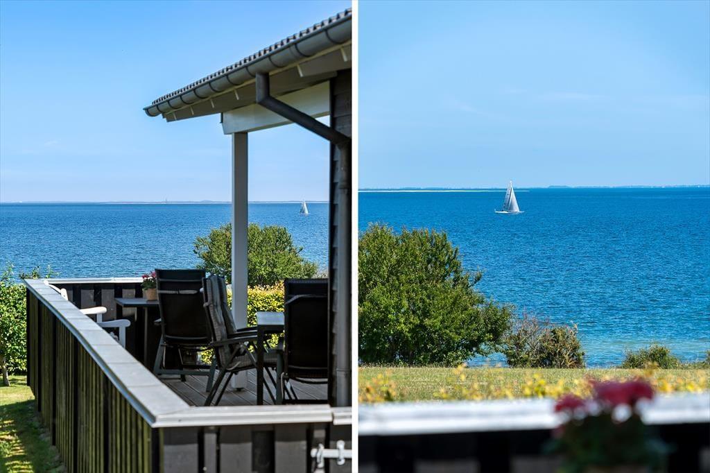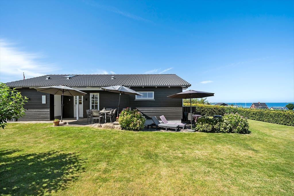 Draußen erwartet Sie ein gepflegter Garten und eine große, teilweise überdachte Holzterrasse. Genießen Sie hier alles – den Morgenkaffee mit Meerblick, Grillabende in der Abendsonne oder einfach totale Entspannung im Liegestuhl. Die erhöhte Lage bietet einen fantastischen Panoramablick auf den Großen Belt und die Inseln am Horizont – bei klarem Wetter sehen Sie bis nach Langeland und Tåsinge. Die Terrasse und der Garten sind gut abgeschirmt, sodass Sie die Natur in Ruhe und Privatsphäre genießen können.