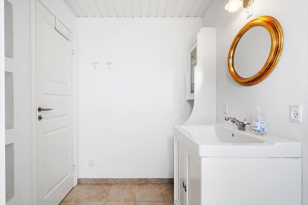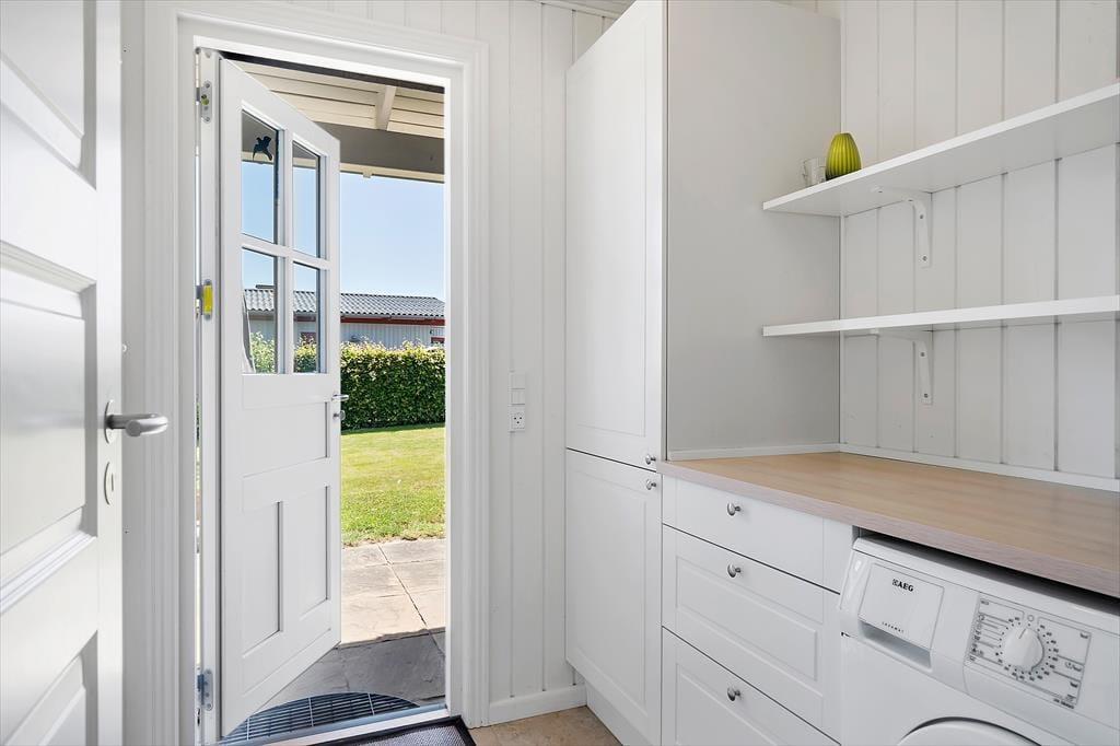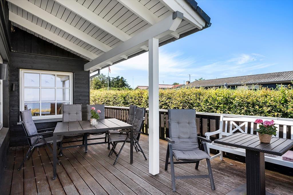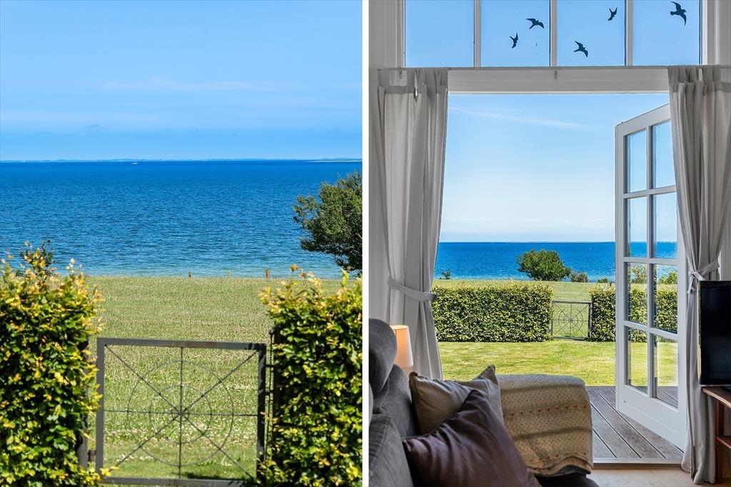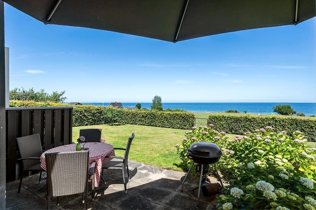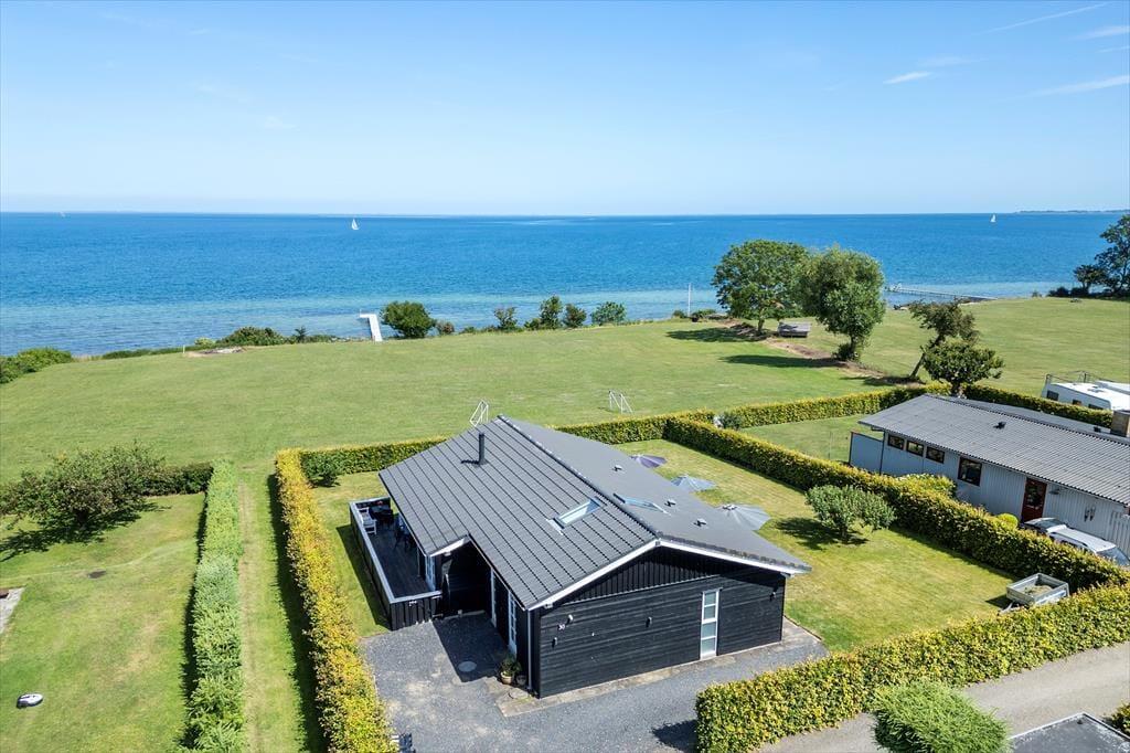 Draußen erwartet Sie ein gepflegter Garten und eine große, teilweise überdachte Holzterrasse. Genießen Sie hier alles – den Morgenkaffee mit Meerblick, Grillabende in der Abendsonne oder einfach totale Entspannung im Liegestuhl. Die erhöhte Lage bietet einen fantastischen Panoramablick auf den Großen Belt und die Inseln am Horizont – bei klarem Wetter sehen Sie bis nach Langeland und Tåsinge. Die Terrasse und der Garten sind gut abgeschirmt, sodass Sie die Natur in Ruhe und Privatsphäre genießen können.