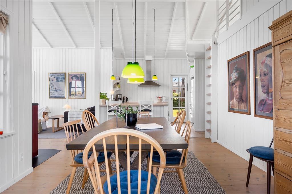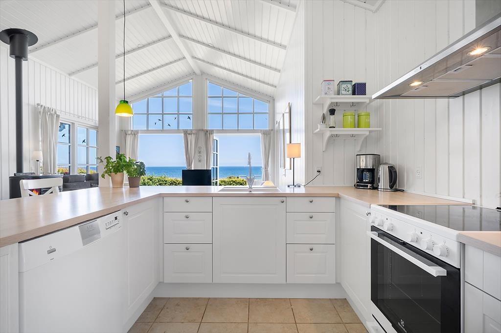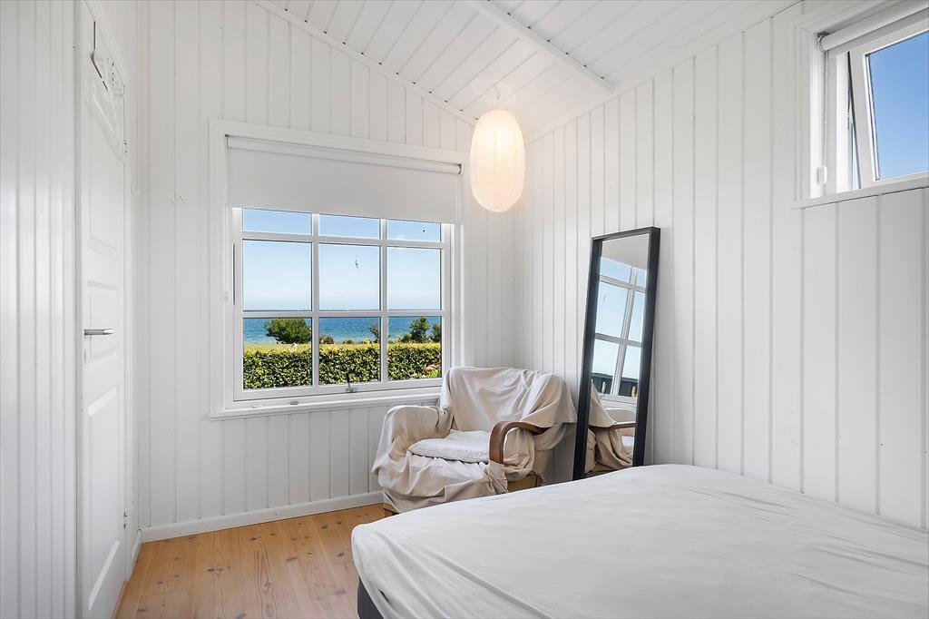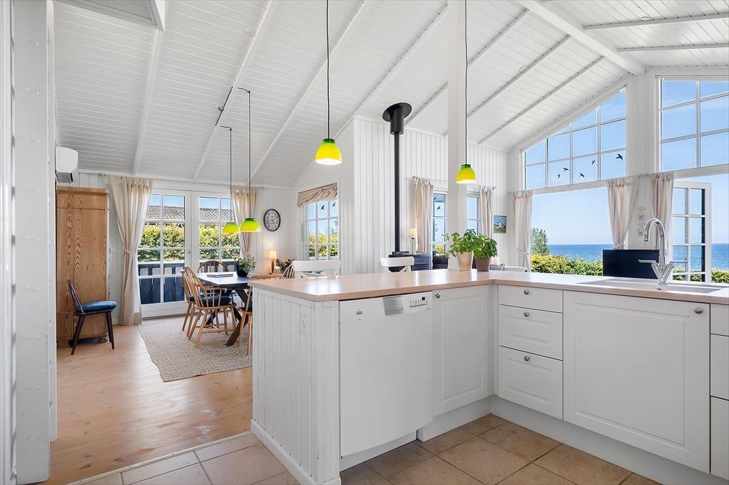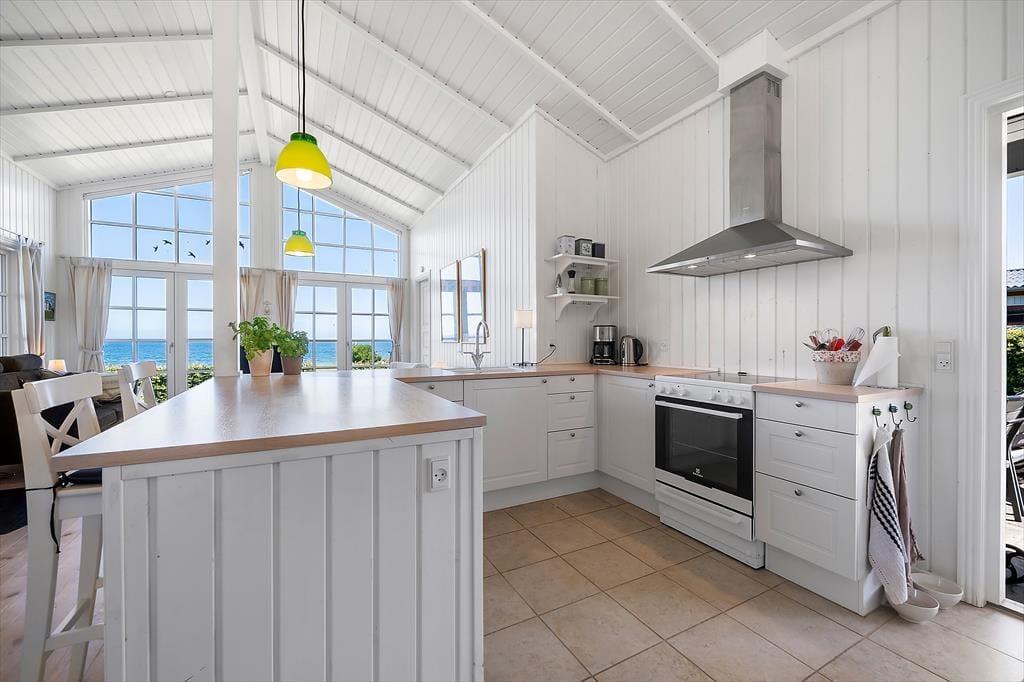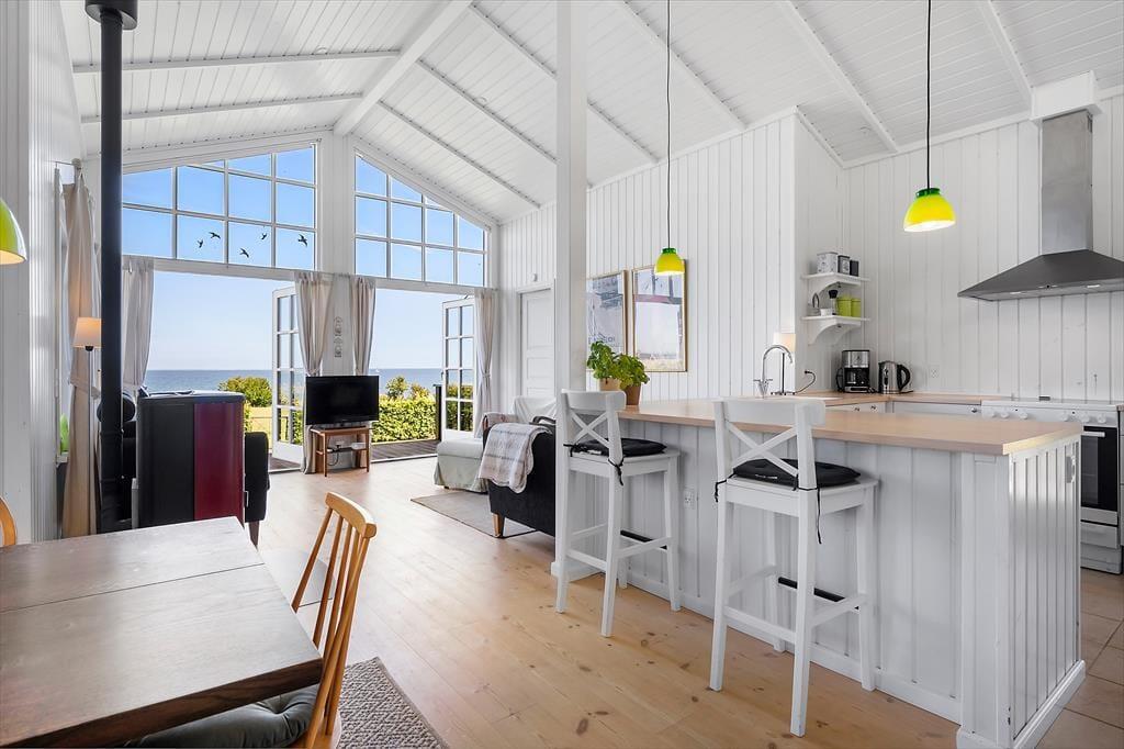 Das helle und geschmackvoll eingerichtete Haus ist auf Gemütlichkeit und Funktionalität ausgerichtet. Der offene Grundriss verbindet Wohnzimmer, Küche und Essbereich zu einem großzügigen Wohnraum – mit dem Großen Belt als lebendigem Hintergrund durch die großen Panoramafenster. Genießen Sie das Frühstück mit Blick auf das Meer und beobachten Sie abends den Sonnenuntergang vom Sofa aus. Das Wohnzimmer ist mit bequemen Möbeln, einem Pelletofen sowie modernen Annehmlichkeiten wie TV und WLAN ausgestattet – perfekt zum Entspannen oder zum Arbeiten auf Abstand.