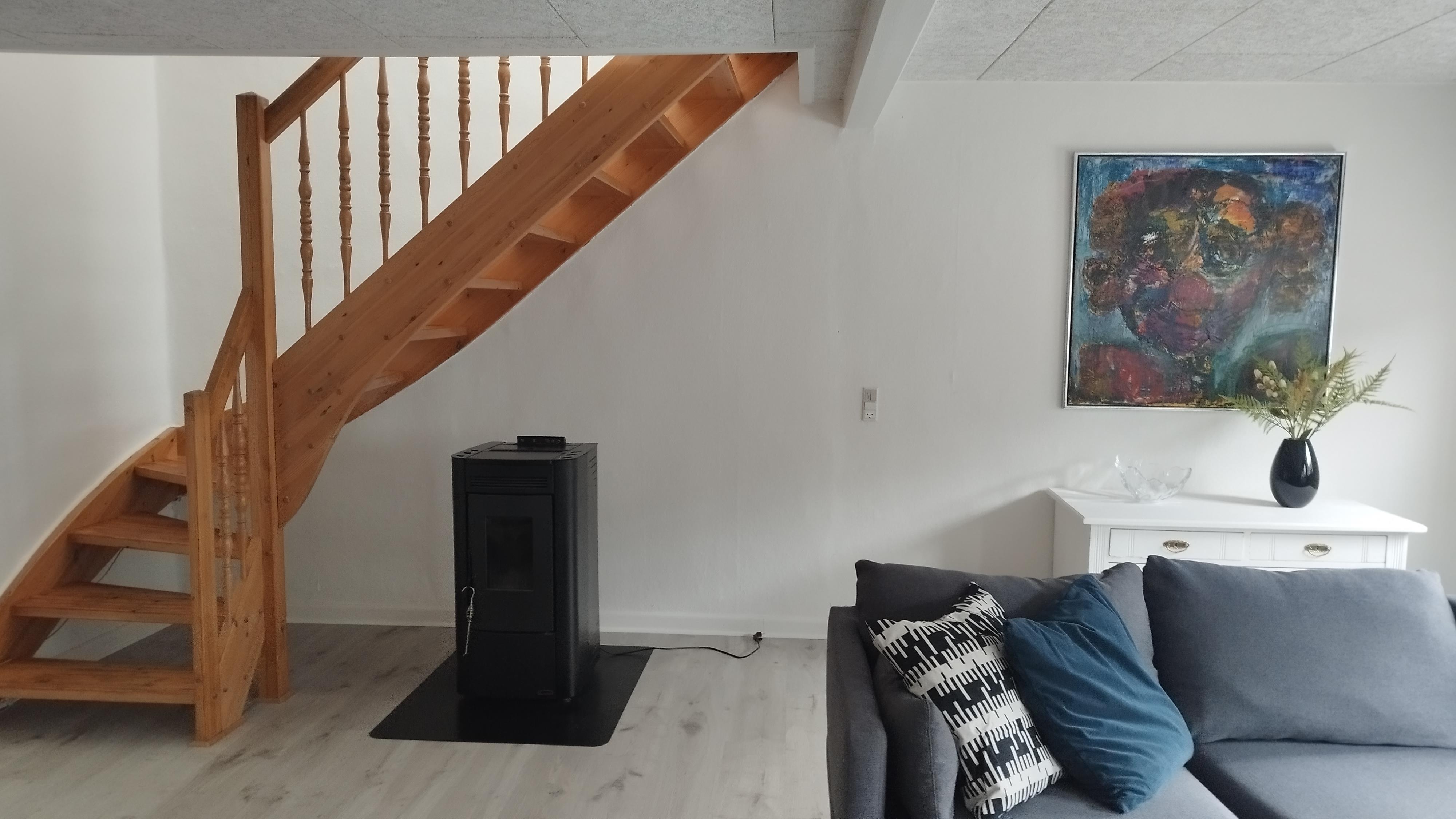 Das Wohnzimmer ist mit neuen, zeitgemäßen Möbeln eingerichtet und verfügt über Smart-TV und WLAN sowie einen effizienten Pelletofen, der für angenehme Wärme und eine gemütliche Atmosphäre sorgt. Das Haus präsentiert sich gepflegt und stilvoll, mit Respekt für seinen ursprünglichen Charme.