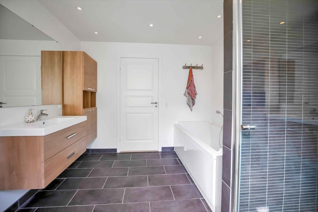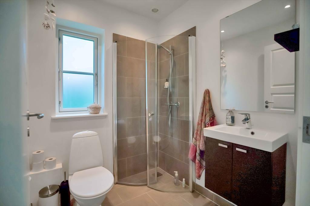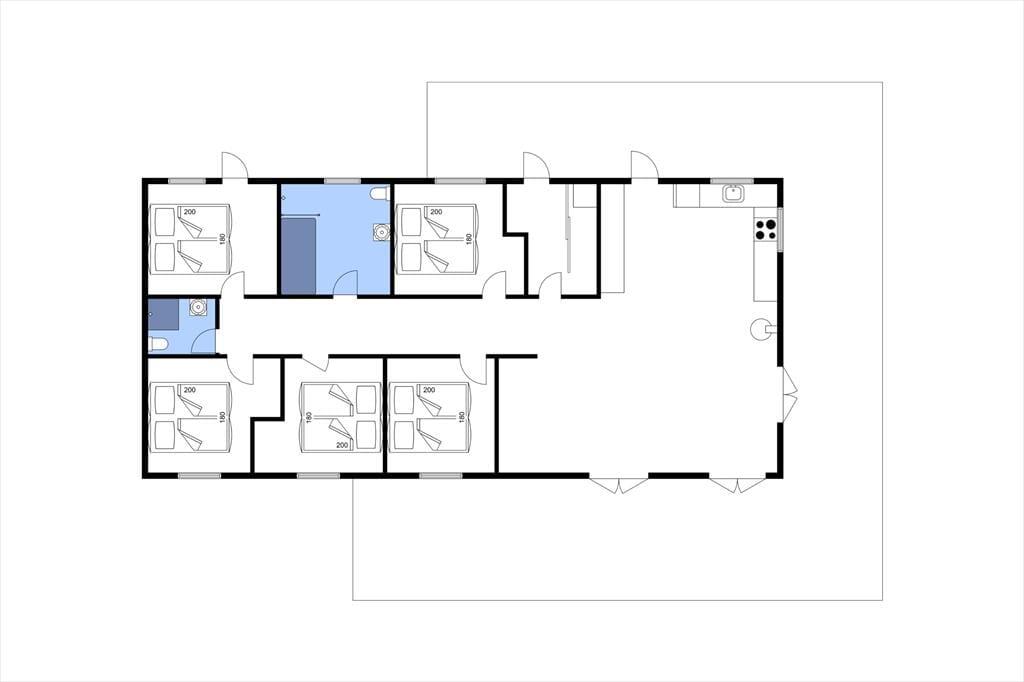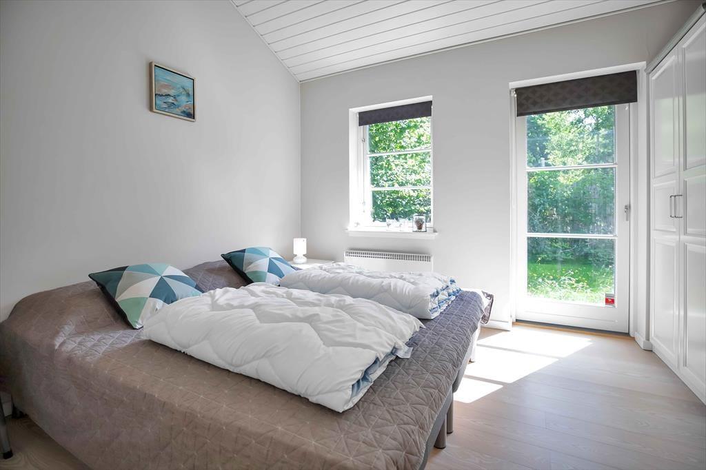 Flur mit Waschmaschine, Wärmepumpe und Zugang zu fünf große Schlafzimmer, alle mit Doppelbetten ausgestattet. Badezimmer mit Duschkabine und Bodenheizung. Noch ein großes Badezimmer mit Duschkabine, Bodenheizung und Badewanne. Wohnraum mit Zugang zur Holzterrasse mit Markise. Räumliche offene Küche mit Essbereich und Holzofen sowie Ausgang zu der Terrasse nach Osten, Süden und Westen. Bei der nördlichen Giebelwand finden Sie eine Außendusche.