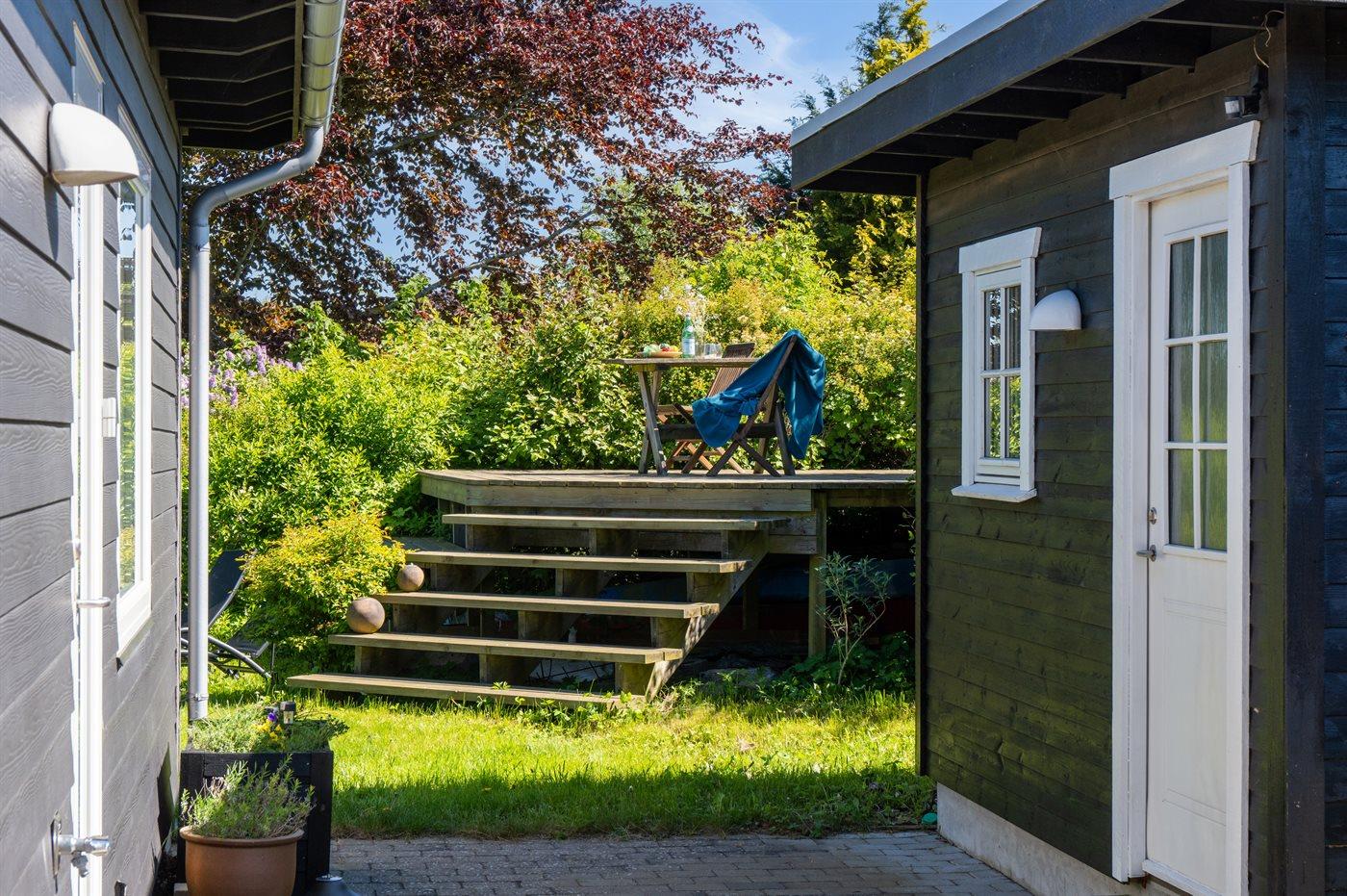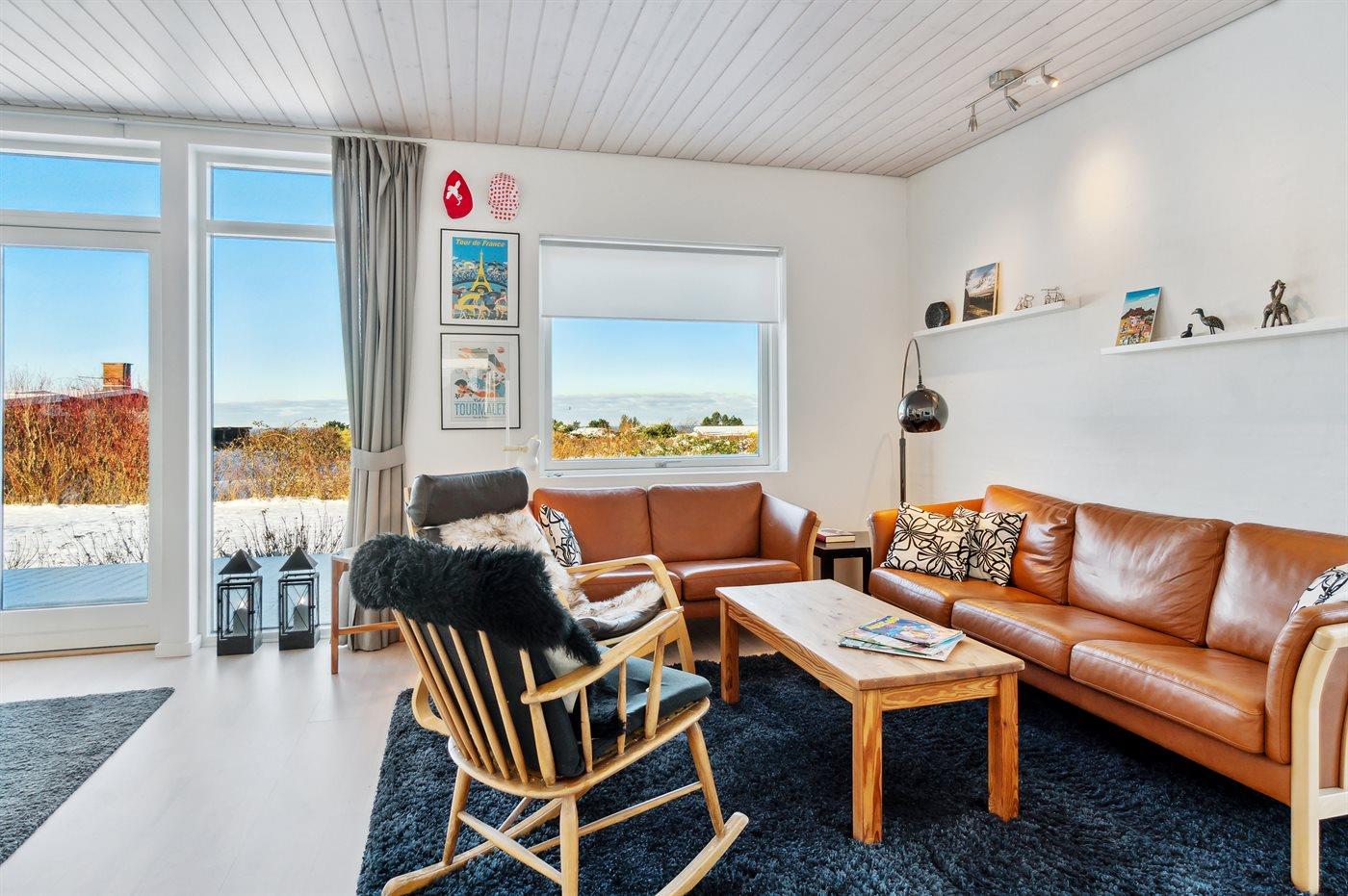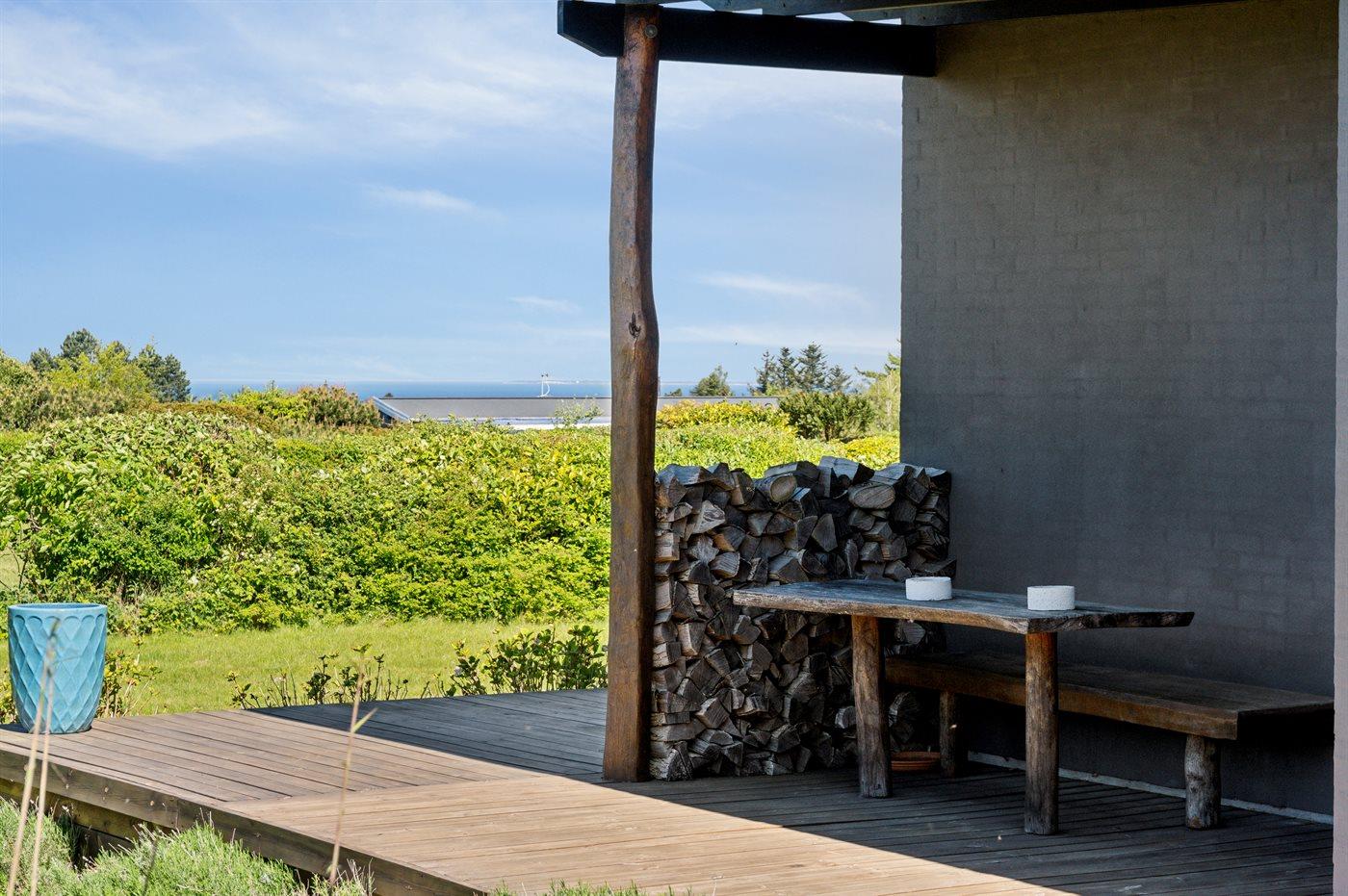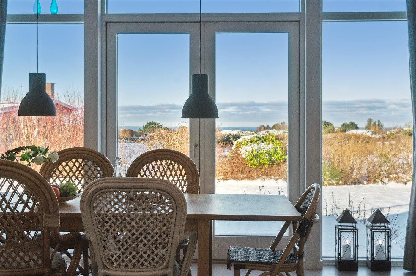 Von der gemütlichen und hellen Küche mit Essbereich und vom Wohnzimmer, mit Dachfenstern und Kaminofen, gelangt man auf die nordwestlich ausgerichtete und teilweise überdachte Holzterrasse. Auf der gegenüberliegenden Seite des Hauses befindet sich eine schöne, vor dem Wind geschützte Terrasse, und in der einen Ecke des Grundstücks liegt eine erhöhte Holzterrasse mit herrlichem Blick auf die Umgebung und auf das Meer.