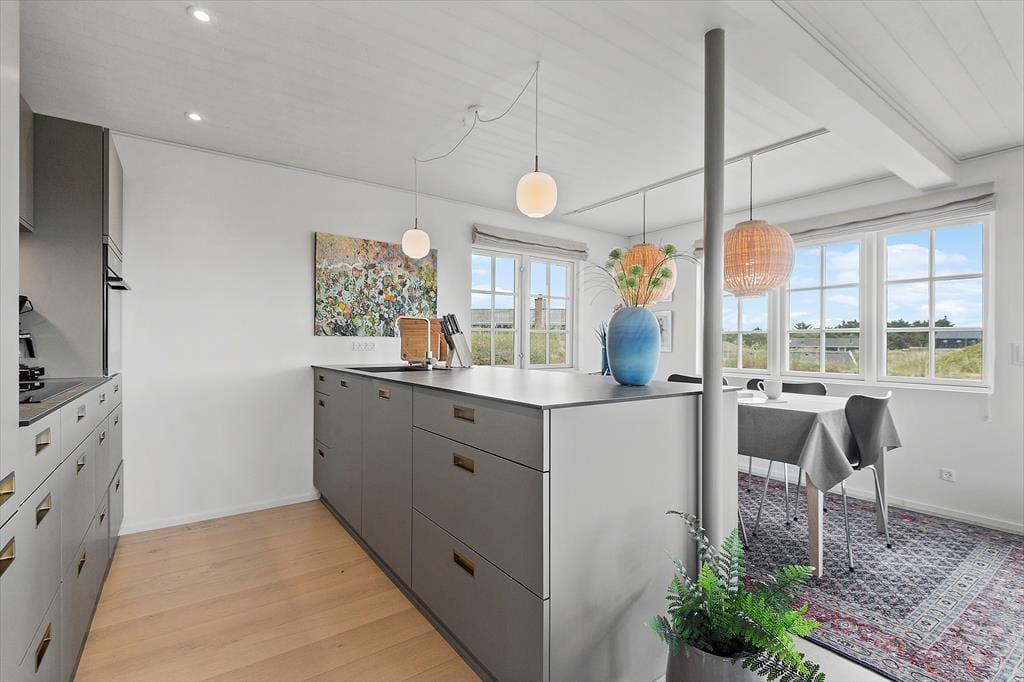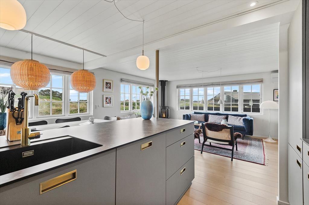 Das reetgedeckte Holzhaus thront hoch auf dem Dünengrundstück und bietet nicht nur herrliches Licht durch seine Sprossenfenster, sondern auch einen atemberaubenden Blick auf die malerische Landschaft der Ferienhaussiedlung. Von der oberen Etage aus genießt du sogar Meerblick von den beiden Schlafzimmern und vom Durchgangsraum, der mit gemütlichen Tagesbetten ausgestattet ist und zu ausgedehnten Lesestunden oder einem entspannten Mittagsschlaf einlädt. Die Einrichtung wurde nach der vollständigen Renovierung des Hauses in den Jahren 2020-2022 mit viel Liebe zum Detail gestaltet. Der Charakter des Hauses und der klassische Baustil aus dem Jahr 1966 sind erhalten geblieben, aber das Innere wurde modernisiert - von einem luxuriösen Whirlpoolbad über einen neuen Holzofen im Wohnzimmer bis hin zur eleganten Küche, die deinen und den Ferienaufenthalt deiner Familie bereichert.