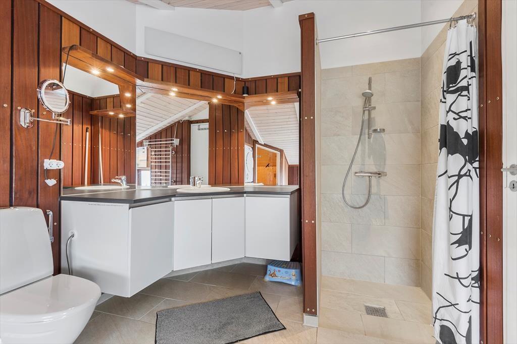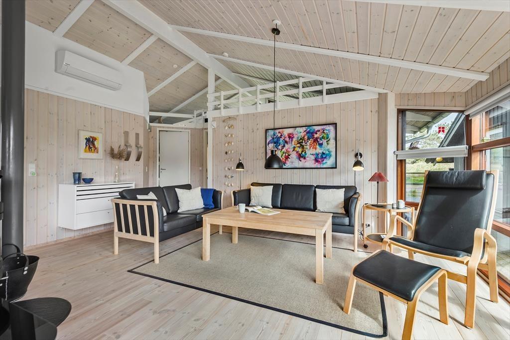 Der Whirlpool und die Sauna sind Teil des größten der beiden Badezimmer im Haus – und genau dieses Wellness-Badezimmer hat einen wunderschönen maritimen Look mit dunklen Mahagonipaneelen. Das ist nur eines der durchdachten Designelemente, die die hohe Qualität zeigen, die das ganze Haus ausstrahlt.Ein weiteres herausragendes Merkmal ist die Küche. Wenn du gerne kochst, wirst du dich freuen, kleine und große Mahlzeiten in dieser gut organisierten Küche zuzubereiten.. Wenn du am liebsten in einem gemütlichen Sofa mit deiner Strickarbeit oder einem spannenden Buch sitzt, kannst du es dir im Wohnzimmer gemütlich machen, in der Nähe des Holzofens und mit Blick auf das hügelige Naturgrundstück. Wenn du lange genug ruhig sitzt, könnten sogar die Fasane der Gegend auf der Terrasse vorbeischauen, denn auch sie lieben die malerische Umgebung von Rindby.