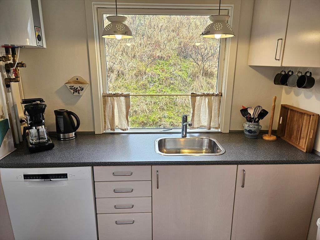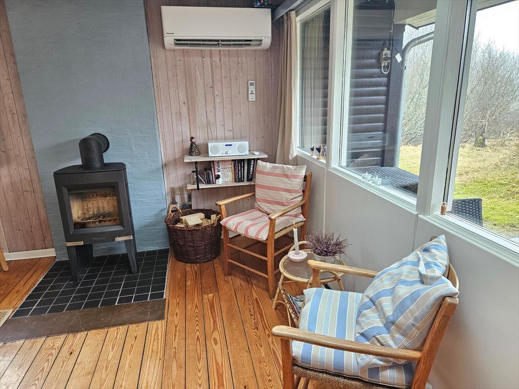 Wenn ihr das Haus betretet, werdet ihr von einer warmen und einladenden Atmosphäre empfangen. Die hellen Holzpaneele unterstreichen den klassischen Ferienhausstil. Durch die großen Fenster und Oberlichter strömt Tageslicht in den Wohnbereich und sorgt für ein großzügiges Raumgefühl. Das Wohnzimmer ist mit weichen Möbeln, gemütlichen Sesseln und einem knisternden Kamin ausgestattet, der an kühlen Abenden für eine perfekte Wohlfühlstimmung sorgt. Der Essbereich ist offen mit dem Wohnzimmer verbunden, sodass ihr eure Mahlzeiten gemeinsam am gemütlichen Esstisch genießen könnt. Die Küche ist funktional ausgestattet mit Spülmaschine und bietet alles, was ihr für die Zubereitung eurer Ferienmahlzeiten benötigt – hier könnt ihr euren Morgenkaffee mit Blick auf die Dünen durch das große Fenster genießen. Die zwei Schlafzimmer sind gut eingerichtet mit bequemen Betten und ausreichend Stauraum, während das Badezimmer modern und praktisch mit einer Dusche ausgestattet ist.