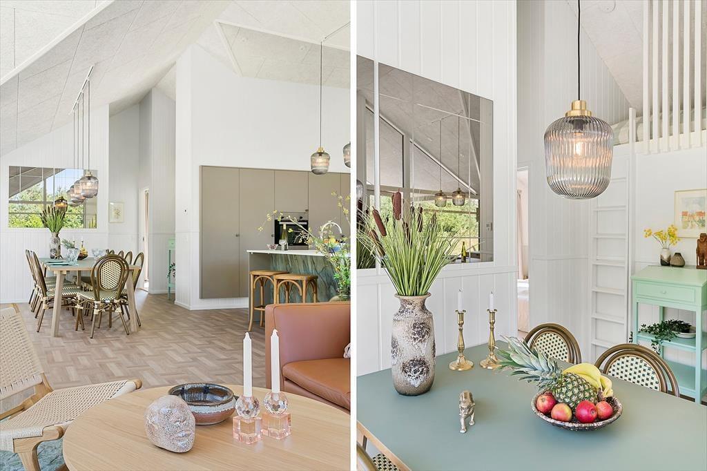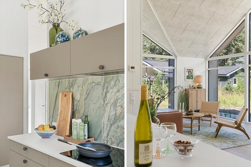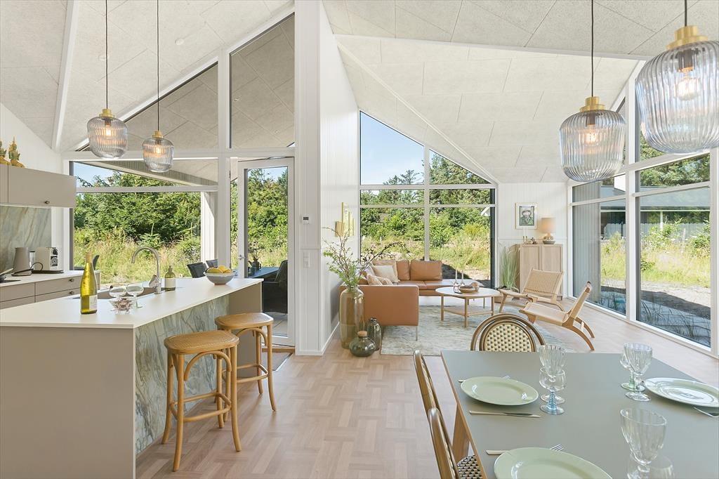 Treten Sie in das helle Wohnzimmer ein, wo große Fenster Ihnen einen Blick auf die umliegende Natur bieten. Machen Sie es sich auf den komfortablen Möbeln bequem oder spielen Sie ein Brettspiel mit der ganzen Familie am großen Esstisch. Die Küche ist modern und gut ausgestattet mit allem, was Sie zum Kochen benötigen. Der offene Grundriss macht es einfach, sich um den Esstisch zu versammeln.