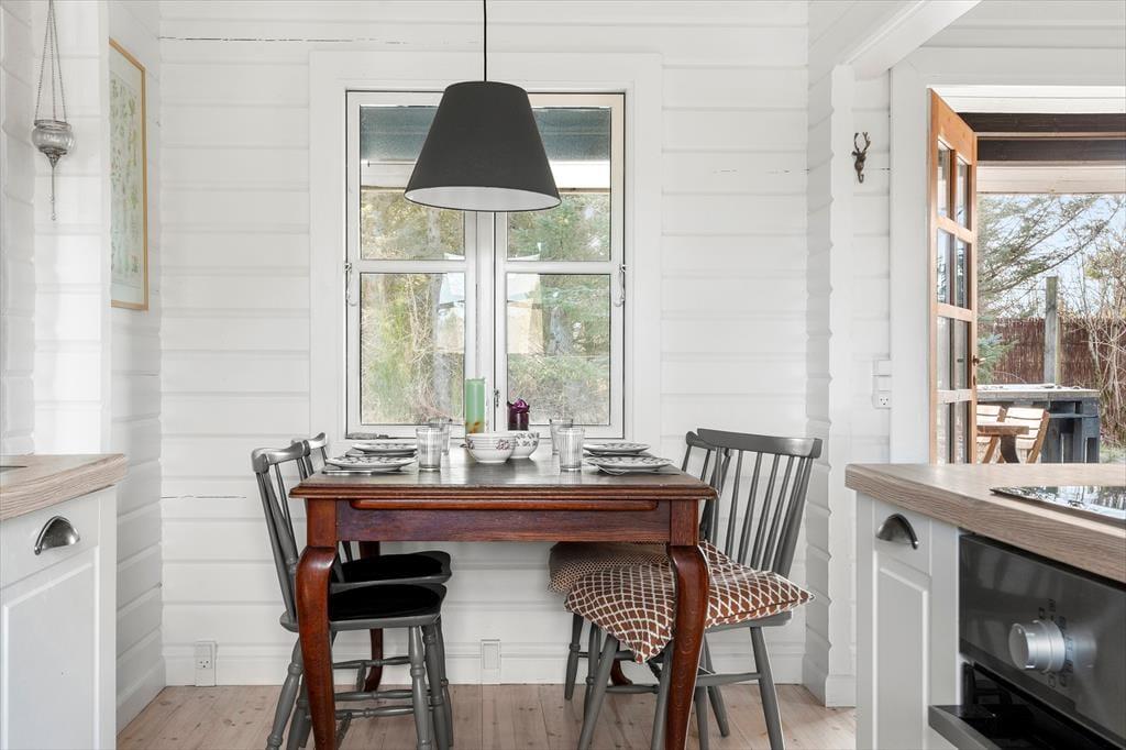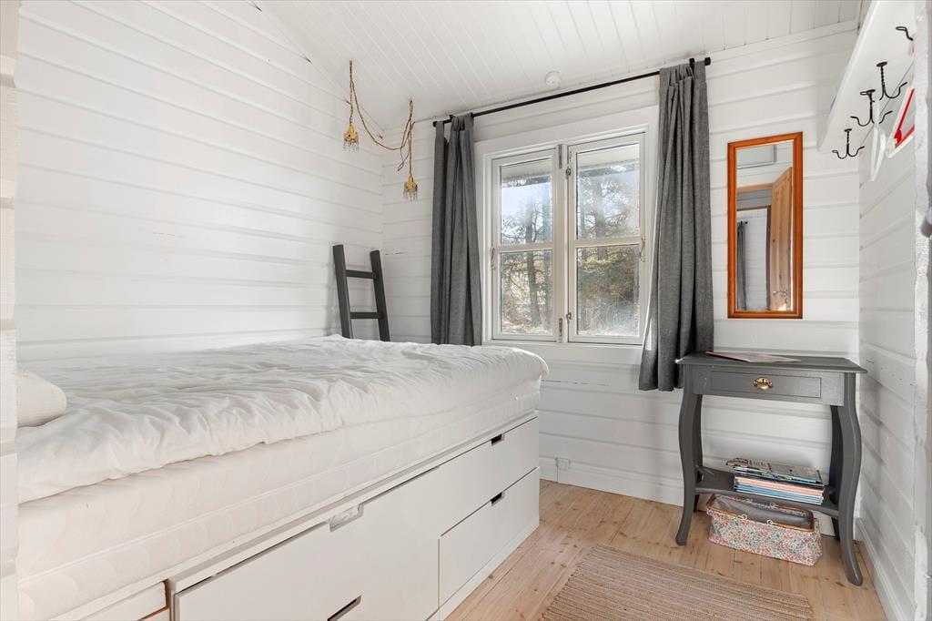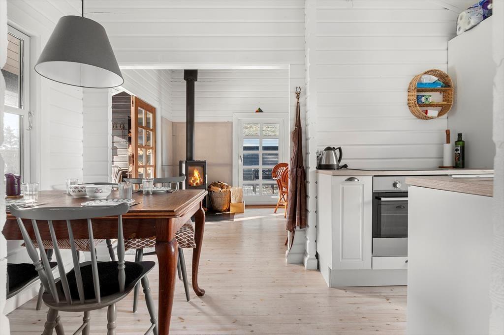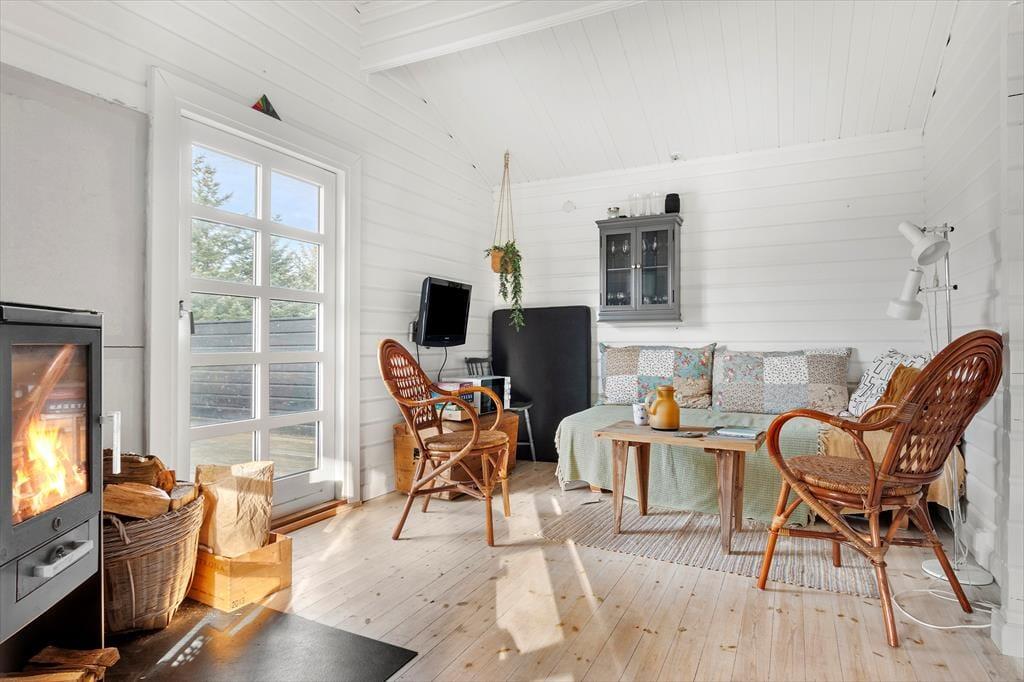 Wenn du dieses charmante Ferienhaus betrittst, wirst du von einem wunderschönen Lichteinfall begrüßt, der sofort dafür sorgt, dass der Raum offen und einladend wirkt. Das gemütliche Wohnzimmer ist der Mittelpunkt des gemeinsamen Beisammenseins, wo der Kamin die perfekte Atmosphäre für warme und hyggelige Abende bietet. Die Decke ist hoch und offen, was ein Gefühl von Raum und Freiheit vermittelt. Das Ferienhaus verfügt über zwei gute Schlafzimmer, die zum Entspannen nach einem langen Tag in der Natur einladen. Hier ist alles auf Ruhe und Idylle ausgelegt – perfekt für stille Momente und geselliges Beisammensein.
