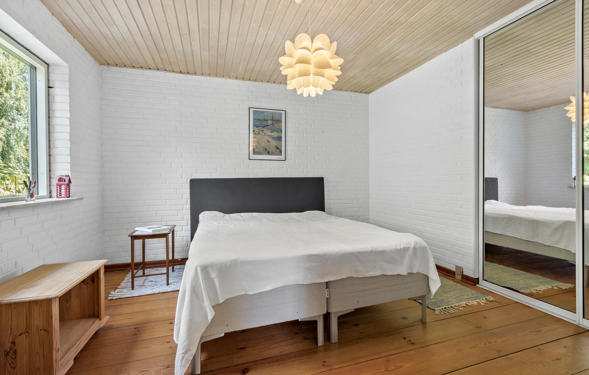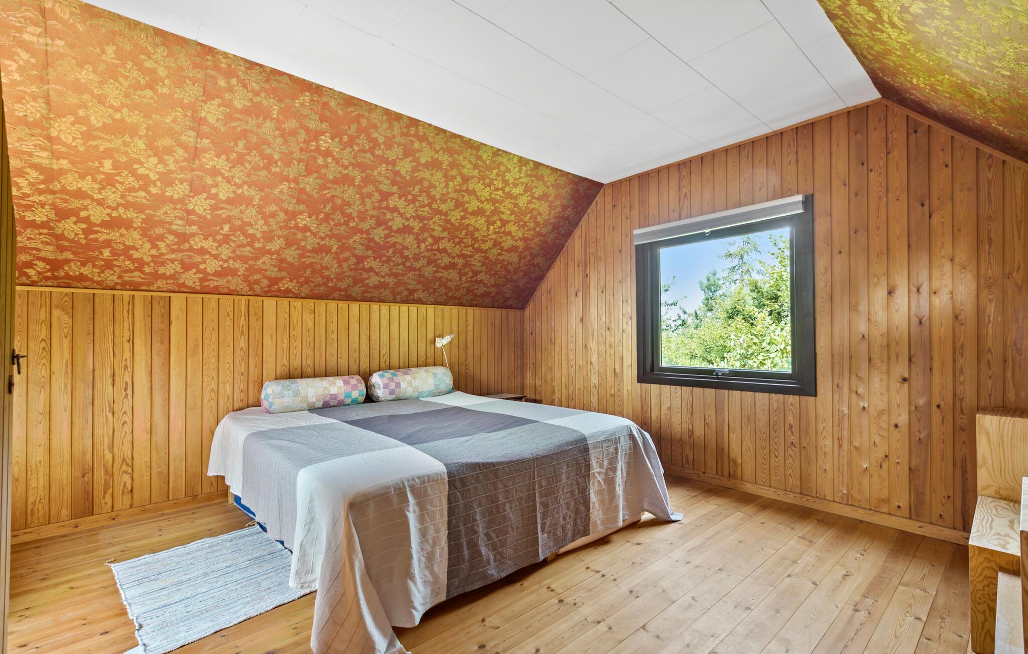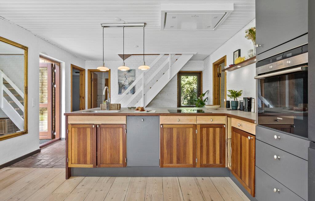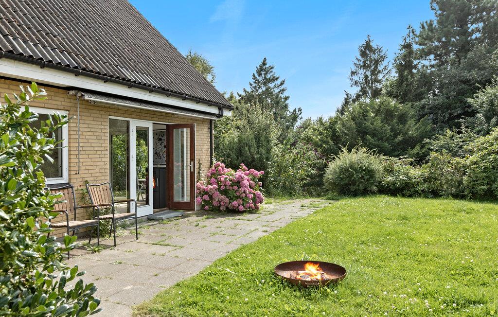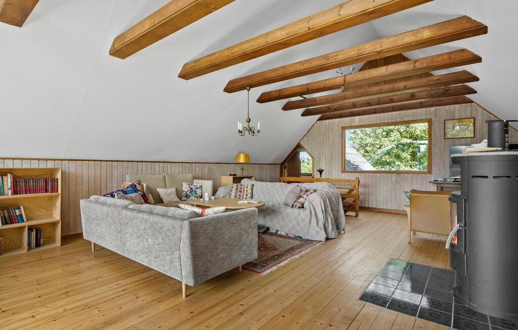 Verbringen Sie Ihren nächsten Urlaub in diesem bezaubernden Ferienhaus in Sølager und lassen Sie sich von der wunderschönen Umgebung verzaubern. Genießen Sie die sonnigen Tage auf der großzügigen Terrasse, die von Sträuchern und Bäumen umgeben ist. Lassen Sie den Blick über den gepflegten Garten schweifen, während Sie bei einer Tasse Kaffee die Ruhe der Natur genießen. Im Inneren des Hauses erwartet Sie ein großzügiges, helles Wohnzimmer mit hohen Decken und freiliegenden Holzbalken. Setzen Sie sich auf eines der gemütlichen Sofas und lesen Sie ein gutes Buch. Nutzen Sie die geräumige Küche, um köstliche Mahlzeiten zuzubereiten, und genießen Sie diese anschließend im stilvollen Essbereich oder bei gutem Wetter draußen auf der Terrasse.
