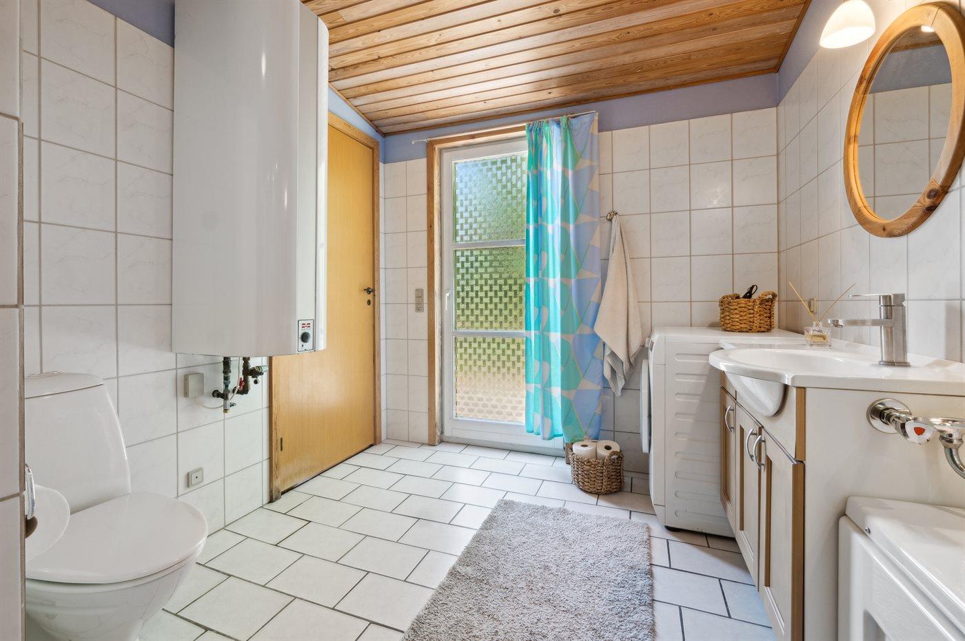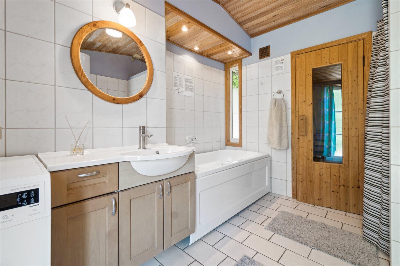 Es gibt ein Badezimmer mit Sauna und einem kleinen Whirlpool und Dusche sowie eine kleine Gästetoilette. Das Wohnzimmer ist hell und geschmackvoll eingerichtet und ist ein natürlicher Treffpunkt für die ganze Familie.
