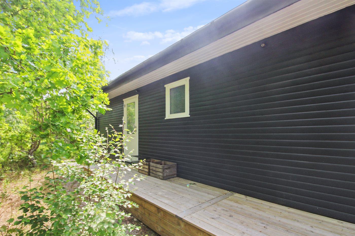 Ein schönes und gepflegtes Ferienhaus aus Holz auf einem Naturgrundstück mit Sand, Heidekraut und Kiefern sowie Lagerfeuerstelle gelegen. Große und teils überdachte Terrasse mit diversen Gartenmöbeln, Kugelgrill und Gasgrill.