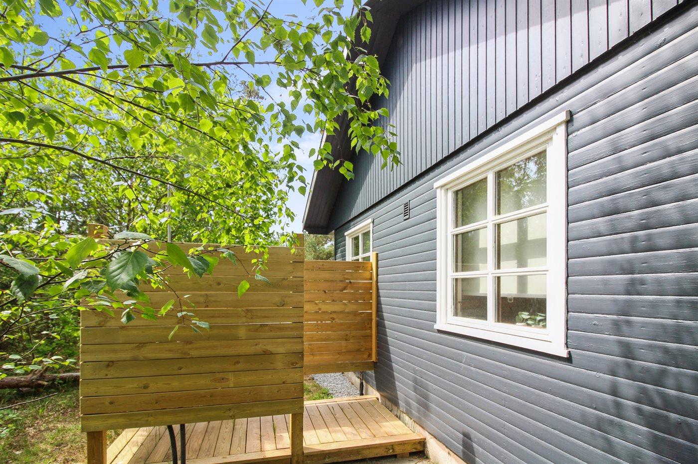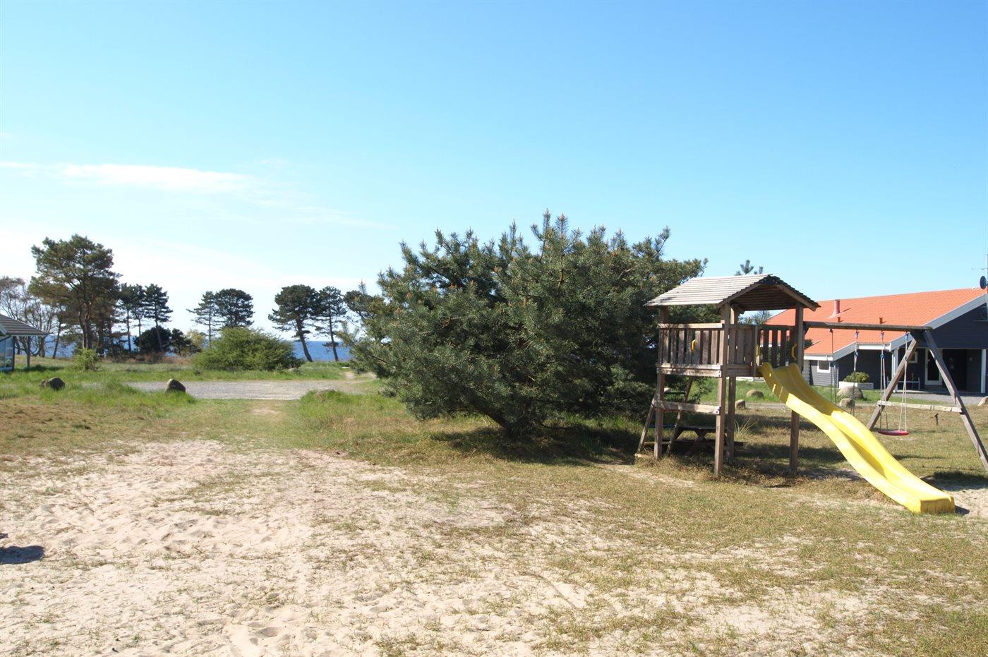Doppelparkplatz auf dem Grundstück. Außerdem steht eine Außendusche zur Verfügung. Großes Gemeinschaftsgelände mit Meeresblick bei Holsterodde mit u. a. Schaukeln.
