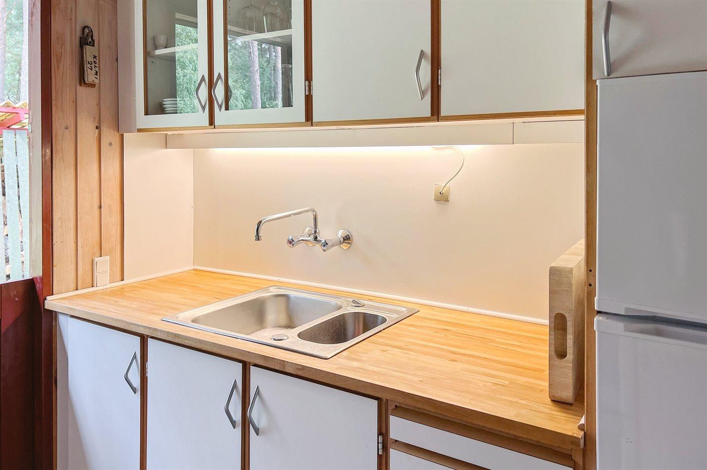 Die Küche ist mit Kühlschrank ausgestattet. Außerdem gibt es 4 Keramik-Kochfelder, Umluftofen.