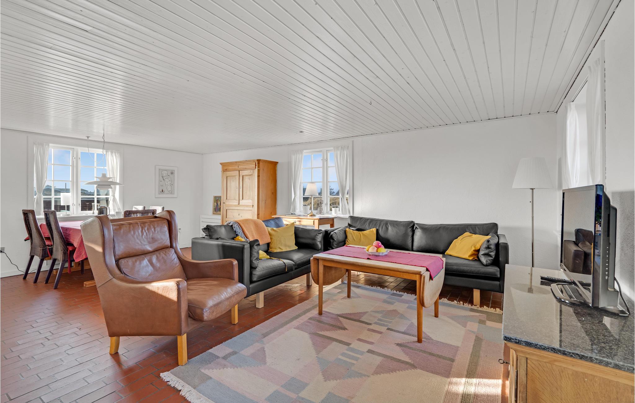 Dieses typische Fanøhaus liegt auf einem schönen Naturgrundstück und heißt Sie mit seiner gemütlichen Einrichtung und heimeligen Wohlfühlatmosphäre willkommen. Genießen Sie mit Ihrer Familie auf zwei schönen Etagen die schönen Räume, die Ihnen Erholung und Ruhe in den Nächten und Unterhaltung und Geselligkeit an den Tagen bieten. Starten Sie in den Tag, dass Sie der Familie in der großen und offenen Küche ein leckeres Frühstück zaubern und schließen Sie den Abend mit einem Filmabend, mit knisterndem Kaminfeuer, ab. Von allen Fenstern im Erdgeschoss haben Sie einen fantastischen Ausblick auf die umliegende Dünenlandschaft, dass nur von der Nordsee-Aussicht im 1. Stock gestoppt werden kann. Wenn Sie etwas mehr Platz benötigen, können Sie das kleine extra Zimmer als Büro oder Lesestube benutzen. Gehen Sie raus und genießen Sie die Sonnenstunden auf der sichtgeschützten Südterrasse und lesen ein gutes Buch.