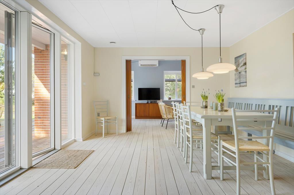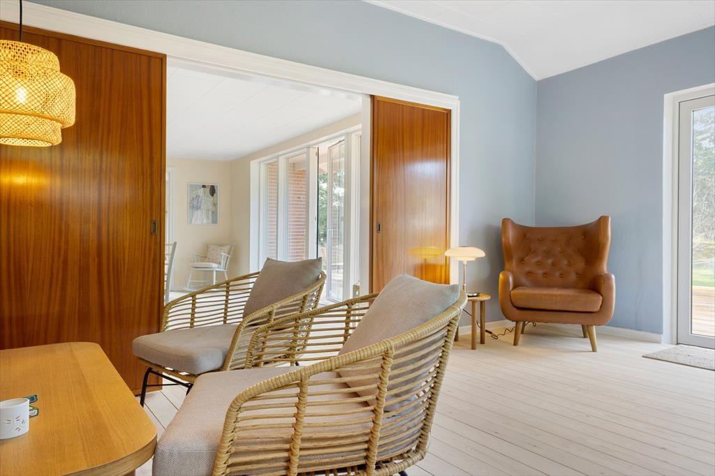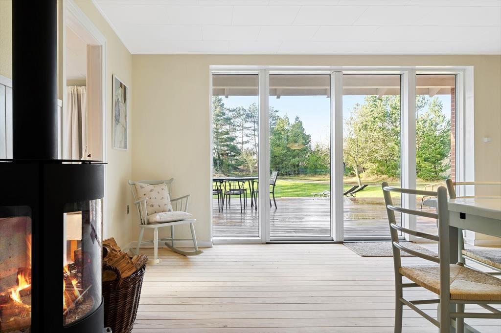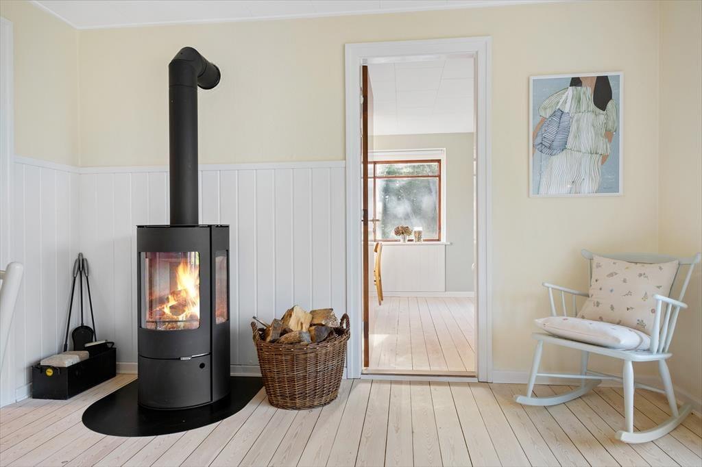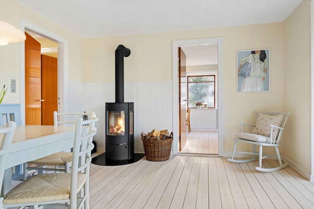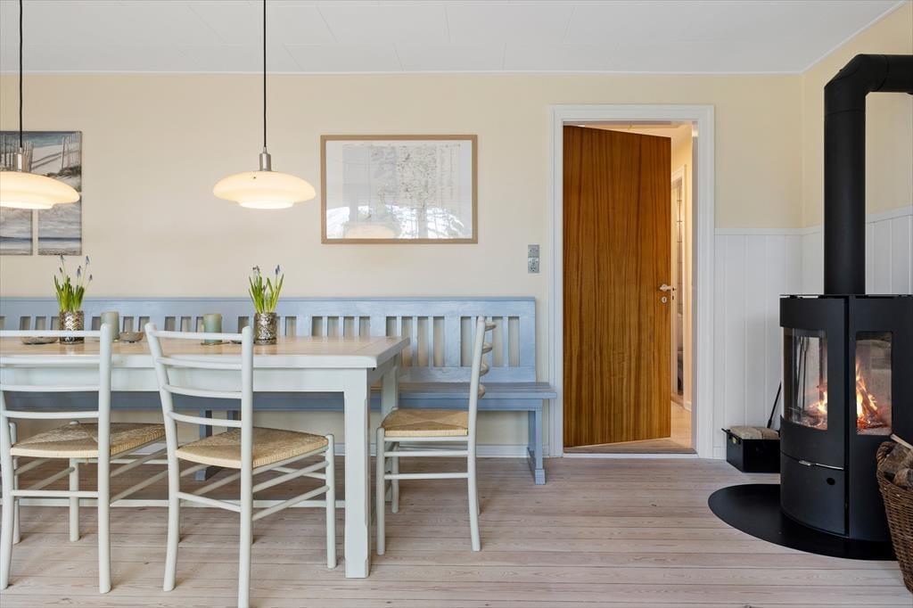 Mit dunkelbraunen Schiebetüren zwischen den beiden Wohnzimmern und Einbauschränken in einem der drei Schlafzimmer ist es gelungen, einen Teil des 1960er-Jahre-Charmes des Hauses zu erhalten – und im Zusammenhang mit der Modernisierung der Räume ist es ebenfalls geglückt, einen hellen und freundlichen Einrichtungsstil mit schönen Farben an den Wänden und klassischen Möbeln zu schaffen. Alles in allem lässt es sich in dem Haus wunderbar wohnen, und wenn du Entspannung fernab vom Alltag suchst, bist du in diesem Ferienhaus genau richtig. Ein schönes Detail ist der Brennofen im Esszimmer: Stell dir vor, du sitzt hier auf der Bank in der gemütlichen Wärme mit Blick auf die Natur und genießt eine köstliche Mahlzeit zusammen mit der Familie.