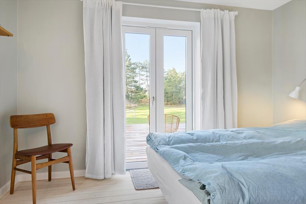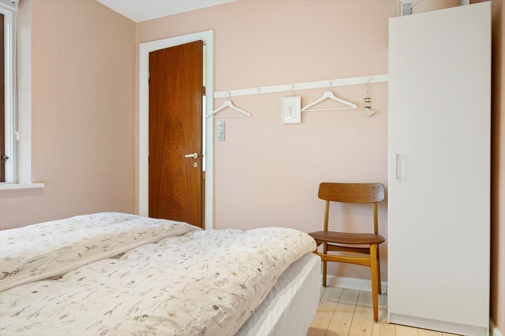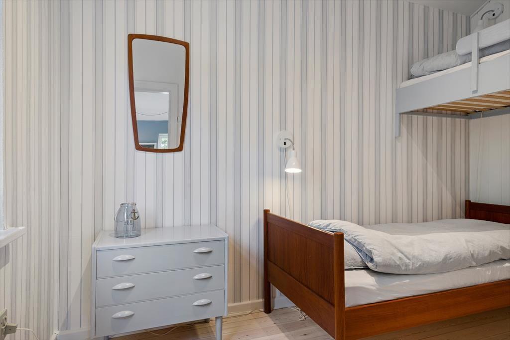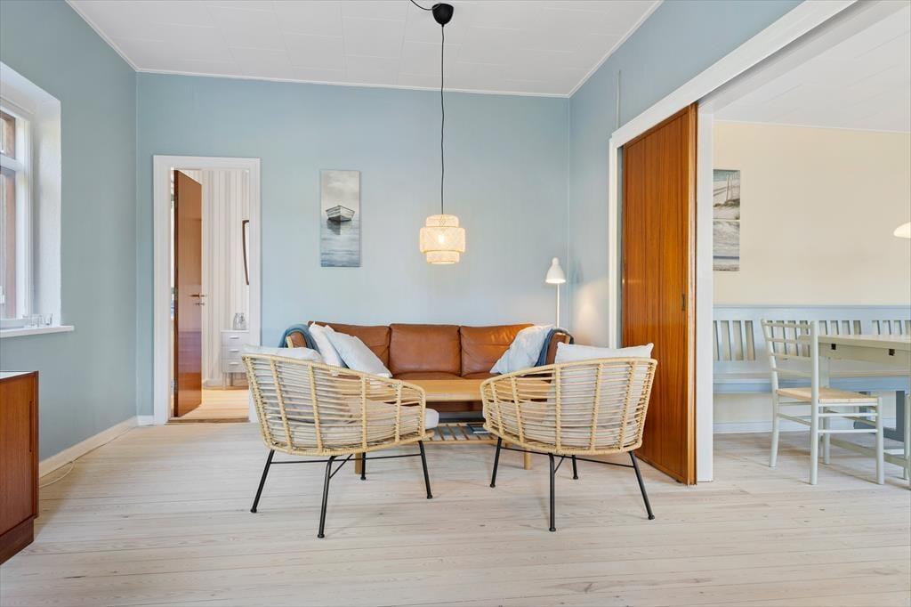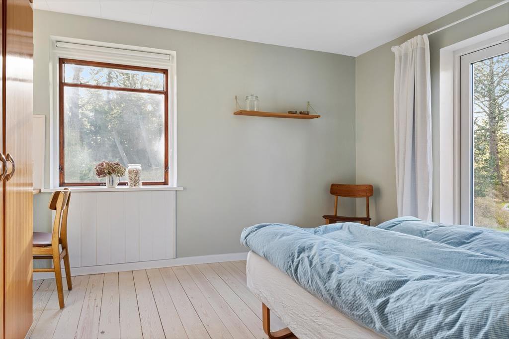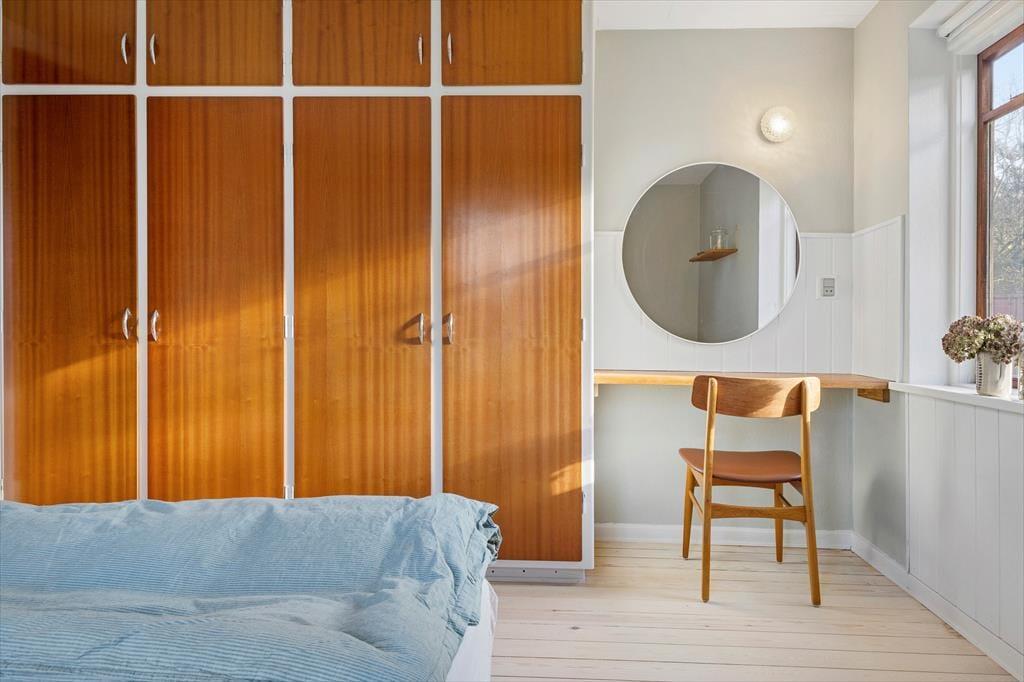 Mit dunkelbraunen Schiebetüren zwischen den beiden Wohnzimmern und Einbauschränken in einem der drei Schlafzimmer ist es gelungen, einen Teil des 1960er-Jahre-Charmes des Hauses zu erhalten – und im Zusammenhang mit der Modernisierung der Räume ist es ebenfalls geglückt, einen hellen und freundlichen Einrichtungsstil mit schönen Farben an den Wänden und klassischen Möbeln zu schaffen. Alles in allem lässt es sich in dem Haus wunderbar wohnen, und wenn du Entspannung fernab vom Alltag suchst, bist du in diesem Ferienhaus genau richtig. Ein schönes Detail ist der Brennofen im Esszimmer: Stell dir vor, du sitzt hier auf der Bank in der gemütlichen Wärme mit Blick auf die Natur und genießt eine köstliche Mahlzeit zusammen mit der Familie.