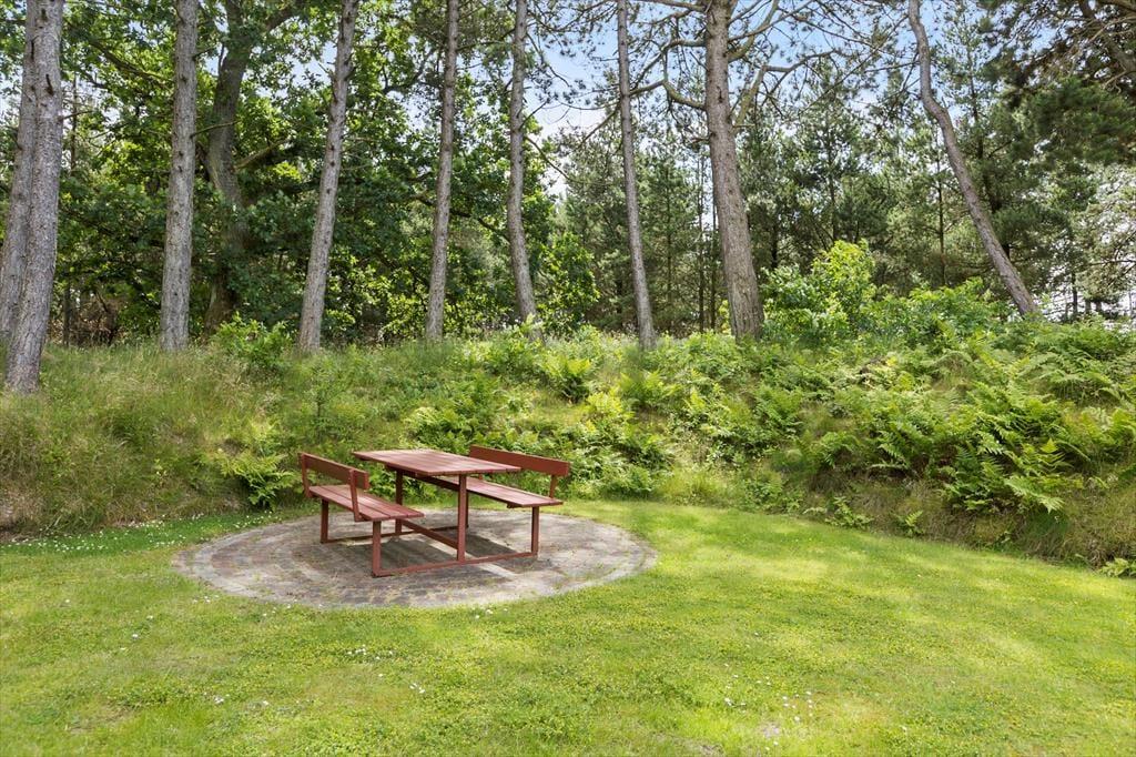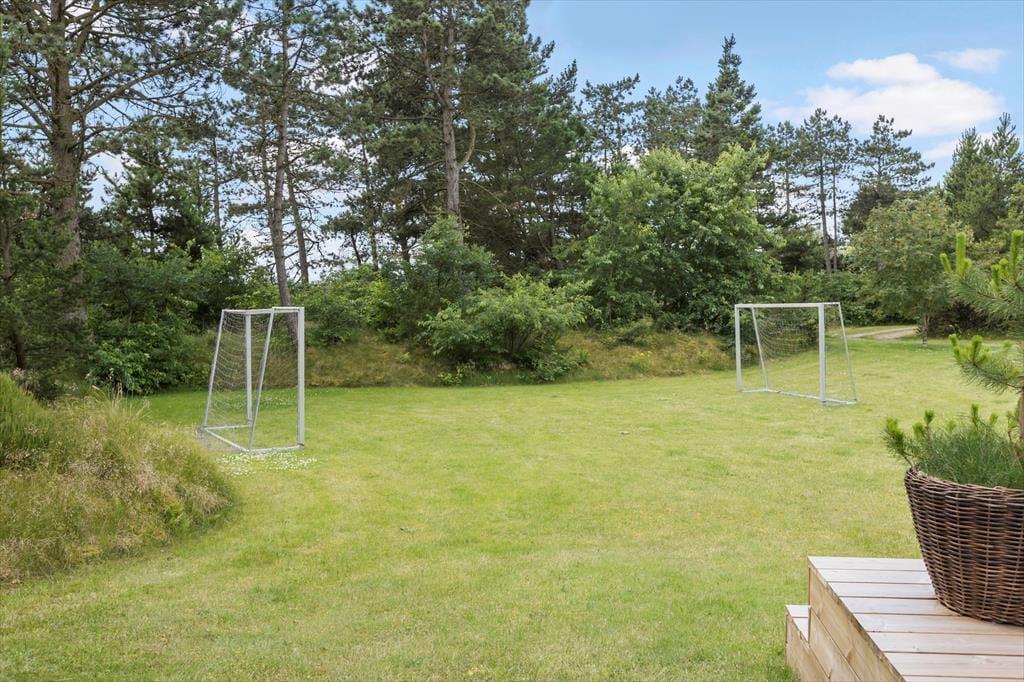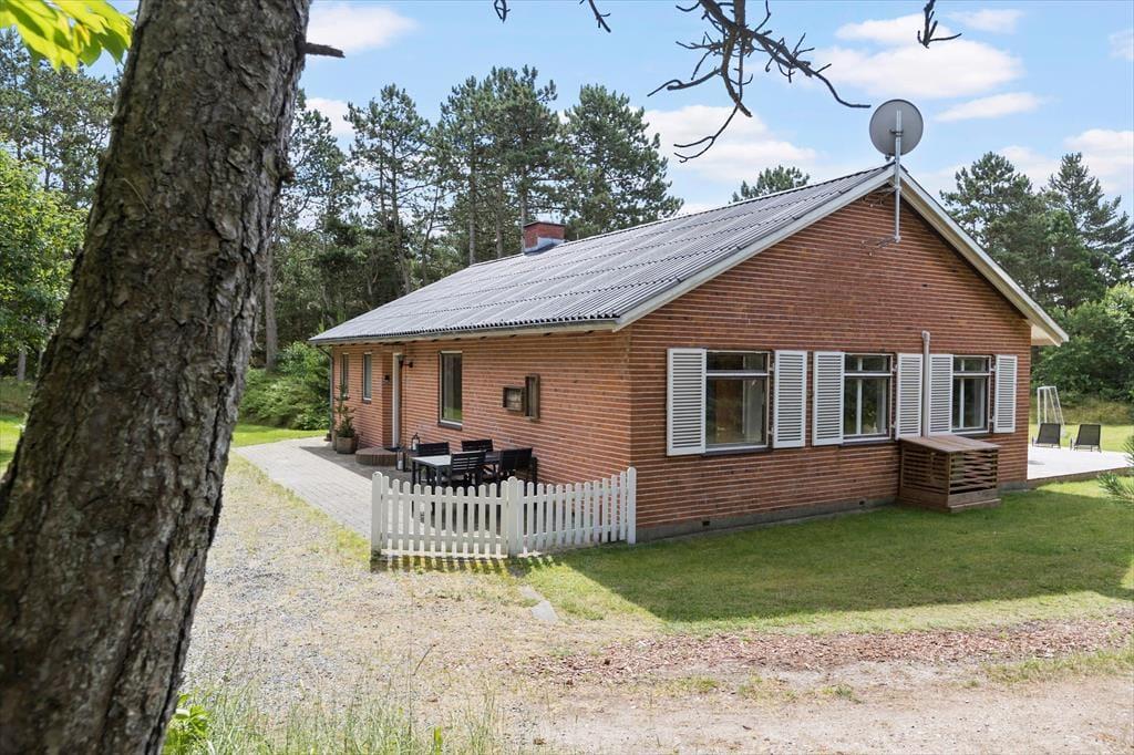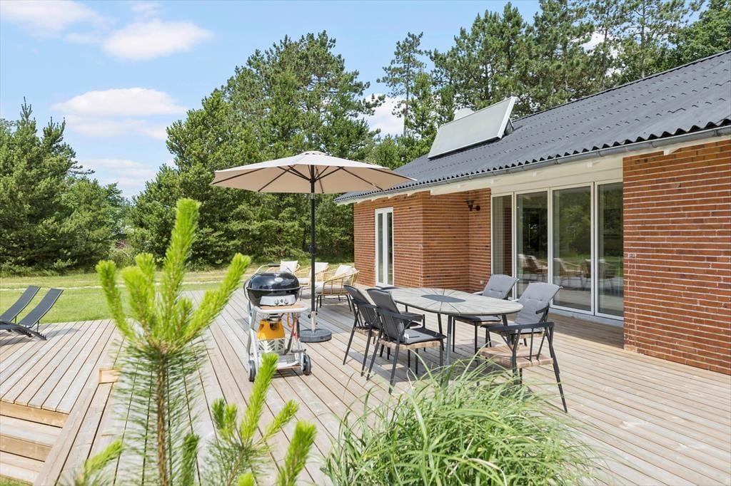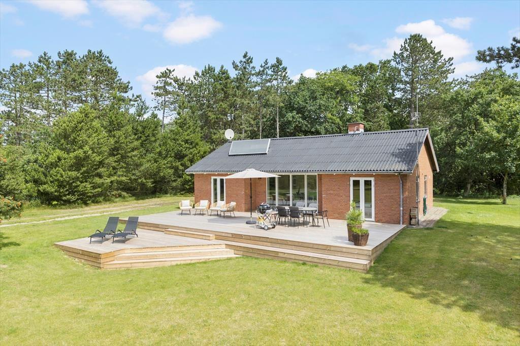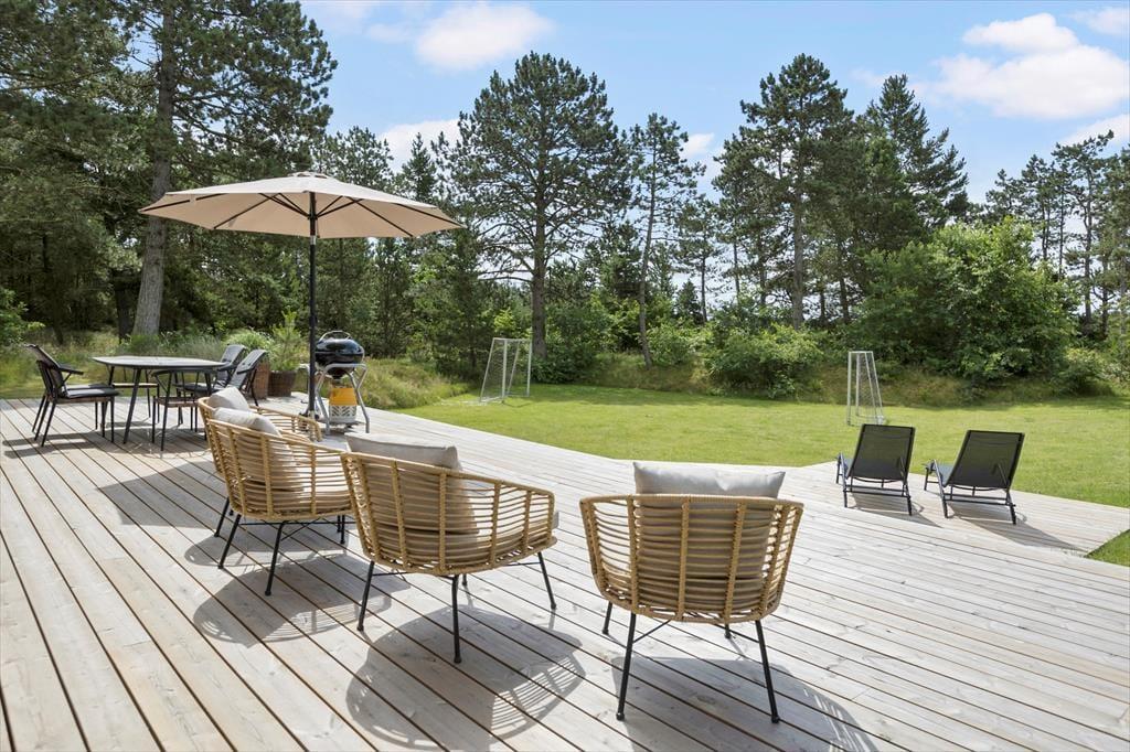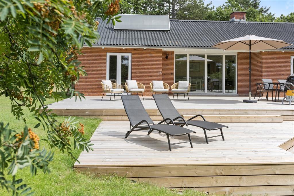 Von beiden Wohnzimmern und dem einem Schlafzimmer aus gelangt man direkt auf eine nach Südwesten ausgerichtete Holzterrasse, sodass man keine einzige Sonnenstunde verpasst, wenn man lieber draußen sitzen möchten. Die Terrasse ist groß und in zwei Ebenen unterteilt. In der Nähe der hohen Bäume des Naturgrundstücks finden Sie eine weitere schöne Terrasse, auf der es ebenfalls sehr gemütlich ist. Die große, gepflegte Rasenfläche lädt kleine und große Urlauber zum Ballspielen und Toben ein, und das alles in ruhiger und landschaftlich reizvoller Umgebung am Ende der geschlossenen Nebenstraße.