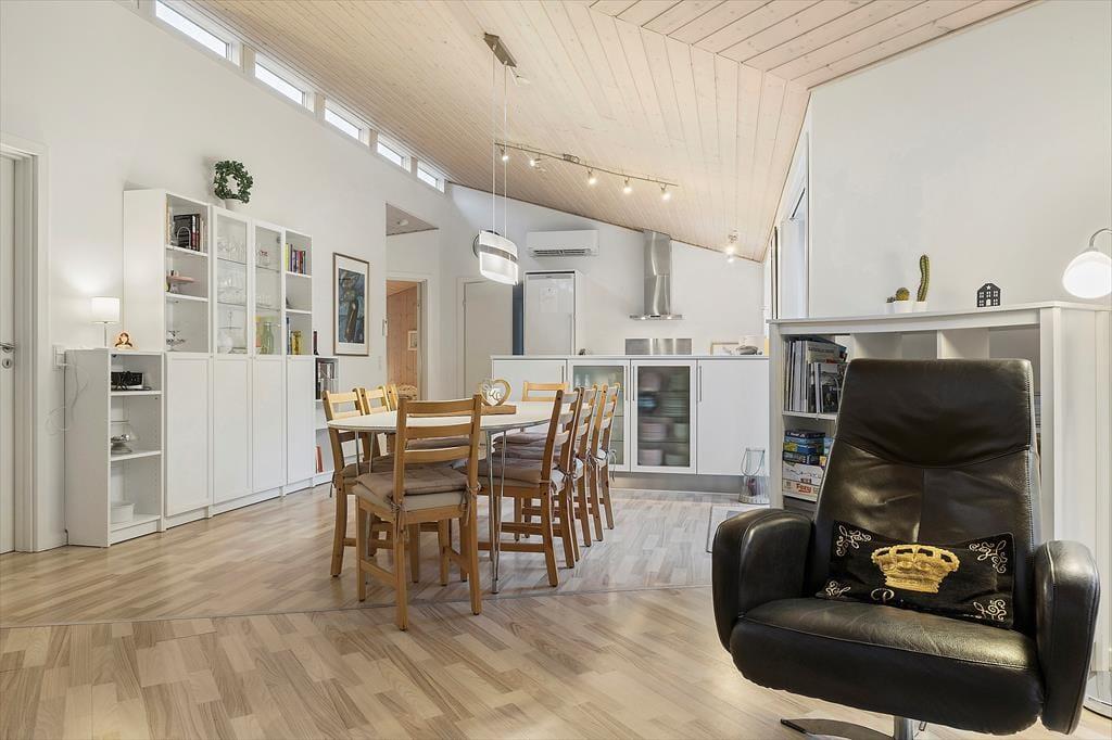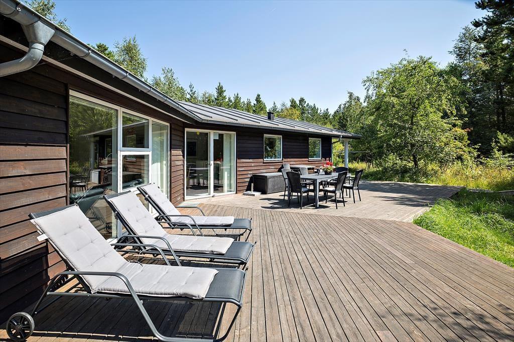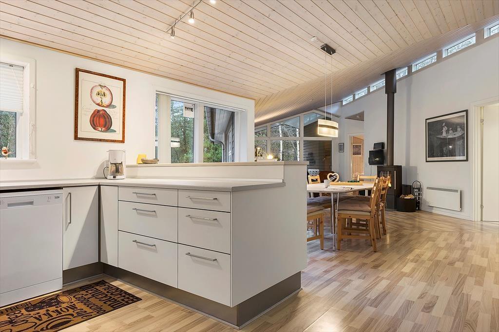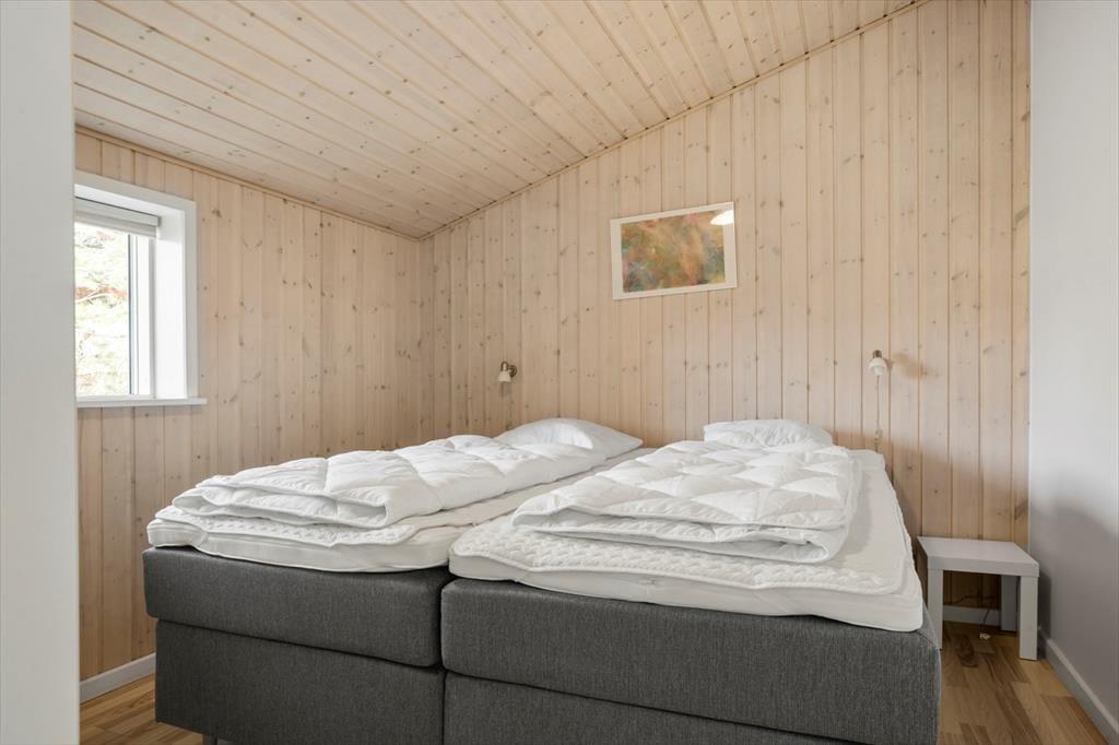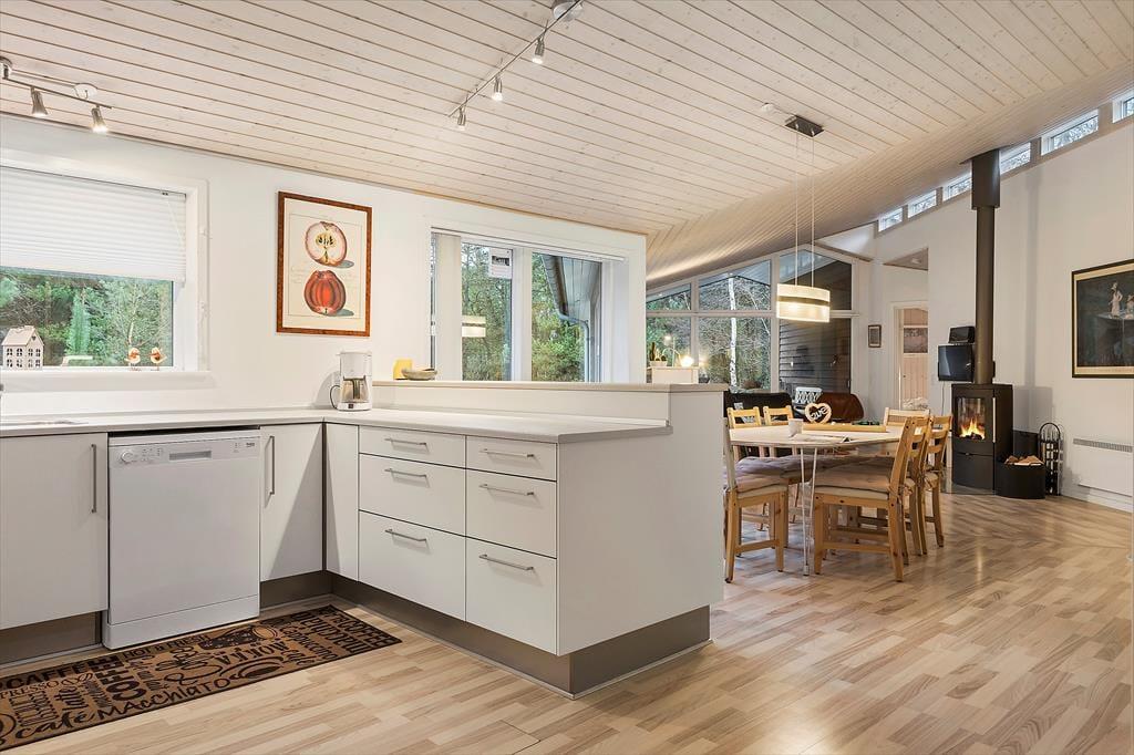 In dem im Jahr 2009 erbauten Sommerhaus kannst du dich auf 130 m² ausbreiten; der Innenbereich ist hell und einladend. Der Grundriss bietet zwei Badezimmer und vier Schlafzimmer, wobei letztere alle mit bequemen Doppelbetten und Kleiderschränken ausgestattet sind, sodass sich alle auf einen erholsamen Schlaf freuen können. Eines der Badezimmer hat sogar eine Badewanne und eine Sauna, während im Eingangsbereich auf praktische Lösungen geachtet wurde. Hier gibt es eine Waschmaschine und einen Wäschetrockner sowie viel Platz für Schuhe und Jacken. Die Küche und das schöne große Wohnzimmer stehen in einer offenen Verbindung, in dem du alle zusammenkommen kannst, egal, ob ihr kocht, Brettspiele am Esstisch spielt oder auf dem Sofa mit deiner Lieblingsserie im Fernsehen entspannt und das Feuer im Holzofen genießt.