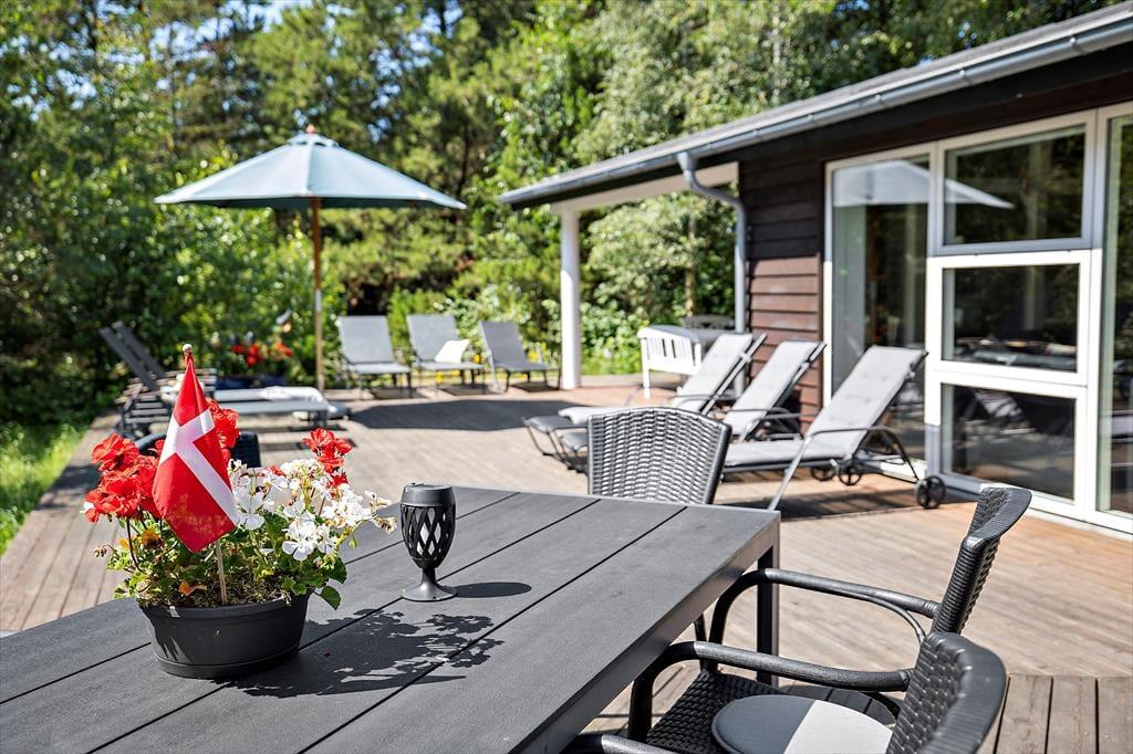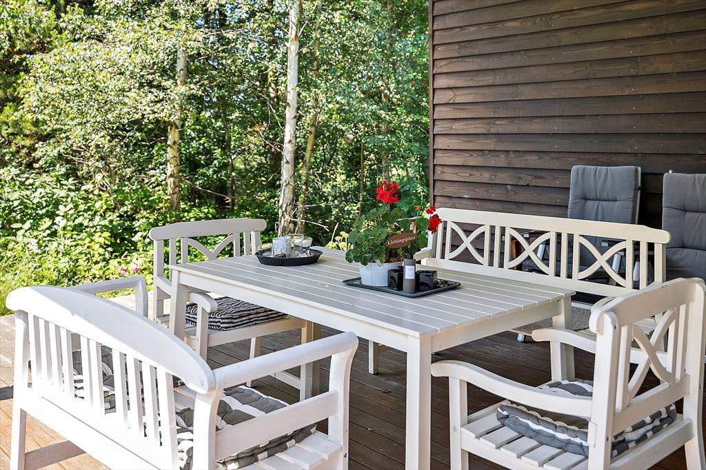 Südlich des Sommerhauses befindet sich eine große, offene Terrasse, auf der du wunderbar sitzen, sonnenbaden, grillen und den Blick auf die grünen Bäume des Naturgrundstücks genießen kannst. Es gibt auch einen überdachten Bereich für den Fall, dass ein Schauer kommt und du nicht ganz hineingehen möchtest. Für die Kinder steht ein kleiner Sandkasten bereit, und wenn du mit einem Elektroauto anreist, besteht die Möglichkeit, dieses aufzuladen.