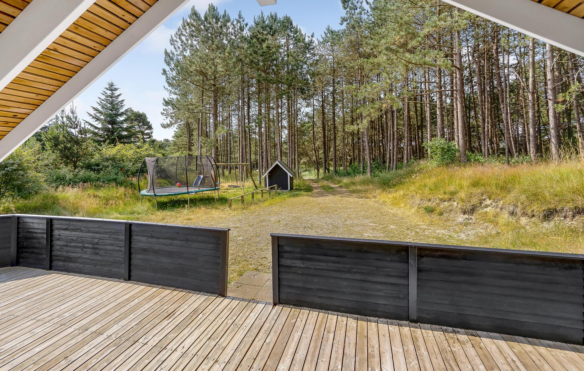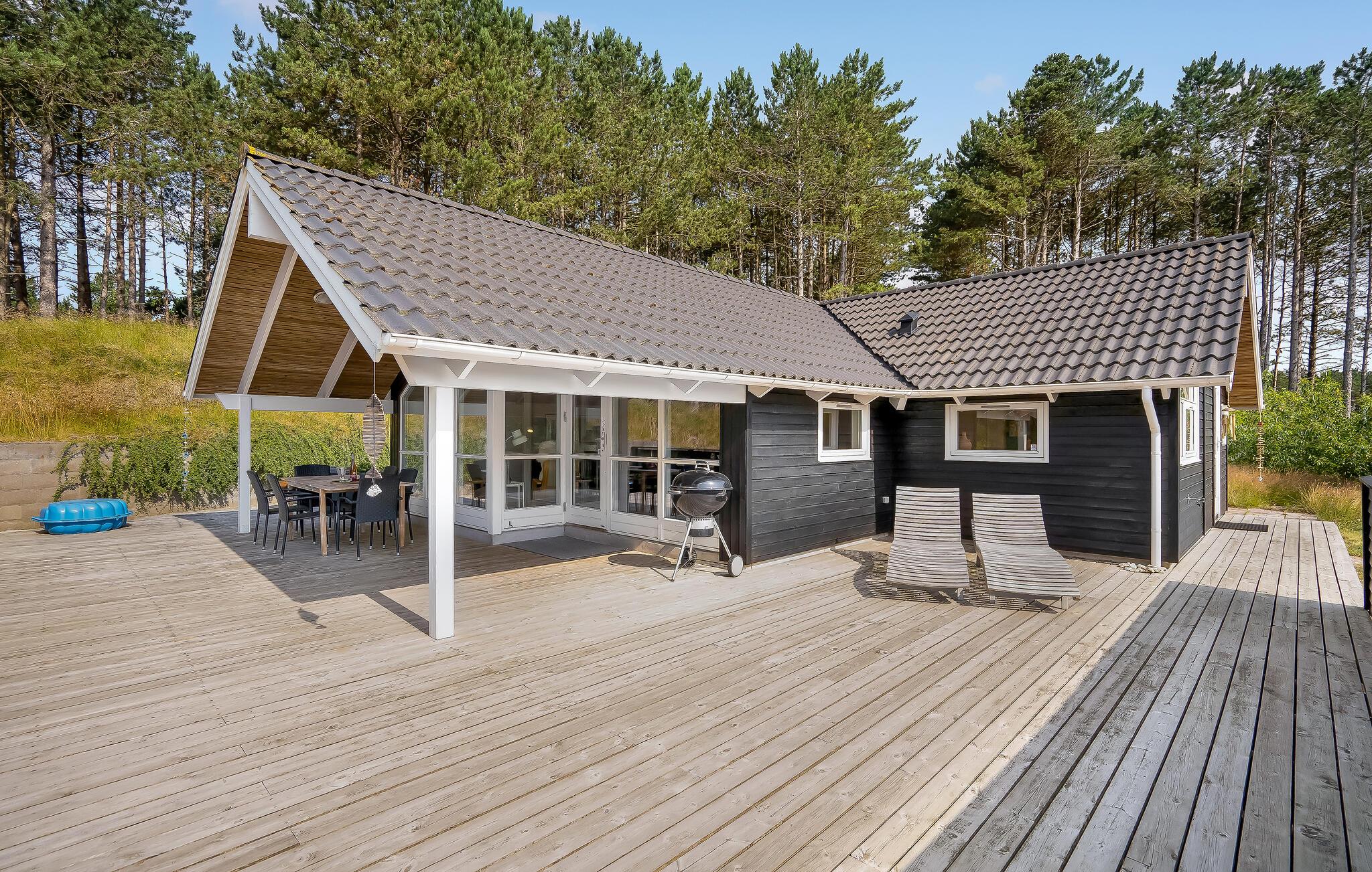 Ein schönes und gut ausgestattetes Ferienhaus, das sich an einem Waldgebiet befindet, das Schutz bietet, wenn der Wind kräftiger weht. Der zentrale Küchen- und Essbereich wird automatisch zu Ihrem Treffpunkt, wenn Sie sich auf die Abenteuer von morgen vorbereiten, Spiele spielen, köstliche Mahlzeiten zubereiten und nicht zuletzt vor dem gemütlichen Kaminofen sitzen. Das Haus enthält schöne Schlafzimmer und zwei Badezimmer, eines davon mit Whirlpool, Dampfkabine und Sauna. Die schöne Terrasse erstreckt sich an drei Seiten des Hauses, und vom Wohnzimmer aus betreten Sie den überdachten Teil, wo Sie bis weit in den Abend hinein sitzen können. Der Sønderstrand ist an manchen Stellen bis zu vier Kilometer breit und ein großer Spielplatz für Jung und Alt, auf dem auch sowohl Kite-Buggys erlaubt sind.
