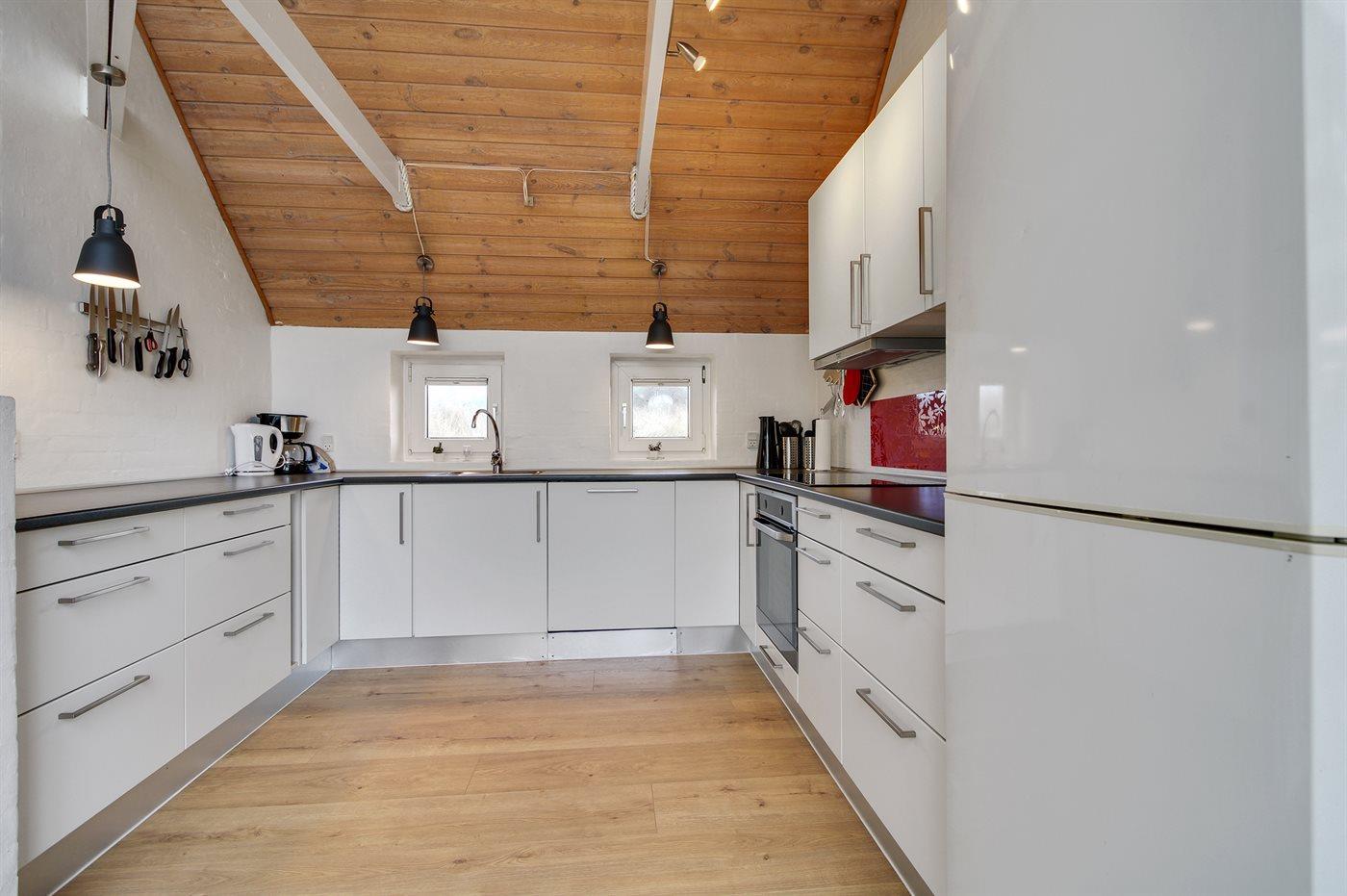 Die Küche ist mit Kühlschrank ausgestattet. Außerdem gibt es 4 Induktions-Kochzonen, Umluftofen, Mikrowelle sowie Geschirrspüler.