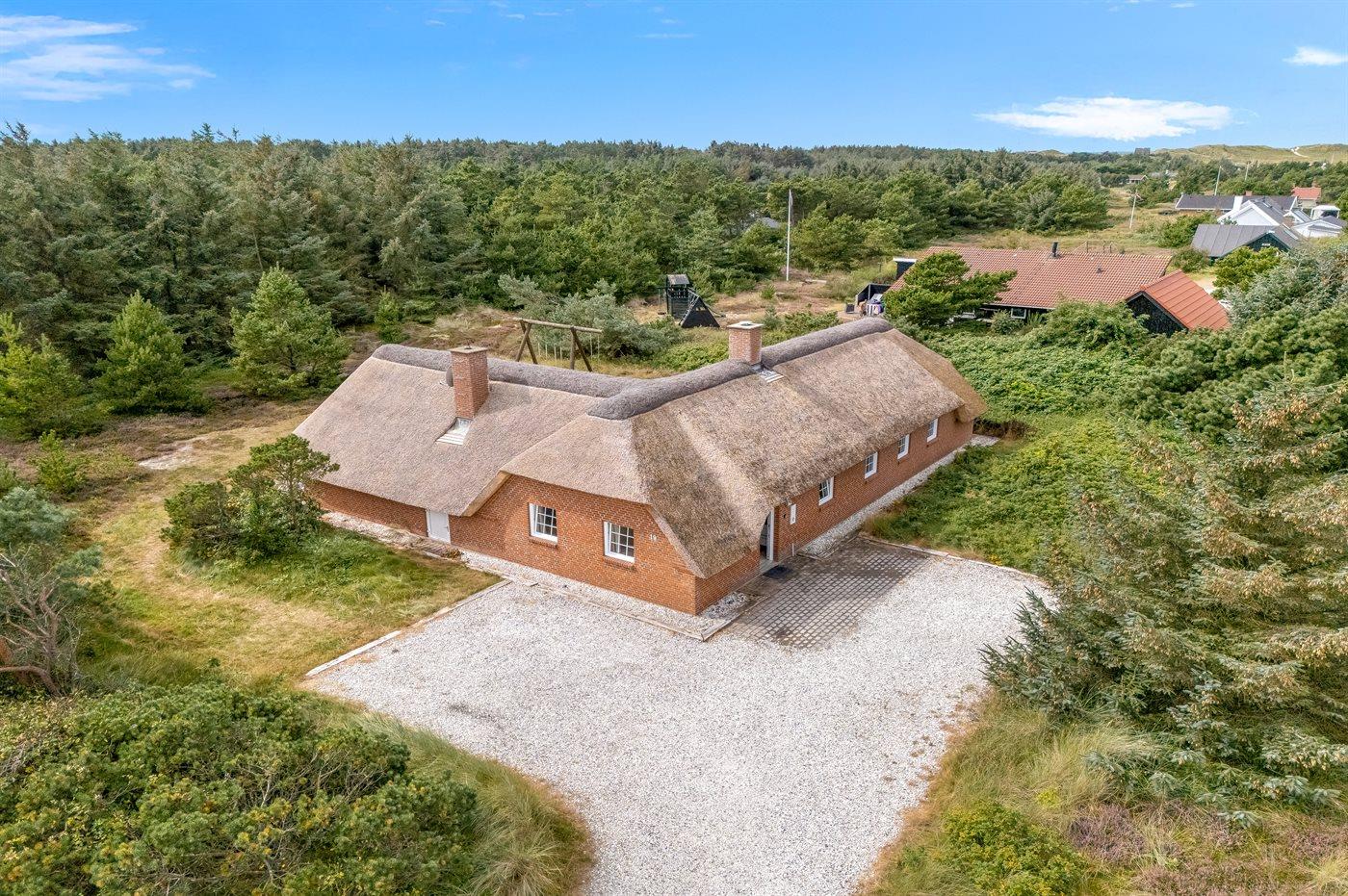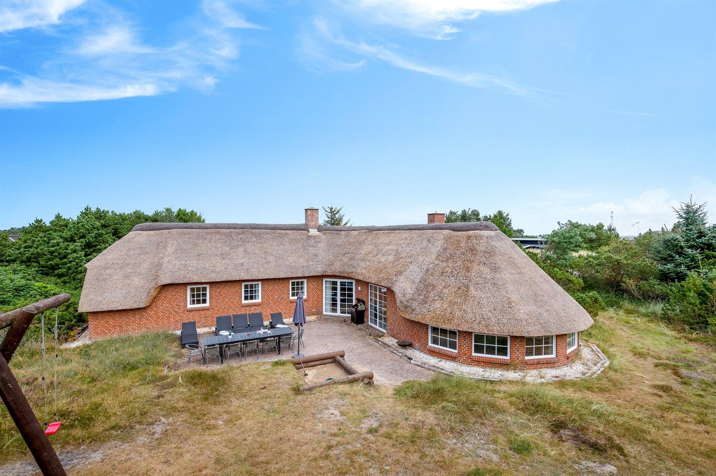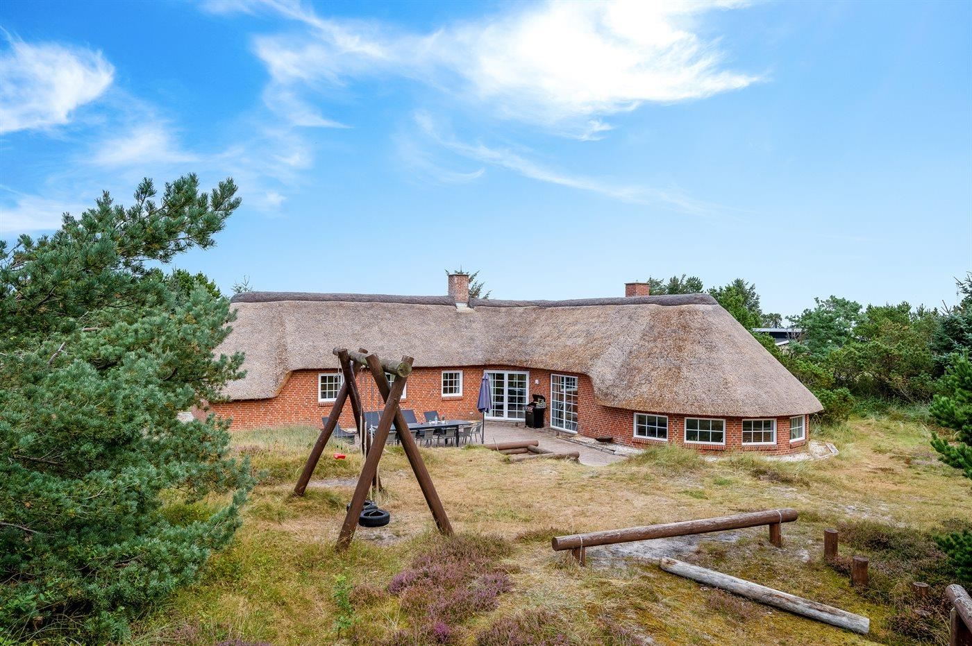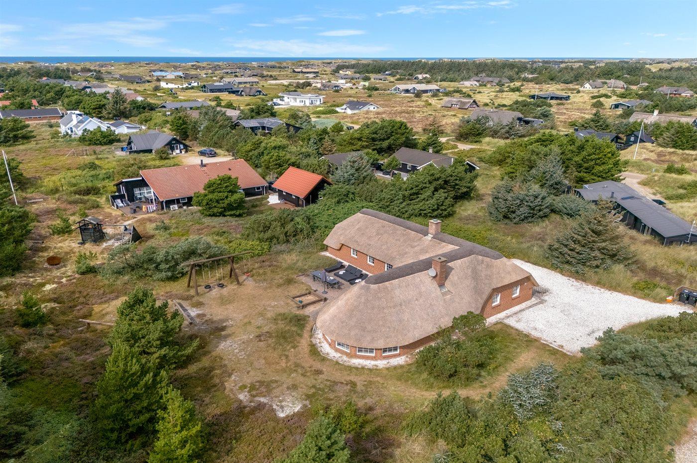 In einem naturschönen Gebiet auf Holmsland Klit, nur 900 m von der Nordsee entfernt und wenige Minuten Fahrt zum Badeort Søndervig, liegt dieses schöne und geräumige Ferienhaus. Das Haus mit Reetdach ist aus Stein 1994 gebaut und liegt auf einem schönen Natur- und Dünengrundstück. Offenes Terrassenareal mit verschiedenen Gartenmöbeln, wo Sie sich entspannen können, während die Kinder im Sandkasten oder auf der Schaukel spielen. Klinkerböden, jedoch Holzböden in den Schlafzimmern. Große, schöne Poolabteilung, wo es viele Möglichkeiten sich zu trimmen oder sich zu entspannen gibt - eine Stelle, wo Gemütlichkeit und Beisammensein gedeihen. Hier gibt es Swimmingpool, Kinderpool, Gegenstromanlage, Rutsche, 5-Pers. Standwasser-Whirlpool, Sauna und direkten Zugang zu einem der Badezimmer des Hauses mit Duschnische und beheizbarem Fußboden. Die herrliche, große Küche enthält u. a. Amerikanischer Kühlschrank (518 l Kühlschrank und 175 l Gefrierkapazität), Mikrowelle, Umluftofen und Geschirrspüler. Gemütlich eingerichtetes Wohnzimmer mit Kaminofen, TV mit digitalem Satellitenanschluss, DVD-Spieler und Stereoanlage mit CD-Spieler. 6 Schlafzimmer: 4 Zimmer mit Doppelbett und 2 Zimmer mit je 2 Einzelbetten. Außerdem ist das Haus mit Waschmaschine und Wäschetrockner ausgestattet. Für die kleinen Feriengäste gibt es Kinderbett und Kinderhochstuhl. Ein helles und freundliches Ferienhaus, das sich für mehrere Familien gut eignet - nicht weit vom Badeort Søndervig entfernt.