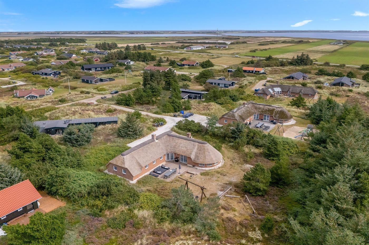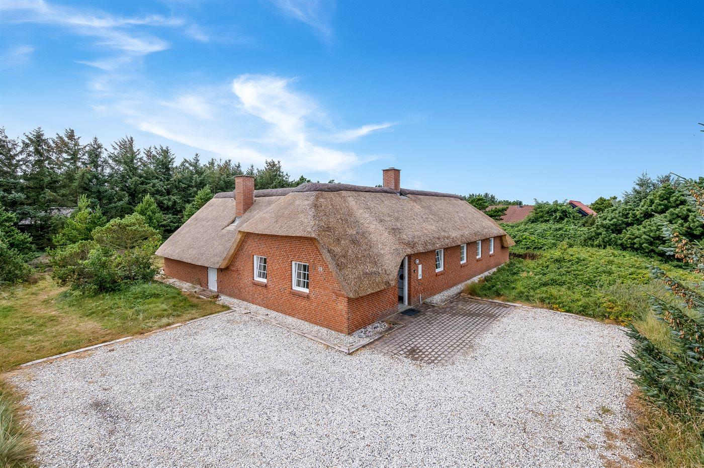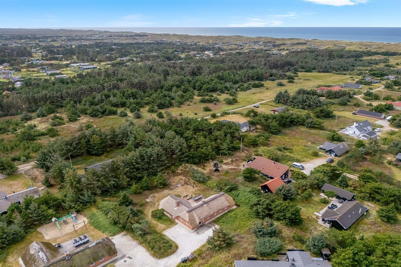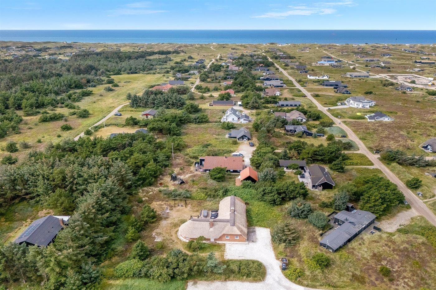 In einem naturschönen Gebiet auf Holmsland Klit, nur 900 m von der Nordsee entfernt und wenige Minuten Fahrt zum Badeort Søndervig, liegt dieses schöne und geräumige Ferienhaus. Das Haus mit Reetdach ist aus Stein 1994 gebaut und liegt auf einem schönen Natur- und Dünengrundstück. Offenes Terrassenareal mit verschiedenen Gartenmöbeln, wo Sie sich entspannen können, während die Kinder im Sandkasten oder auf der Schaukel spielen. Klinkerböden, jedoch Holzböden in den Schlafzimmern. Große, schöne Poolabteilung, wo es viele Möglichkeiten sich zu trimmen oder sich zu entspannen gibt - eine Stelle, wo Gemütlichkeit und Beisammensein gedeihen. Hier gibt es Swimmingpool, Kinderpool, Gegenstromanlage, Rutsche, 5-Pers. Standwasser-Whirlpool, Sauna und direkten Zugang zu einem der Badezimmer des Hauses mit Duschnische und beheizbarem Fußboden. Die herrliche, große Küche enthält u. a. Amerikanischer Kühlschrank (518 l Kühlschrank und 175 l Gefrierkapazität), Mikrowelle, Umluftofen und Geschirrspüler. Gemütlich eingerichtetes Wohnzimmer mit Kaminofen, TV mit digitalem Satellitenanschluss, DVD-Spieler und Stereoanlage mit CD-Spieler. 6 Schlafzimmer: 4 Zimmer mit Doppelbett und 2 Zimmer mit je 2 Einzelbetten. Außerdem ist das Haus mit Waschmaschine und Wäschetrockner ausgestattet. Für die kleinen Feriengäste gibt es Kinderbett und Kinderhochstuhl. Ein helles und freundliches Ferienhaus, das sich für mehrere Familien gut eignet - nicht weit vom Badeort Søndervig entfernt.
