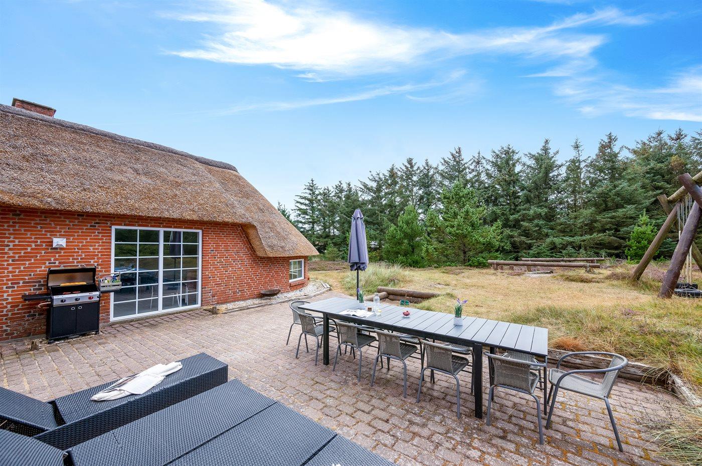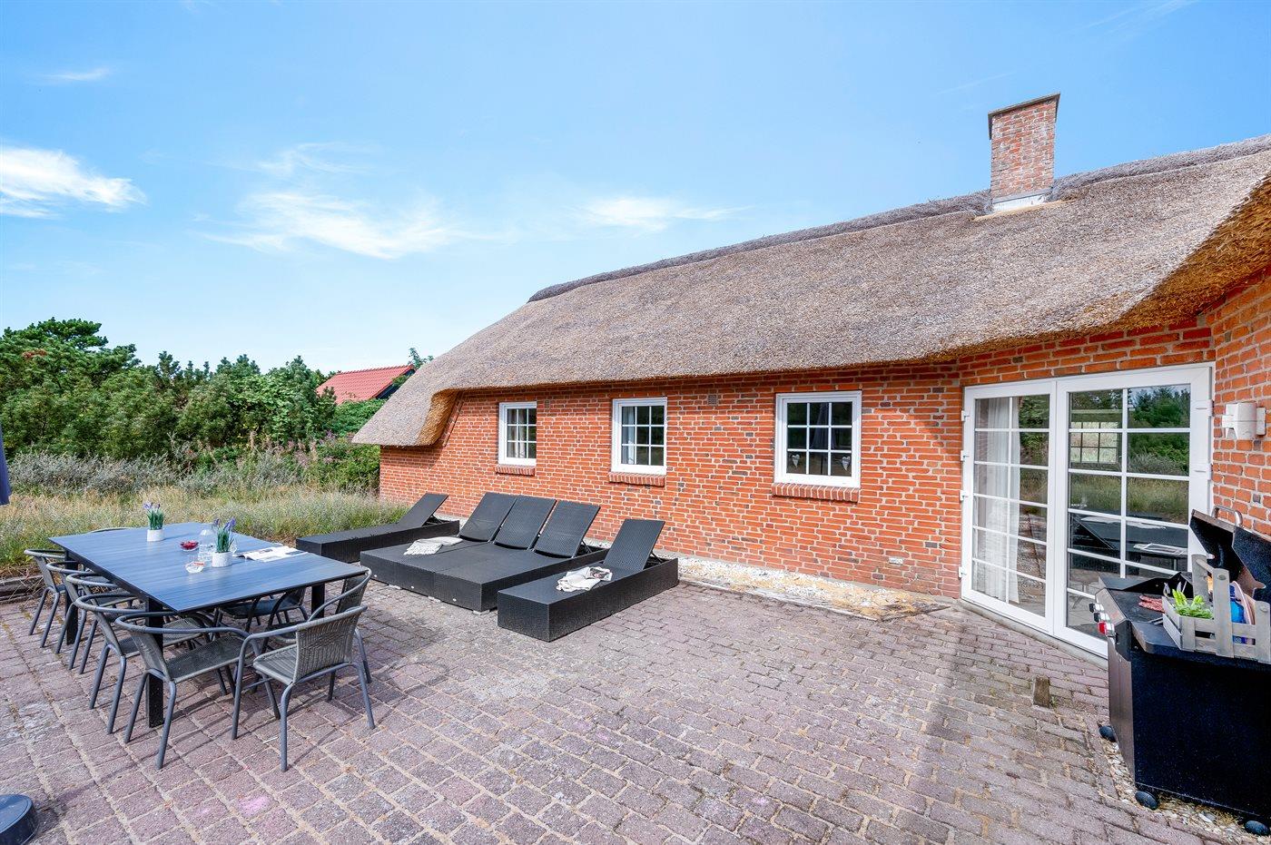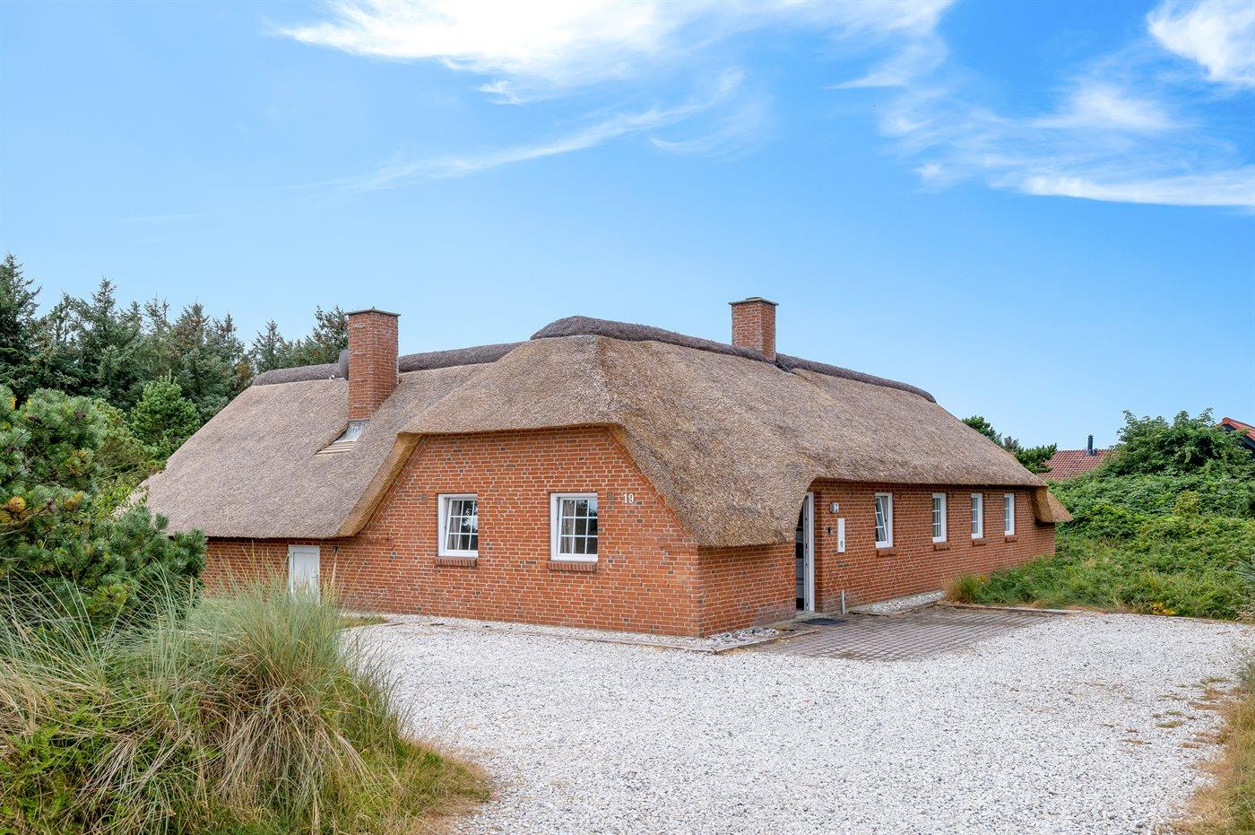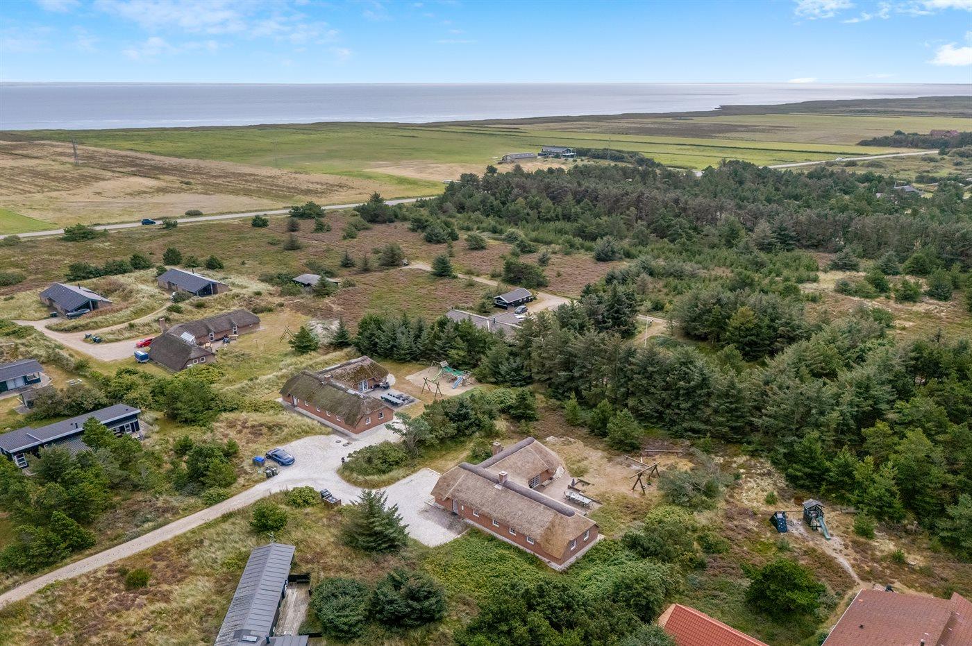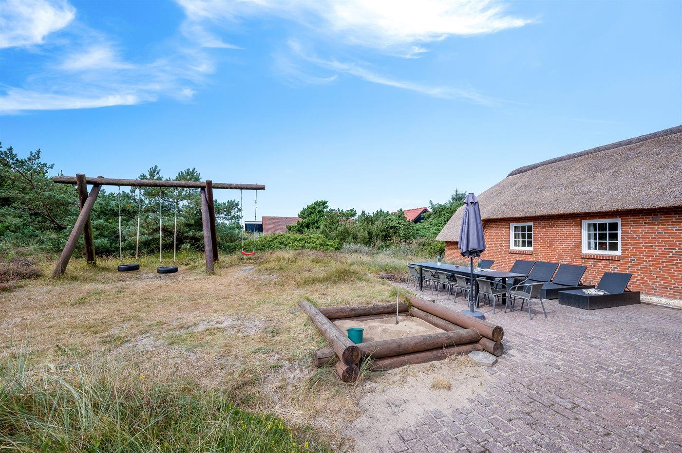 In einem naturschönen Gebiet auf Holmsland Klit, nur 900 m von der Nordsee entfernt und wenige Minuten Fahrt zum Badeort Søndervig, liegt dieses schöne und geräumige Ferienhaus. Das Haus mit Reetdach ist aus Stein 1994 gebaut und liegt auf einem schönen Natur- und Dünengrundstück. Offenes Terrassenareal mit verschiedenen Gartenmöbeln, wo Sie sich entspannen können, während die Kinder im Sandkasten oder auf der Schaukel spielen. Klinkerböden, jedoch Holzböden in den Schlafzimmern. Große, schöne Poolabteilung, wo es viele Möglichkeiten sich zu trimmen oder sich zu entspannen gibt - eine Stelle, wo Gemütlichkeit und Beisammensein gedeihen. Hier gibt es Swimmingpool, Kinderpool, Gegenstromanlage, Rutsche, 5-Pers. Standwasser-Whirlpool, Sauna und direkten Zugang zu einem der Badezimmer des Hauses mit Duschnische und beheizbarem Fußboden. Die herrliche, große Küche enthält u. a. Amerikanischer Kühlschrank (518 l Kühlschrank und 175 l Gefrierkapazität), Mikrowelle, Umluftofen und Geschirrspüler. Gemütlich eingerichtetes Wohnzimmer mit Kaminofen, TV mit digitalem Satellitenanschluss, DVD-Spieler und Stereoanlage mit CD-Spieler. 6 Schlafzimmer: 4 Zimmer mit Doppelbett und 2 Zimmer mit je 2 Einzelbetten. Außerdem ist das Haus mit Waschmaschine und Wäschetrockner ausgestattet. Für die kleinen Feriengäste gibt es Kinderbett und Kinderhochstuhl. Ein helles und freundliches Ferienhaus, das sich für mehrere Familien gut eignet - nicht weit vom Badeort Søndervig entfernt.