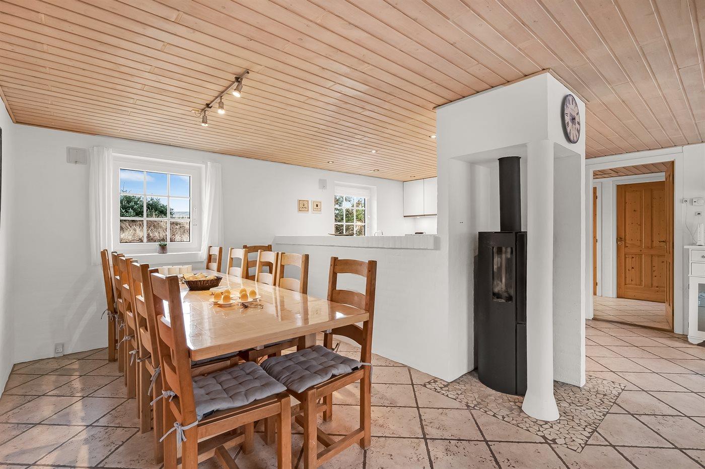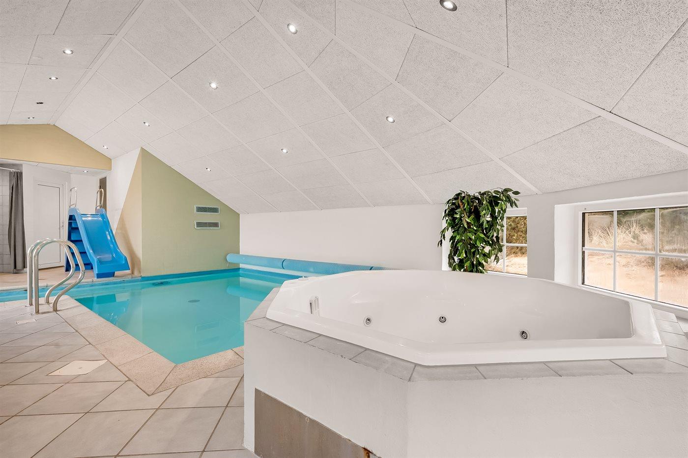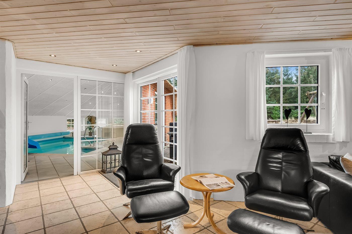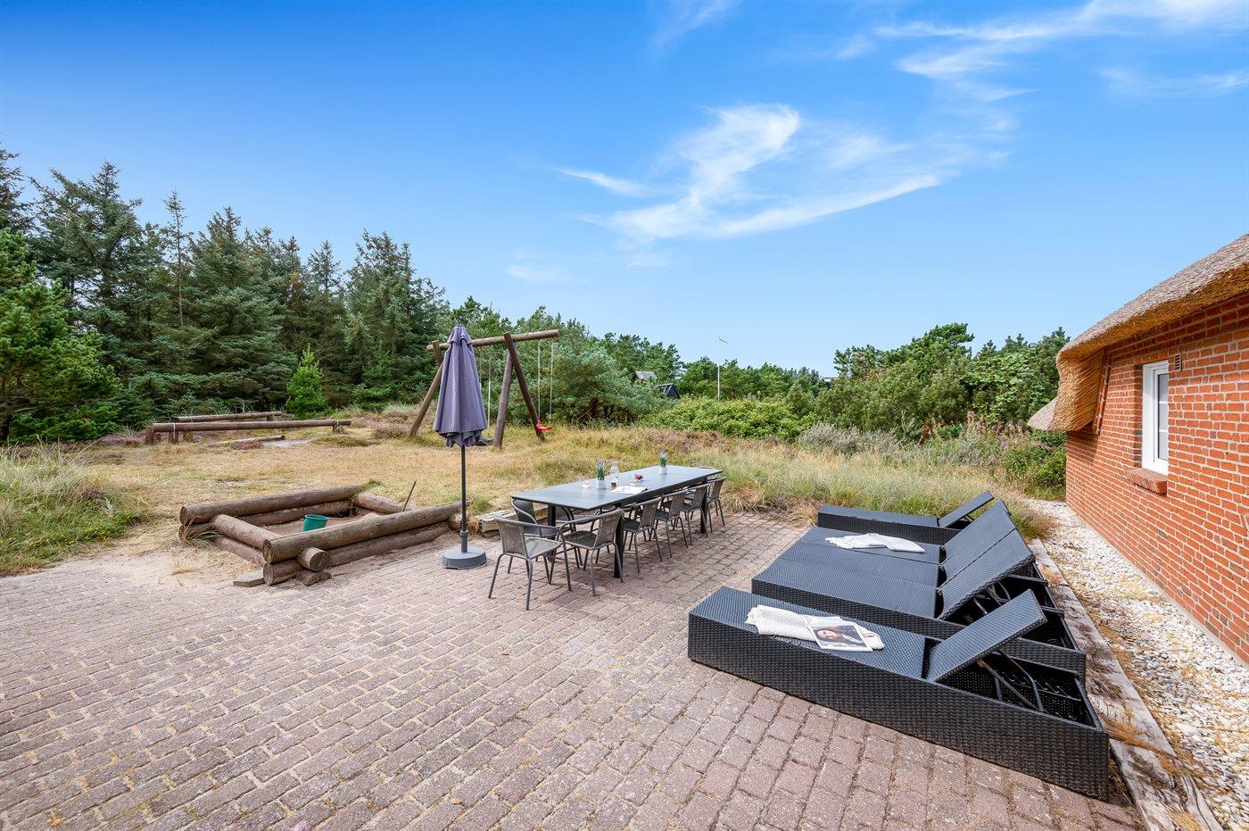 In einem naturschönen Gebiet auf Holmsland Klit, nur 900 m von der Nordsee entfernt und wenige Minuten Fahrt zum Badeort Søndervig, liegt dieses schöne und geräumige Ferienhaus. Das Haus mit Reetdach ist aus Stein 1994 gebaut und liegt auf einem schönen Natur- und Dünengrundstück. Offenes Terrassenareal mit verschiedenen Gartenmöbeln, wo Sie sich entspannen können, während die Kinder im Sandkasten oder auf der Schaukel spielen. Klinkerböden, jedoch Holzböden in den Schlafzimmern. Große, schöne Poolabteilung, wo es viele Möglichkeiten sich zu trimmen oder sich zu entspannen gibt - eine Stelle, wo Gemütlichkeit und Beisammensein gedeihen. Hier gibt es Swimmingpool, Kinderpool, Gegenstromanlage, Rutsche, 5-Pers. Standwasser-Whirlpool, Sauna und direkten Zugang zu einem der Badezimmer des Hauses mit Duschnische und beheizbarem Fußboden. Die herrliche, große Küche enthält u. a. Amerikanischer Kühlschrank (518 l Kühlschrank und 175 l Gefrierkapazität), Mikrowelle, Umluftofen und Geschirrspüler. Gemütlich eingerichtetes Wohnzimmer mit Kaminofen, TV mit digitalem Satellitenanschluss, DVD-Spieler und Stereoanlage mit CD-Spieler. 6 Schlafzimmer: 4 Zimmer mit Doppelbett und 2 Zimmer mit je 2 Einzelbetten. Außerdem ist das Haus mit Waschmaschine und Wäschetrockner ausgestattet. Für die kleinen Feriengäste gibt es Kinderbett und Kinderhochstuhl. Ein helles und freundliches Ferienhaus, das sich für mehrere Familien gut eignet - nicht weit vom Badeort Søndervig entfernt.