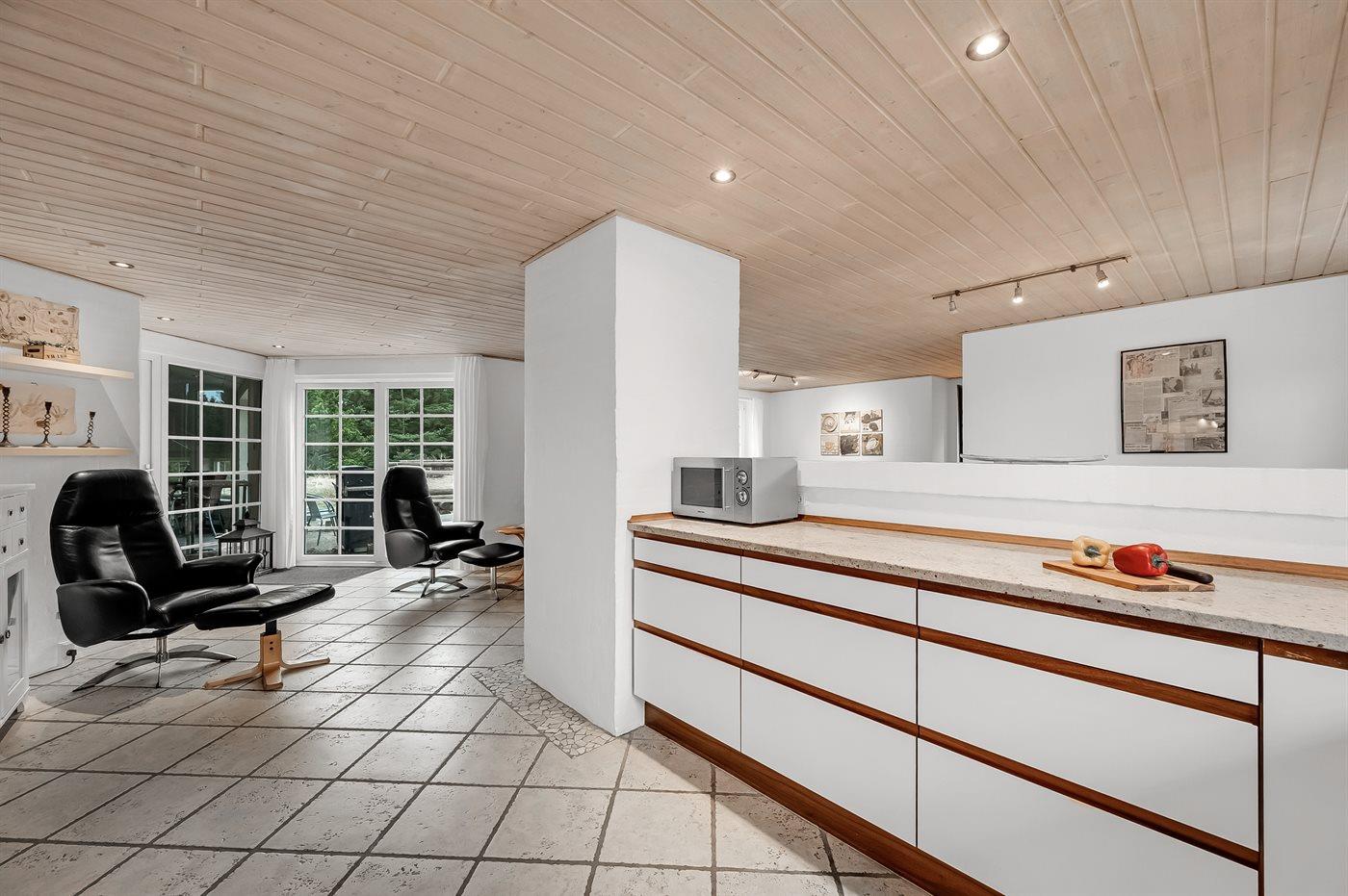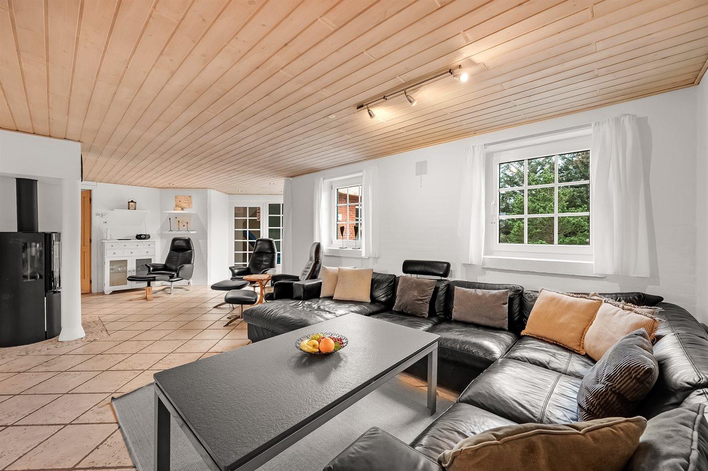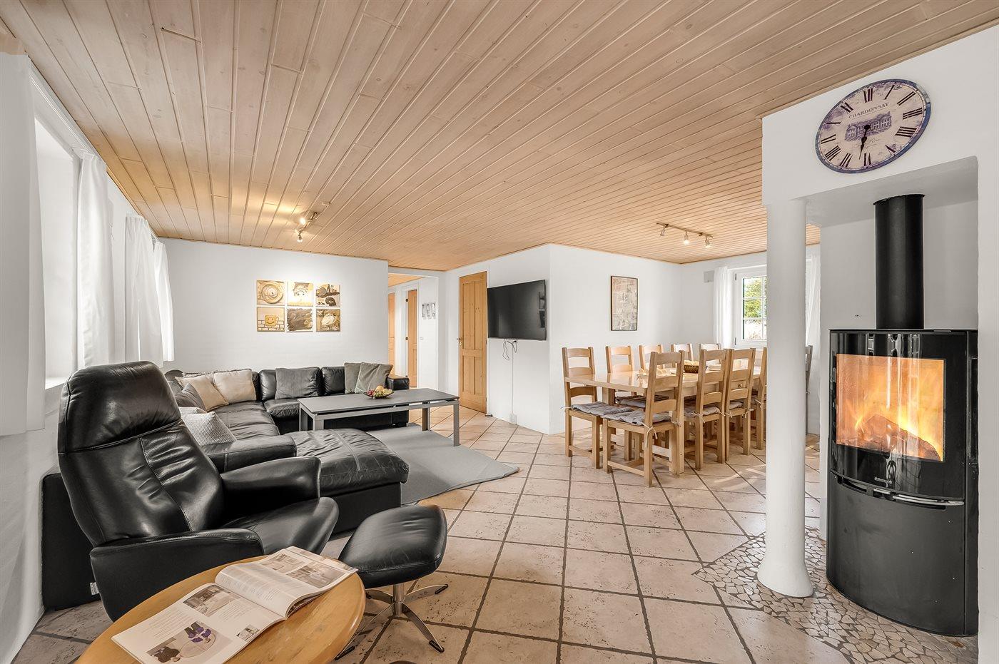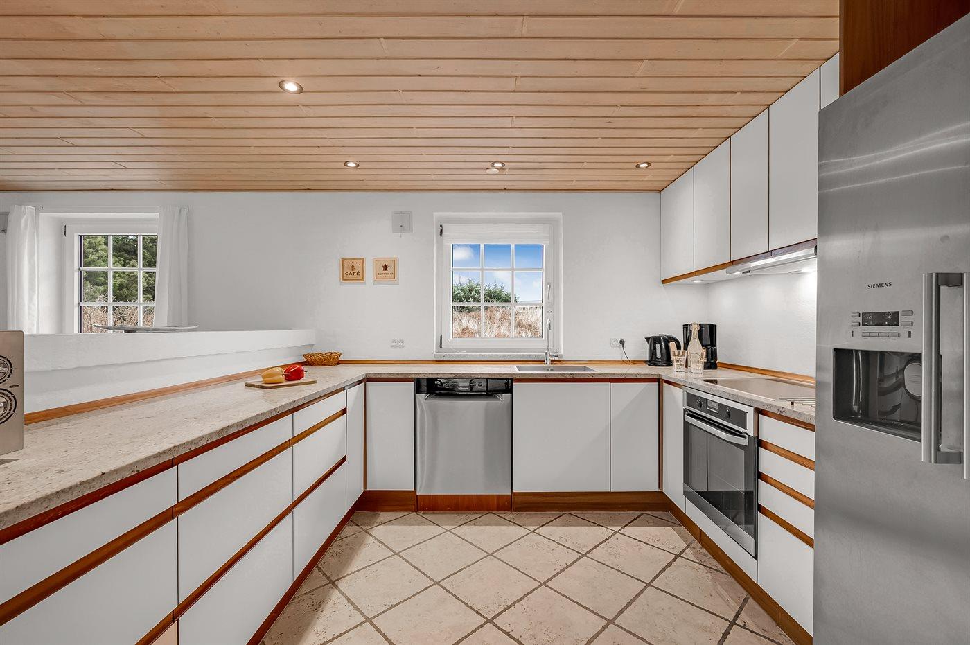 In einem naturschönen Gebiet auf Holmsland Klit, nur 900 m von der Nordsee entfernt und wenige Minuten Fahrt zum Badeort Søndervig, liegt dieses schöne und geräumige Ferienhaus. Das Haus mit Reetdach ist aus Stein 1994 gebaut und liegt auf einem schönen Natur- und Dünengrundstück. Offenes Terrassenareal mit verschiedenen Gartenmöbeln, wo Sie sich entspannen können, während die Kinder im Sandkasten oder auf der Schaukel spielen. Klinkerböden, jedoch Holzböden in den Schlafzimmern. Große, schöne Poolabteilung, wo es viele Möglichkeiten sich zu trimmen oder sich zu entspannen gibt - eine Stelle, wo Gemütlichkeit und Beisammensein gedeihen. Hier gibt es Swimmingpool, Kinderpool, Gegenstromanlage, Rutsche, 5-Pers. Standwasser-Whirlpool, Sauna und direkten Zugang zu einem der Badezimmer des Hauses mit Duschnische und beheizbarem Fußboden. Die herrliche, große Küche enthält u. a. Amerikanischer Kühlschrank (518 l Kühlschrank und 175 l Gefrierkapazität), Mikrowelle, Umluftofen und Geschirrspüler. Gemütlich eingerichtetes Wohnzimmer mit Kaminofen, TV mit digitalem Satellitenanschluss, DVD-Spieler und Stereoanlage mit CD-Spieler. 6 Schlafzimmer: 4 Zimmer mit Doppelbett und 2 Zimmer mit je 2 Einzelbetten. Außerdem ist das Haus mit Waschmaschine und Wäschetrockner ausgestattet. Für die kleinen Feriengäste gibt es Kinderbett und Kinderhochstuhl. Ein helles und freundliches Ferienhaus, das sich für mehrere Familien gut eignet - nicht weit vom Badeort Søndervig entfernt.