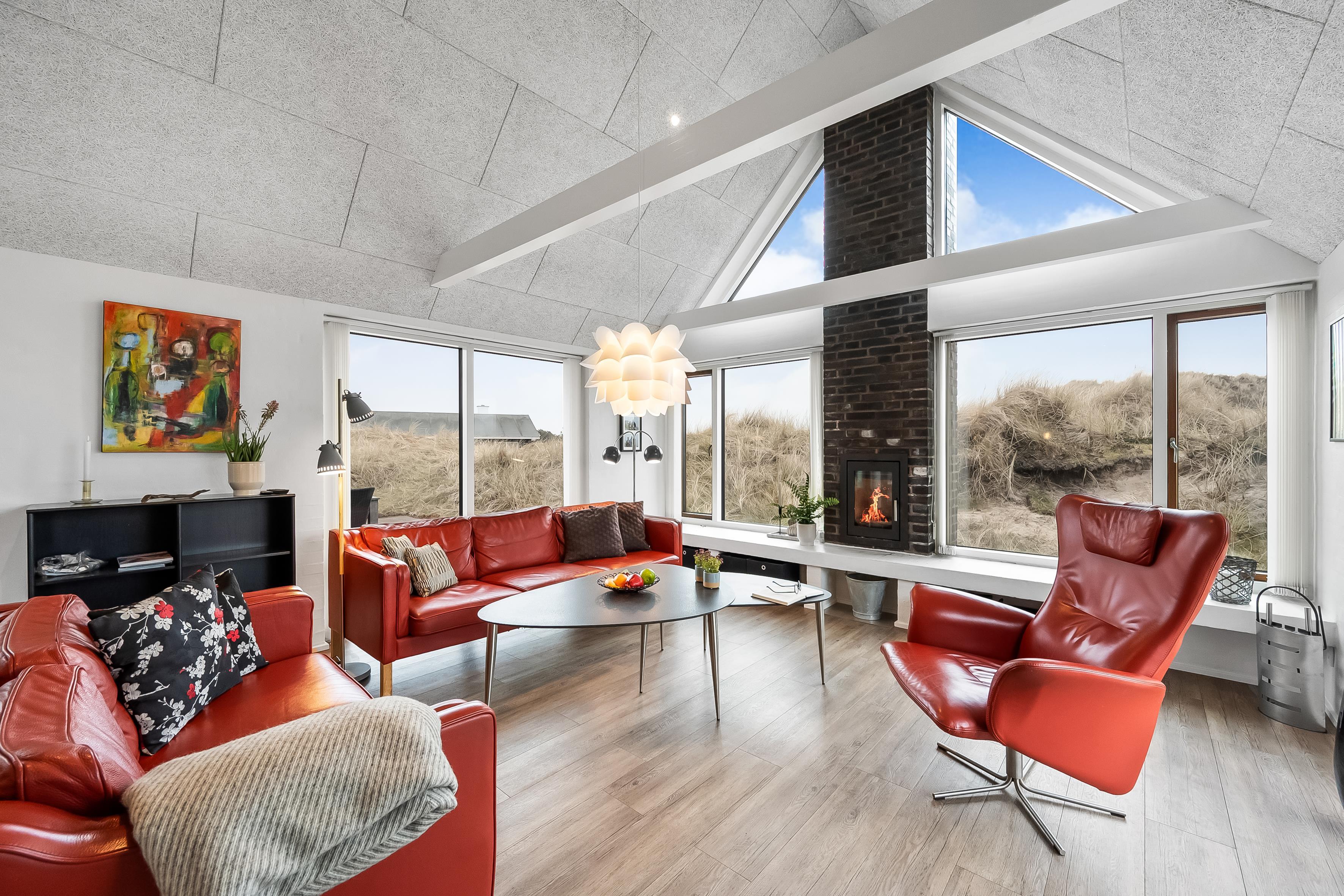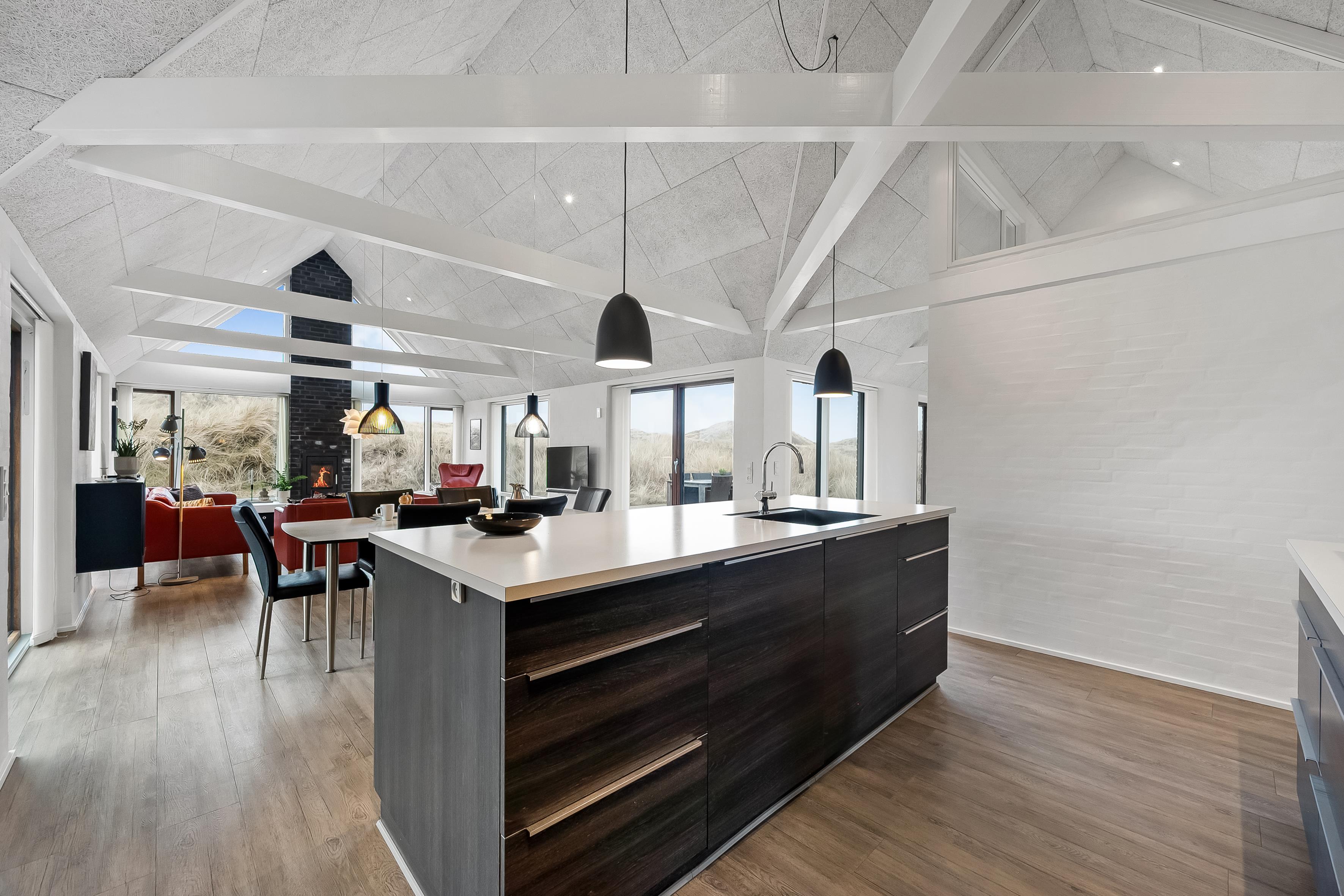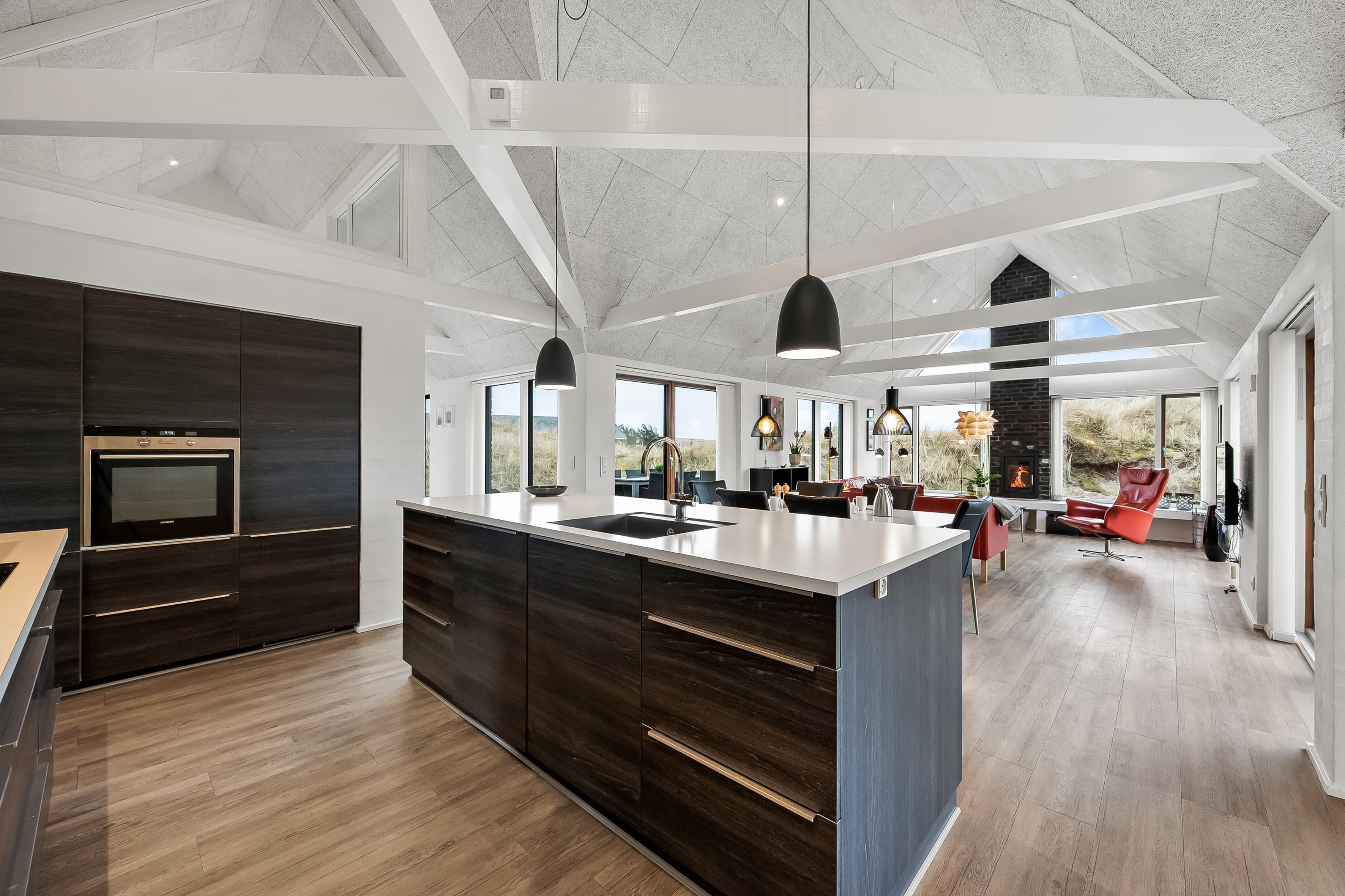 Im geräumigen offenen Küchen- und Wohnbereich, trifft moderne Eleganz auf praktische Funktionalität. Große Fenster bieten Panoramablick auf die atemberaubende Dünenlandschaft, während hochwertige Möbel zum Entspannen und Wohlfühlen einladen. Ein Flachbildfernseher mit Satellit für deutsche Kanäle, DVD-Player und WLAN bieten Unterhaltung für die ganze Familie. Ein Holzofen sorgt für eine gemütliche Atmosphäre an kühlen Abenden. Eine energiesparende Wärmepumpe und Fußbodenheizung im ganzen Haus sorgen das ganze Jahr über für angenehme Temperaturen.