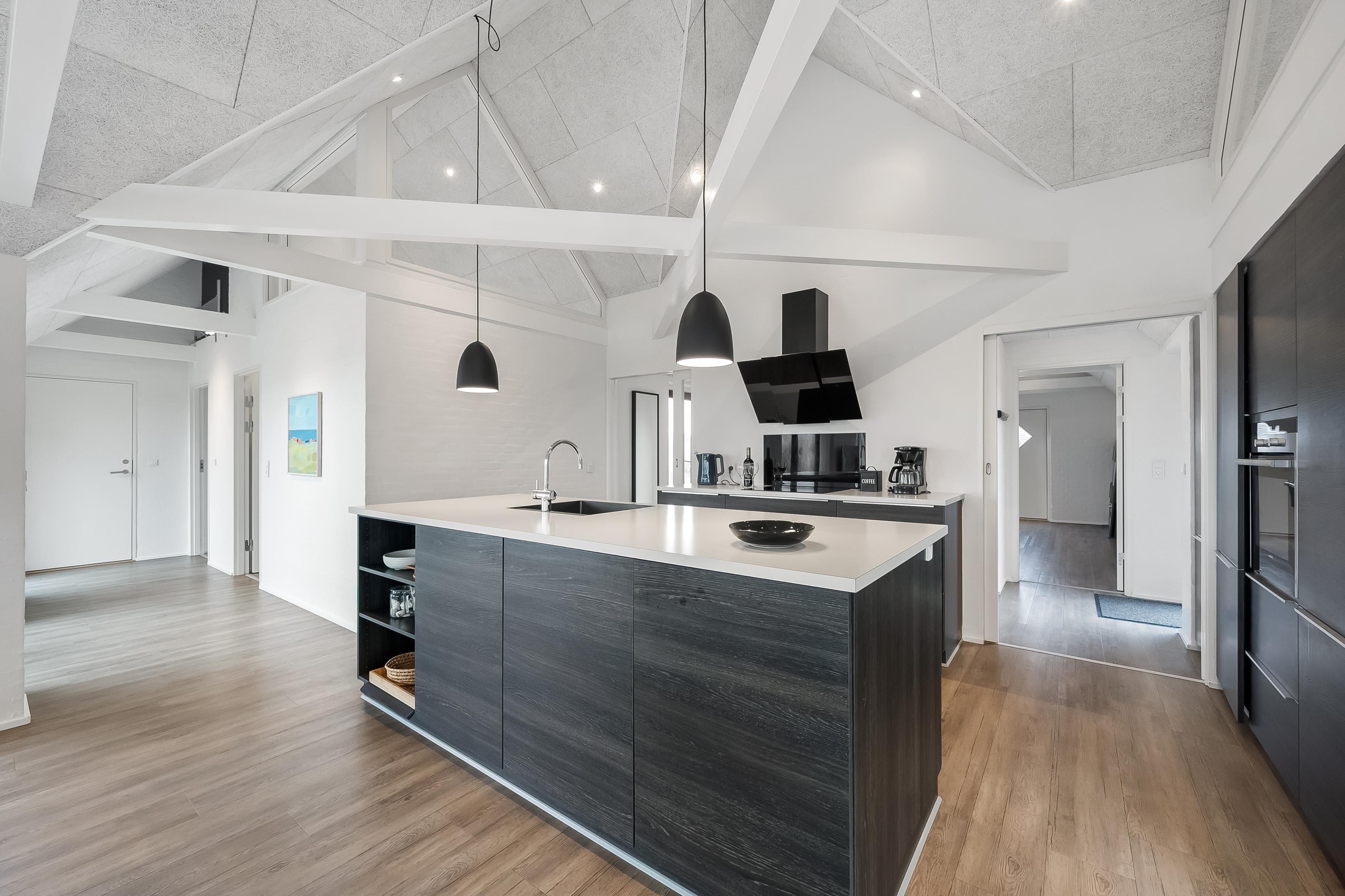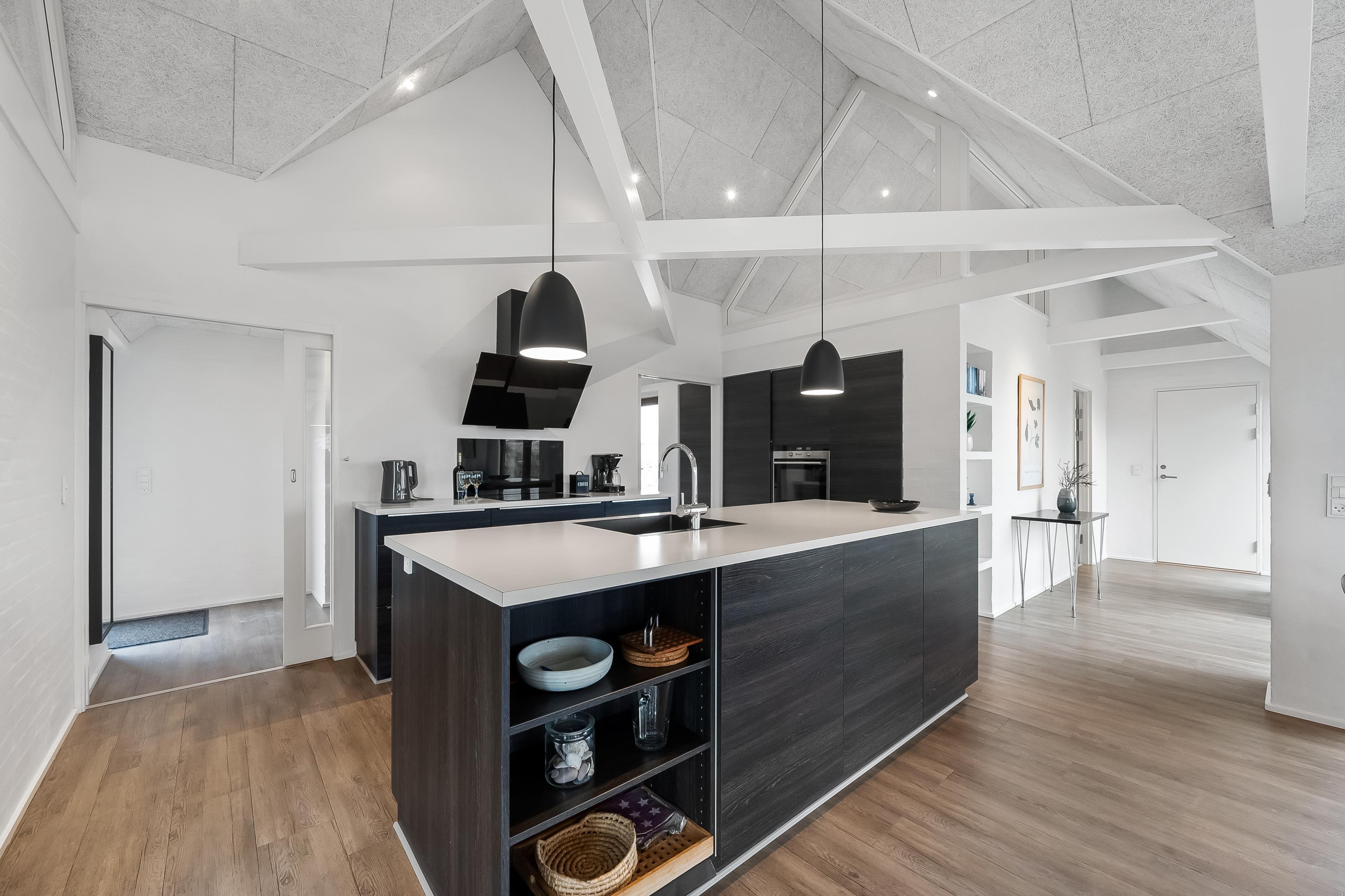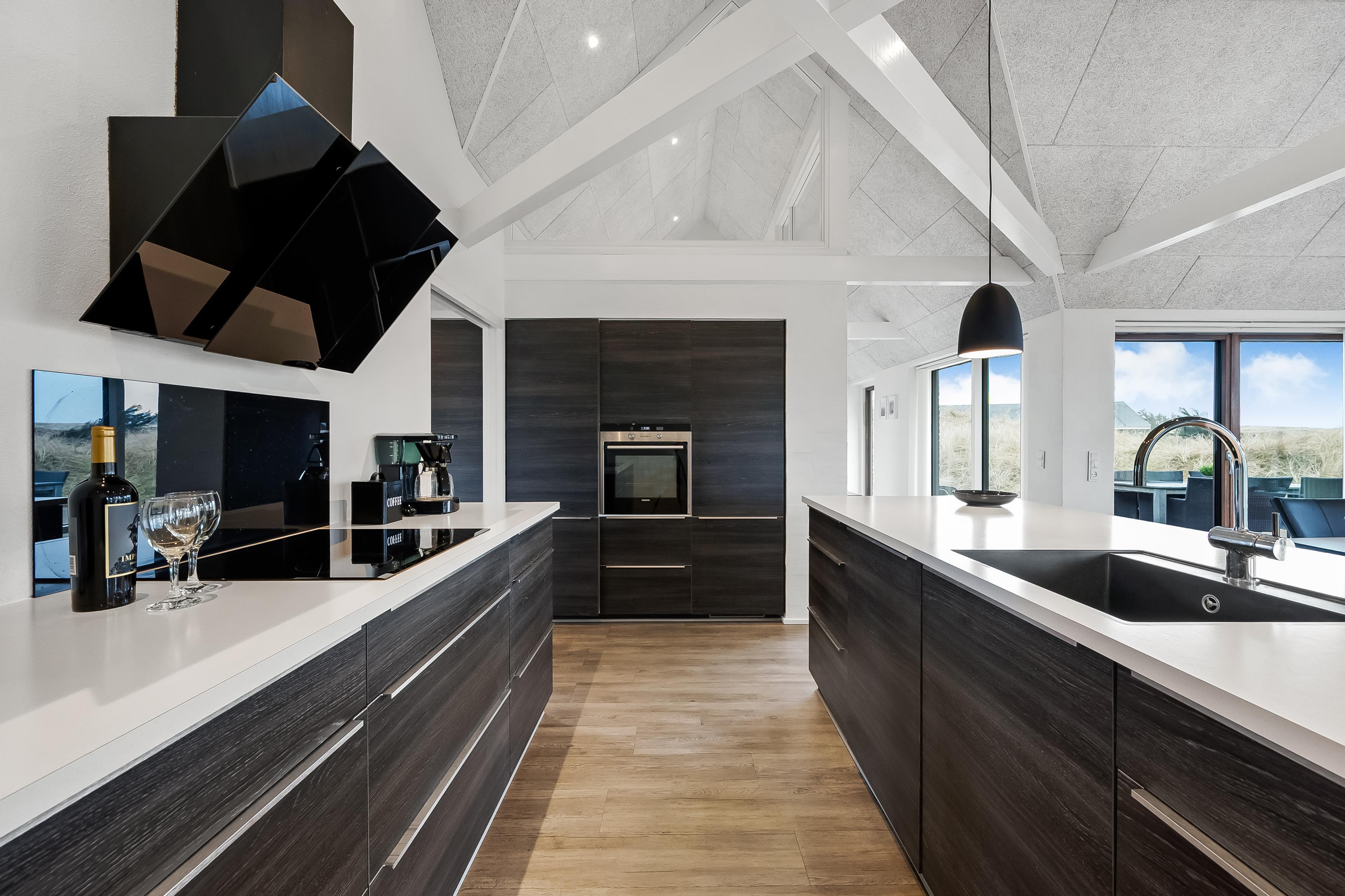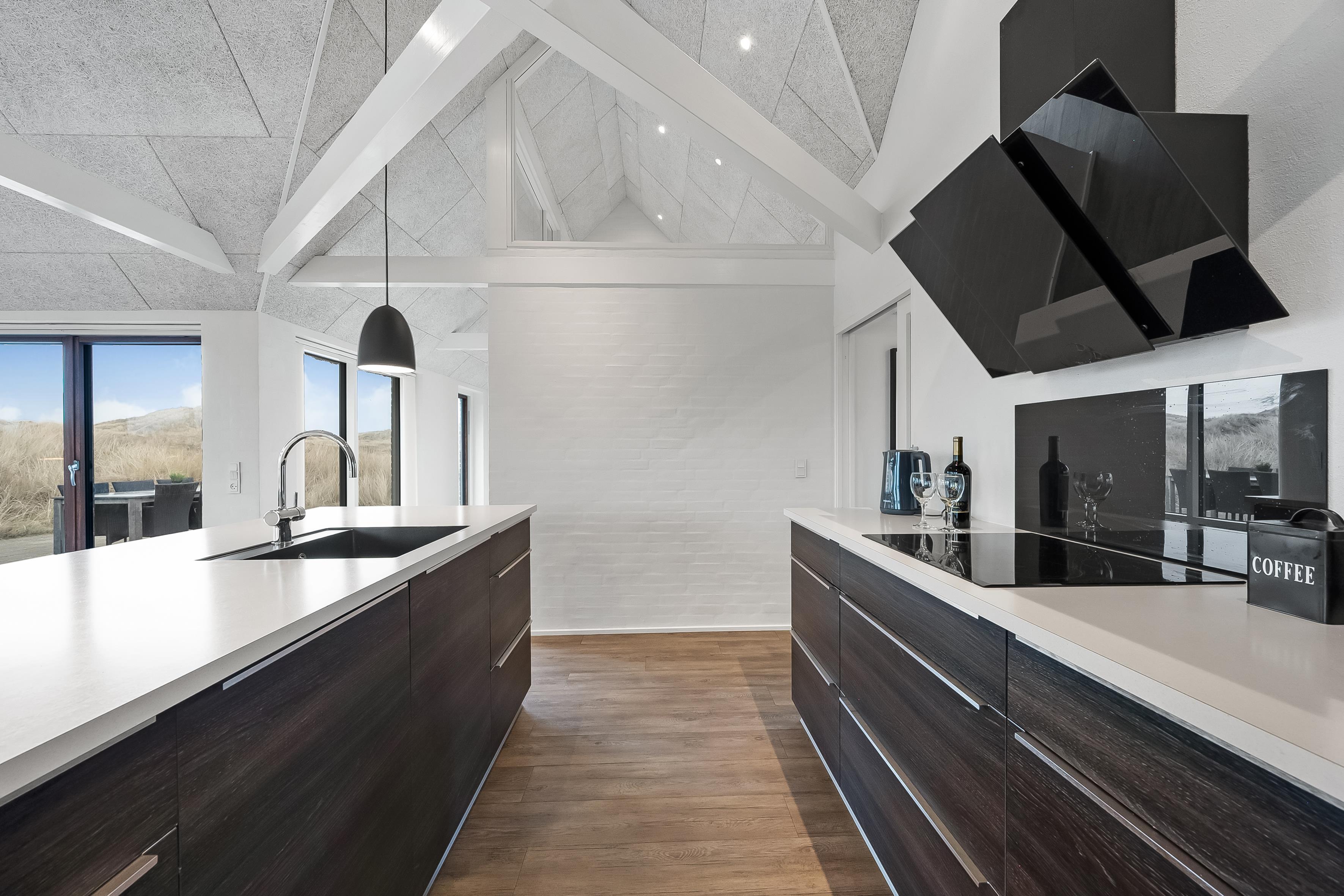 Im geräumigen offenen Küchen- und Wohnbereich, trifft moderne Eleganz auf praktische Funktionalität. Große Fenster bieten Panoramablick auf die atemberaubende Dünenlandschaft, während hochwertige Möbel zum Entspannen und Wohlfühlen einladen. Ein Flachbildfernseher mit Satellit für deutsche Kanäle, DVD-Player und WLAN bieten Unterhaltung für die ganze Familie. Ein Holzofen sorgt für eine gemütliche Atmosphäre an kühlen Abenden. Eine energiesparende Wärmepumpe und Fußbodenheizung im ganzen Haus sorgen das ganze Jahr über für angenehme Temperaturen.