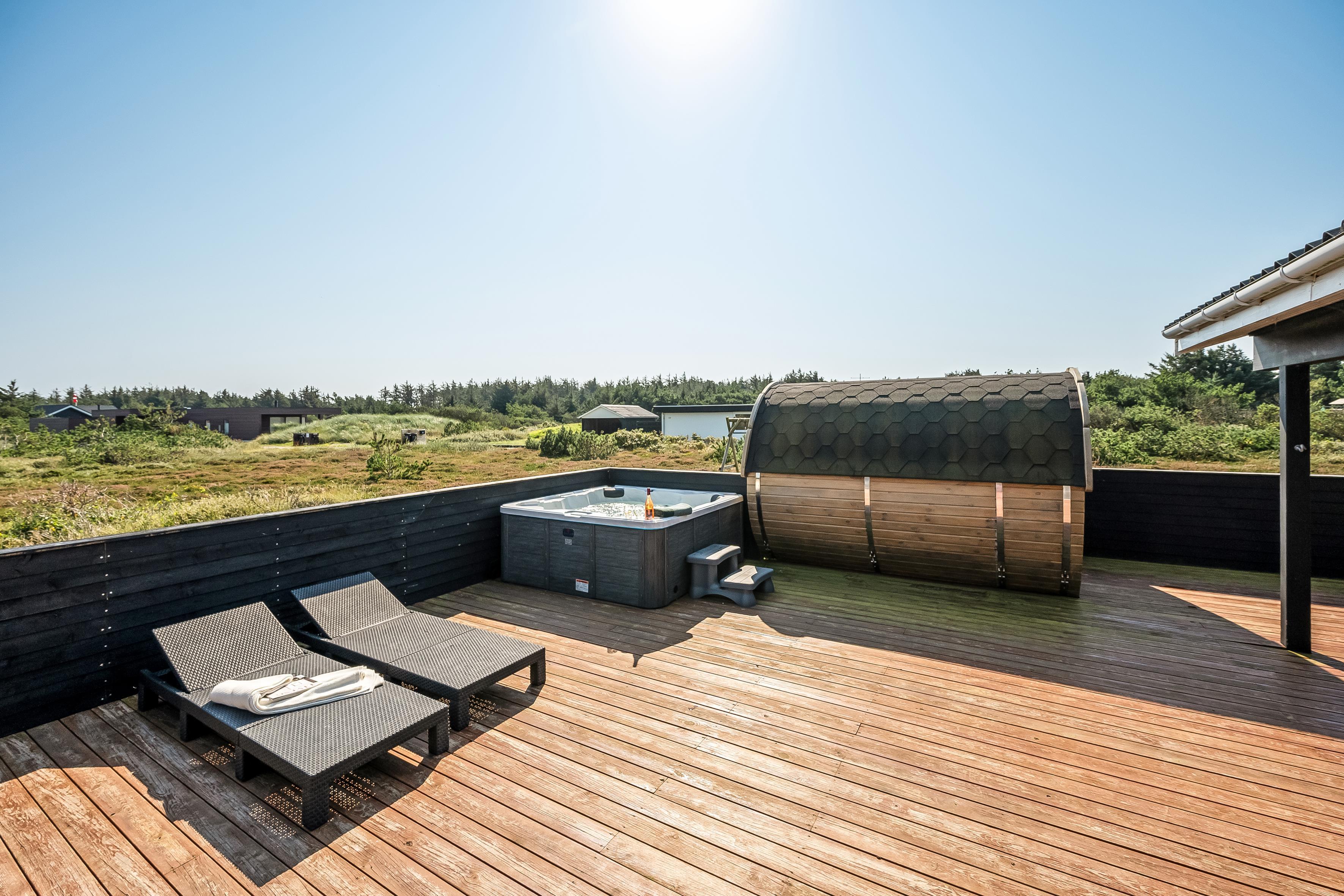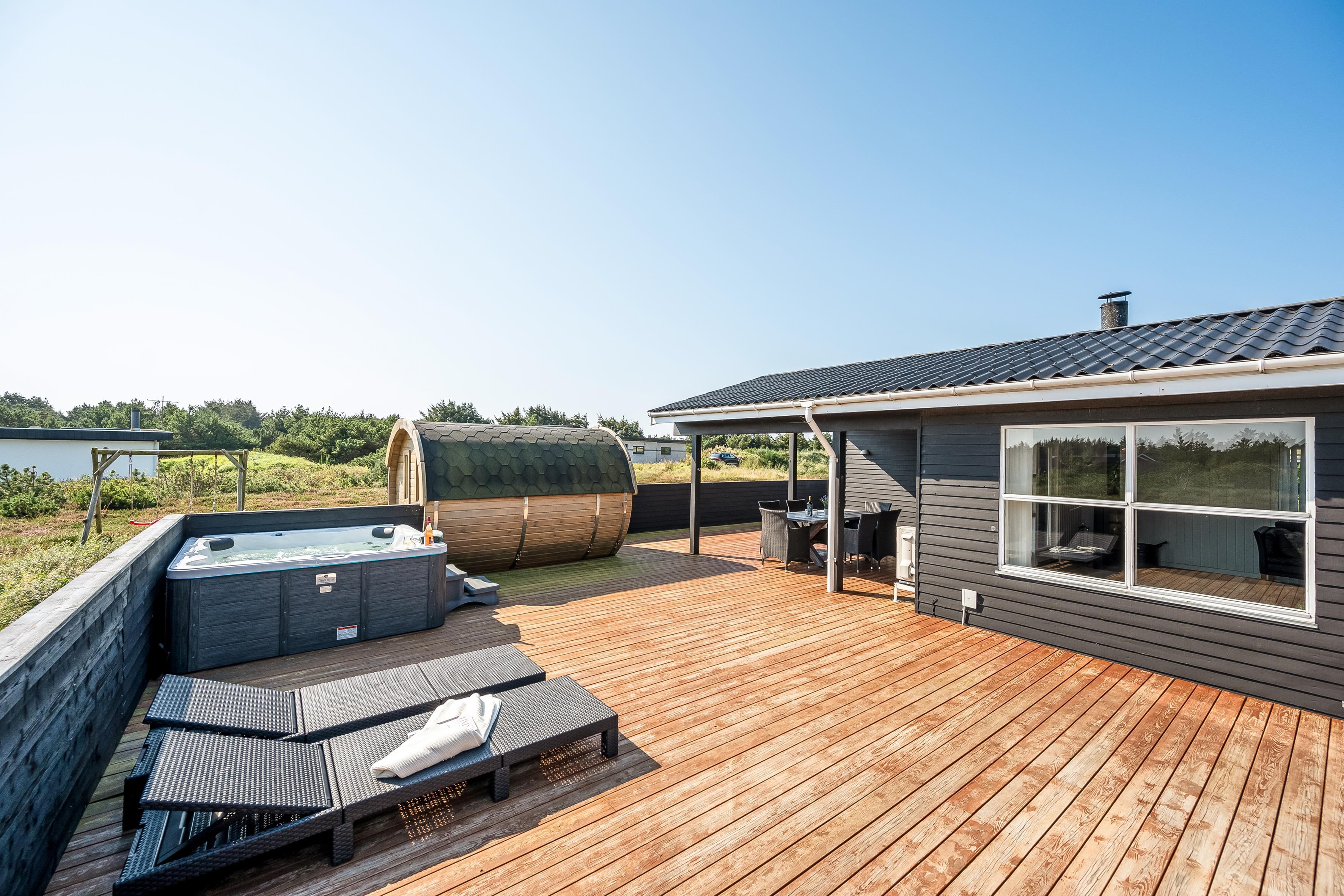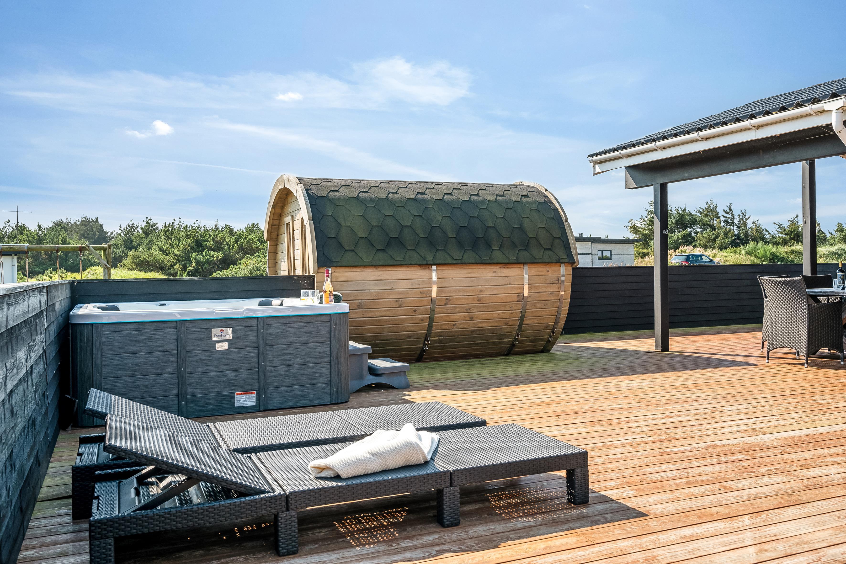 Das Ferienhaus verfügt über eine geräumige, geschlossene Holzterrasse, auf der Sie die frische Meeresluft genießen können. Die Terrasse enthält eine Außensauna, ideal zum Entspannen nach einem Tag am Strand, und einen Whirlpool für 6 Personen, in dem Sie die Blasen unter freiem Himmel genießen können. Ein Teil der Terrasse ist überdacht, sodass Sie bei jedem Wetter draußen sitzen können.