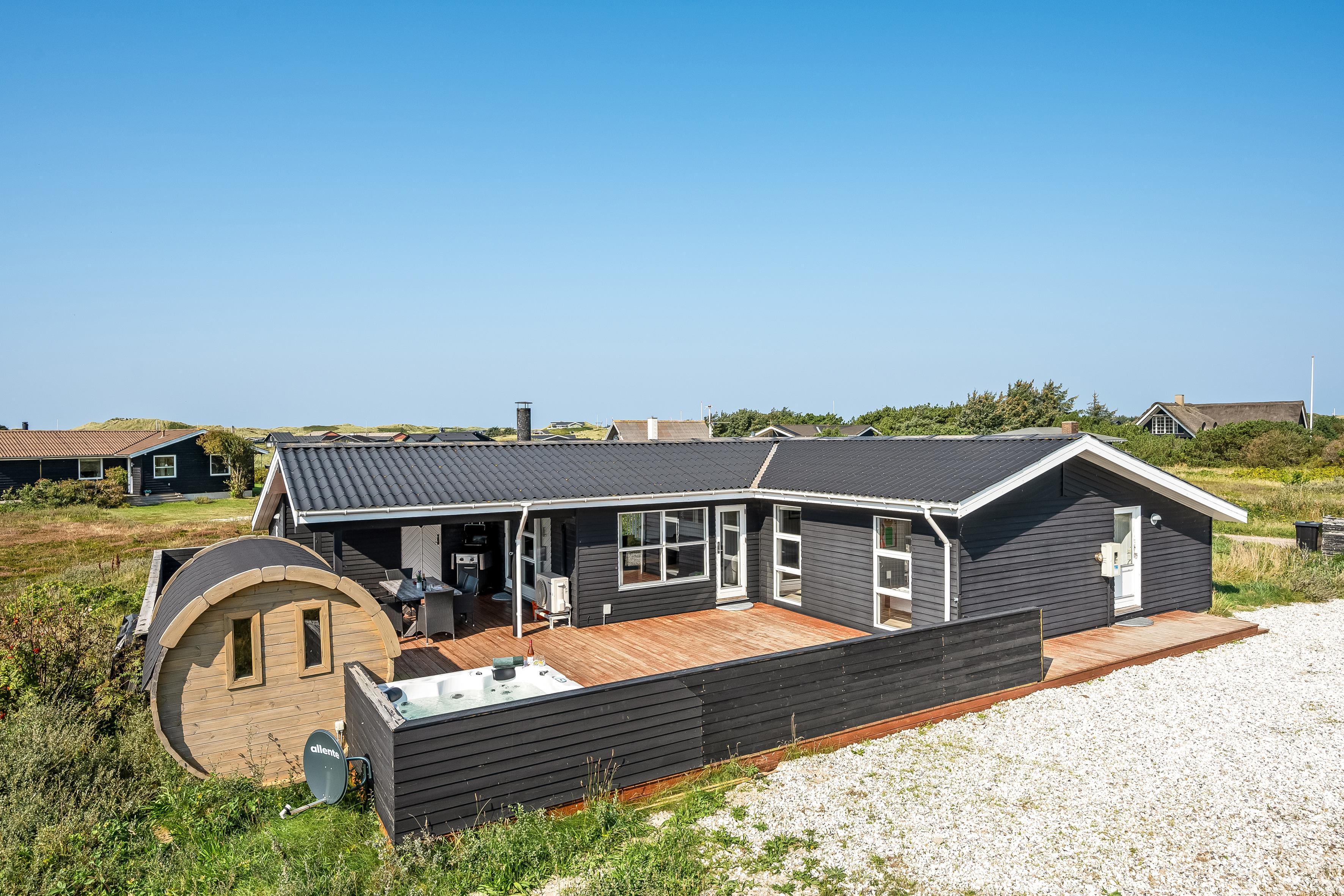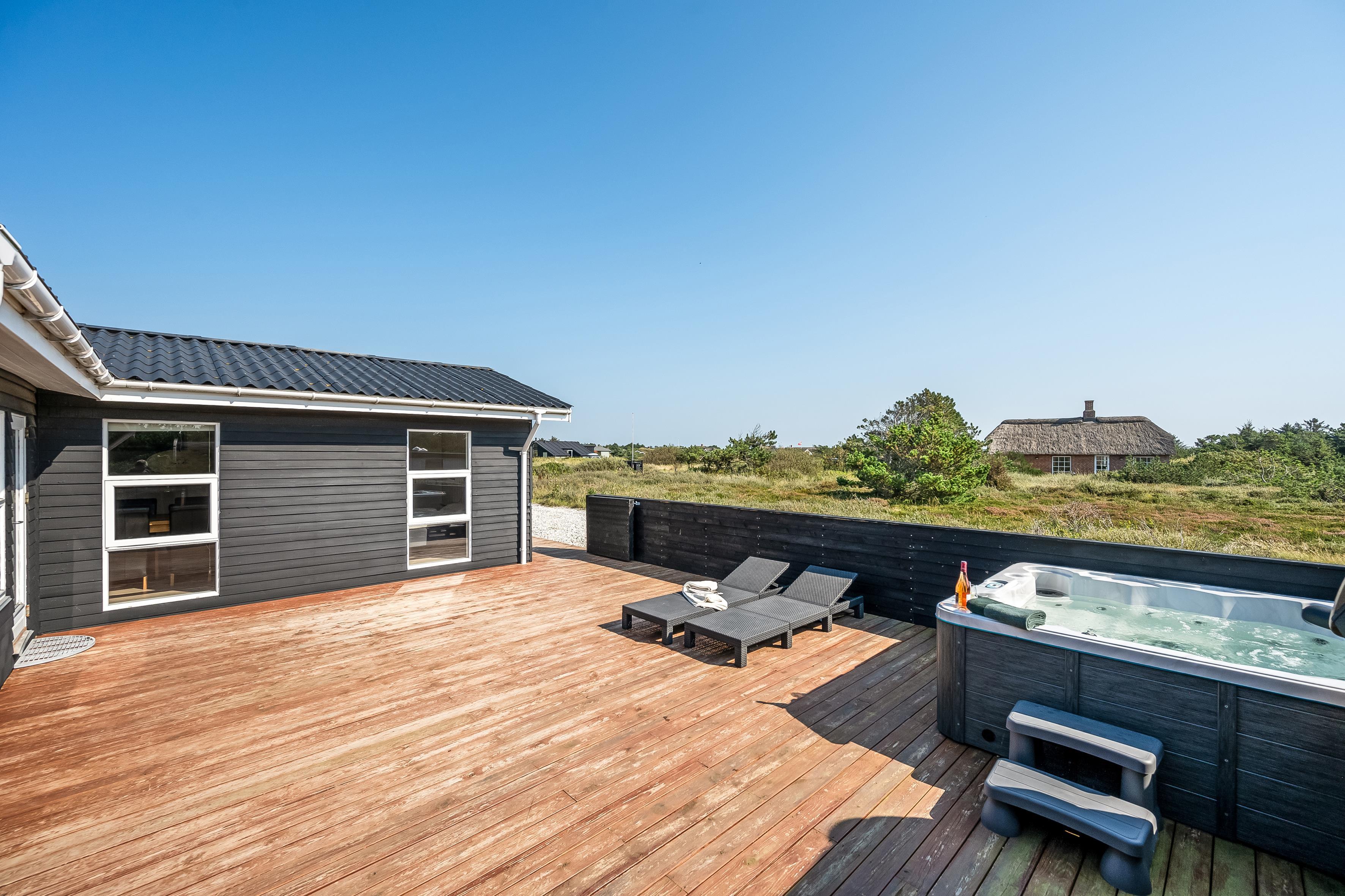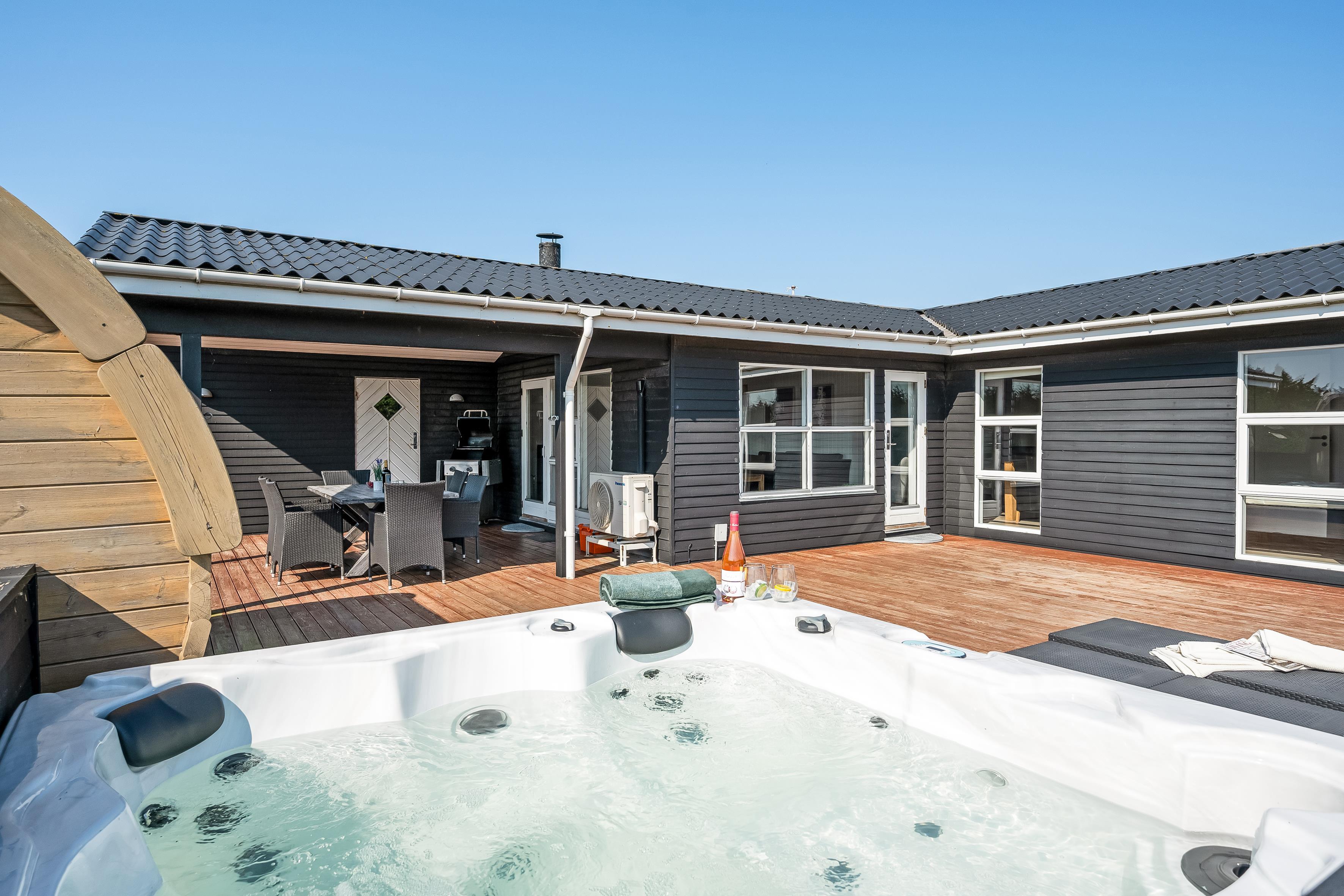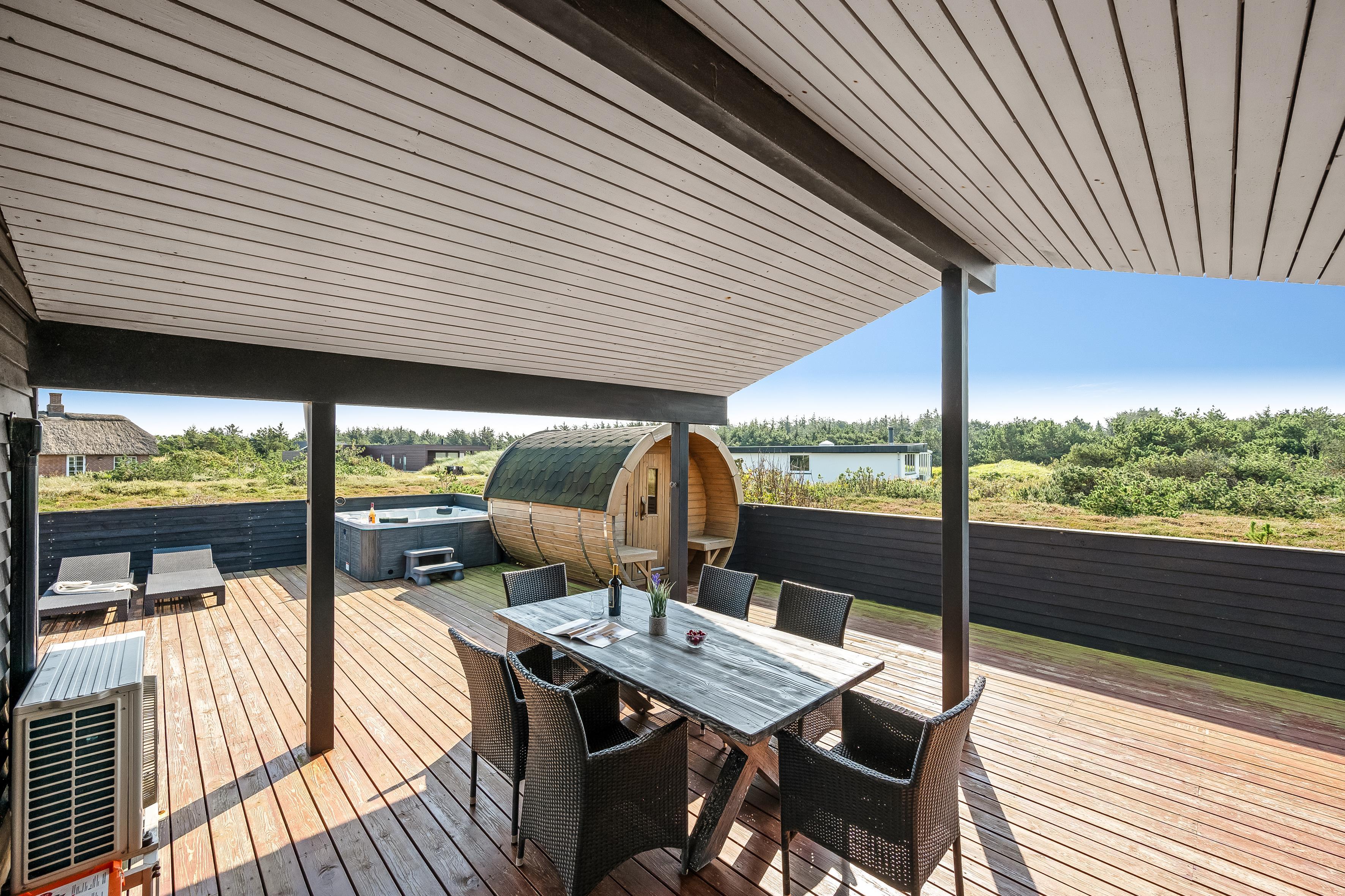 Das Ferienhaus verfügt über eine geräumige, geschlossene Holzterrasse, auf der Sie die frische Meeresluft genießen können. Die Terrasse enthält eine Außensauna, ideal zum Entspannen nach einem Tag am Strand, und einen Whirlpool für 6 Personen, in dem Sie die Blasen unter freiem Himmel genießen können. Ein Teil der Terrasse ist überdacht, sodass Sie bei jedem Wetter draußen sitzen können.