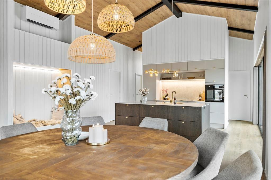 Die offene, großzügige Küche lädt dazu ein, gemeinsam zu kochen, den Tisch zu decken oder einfach auf dem Sofa zu entspannen. Und wenn der Tag sich dem Ende neigt, können Sie es sich auf dem Sofa mit einem Film gemütlich machen und den sanften Abendhimmel genießen.