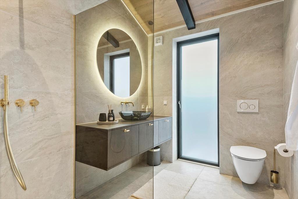 Hier spielt sich das Leben draußen ab. Auf der großzügigen Terrasse können Sie in den Loungemöbeln die Sonne genießen, Ihre Lieblingsgerichte grillen und einfach die frische Luft einatmen. Und wenn der Abend hereinbricht, können Sie sich im warmen Whirlpool entspannen und den Sternenhimmel bewundern.