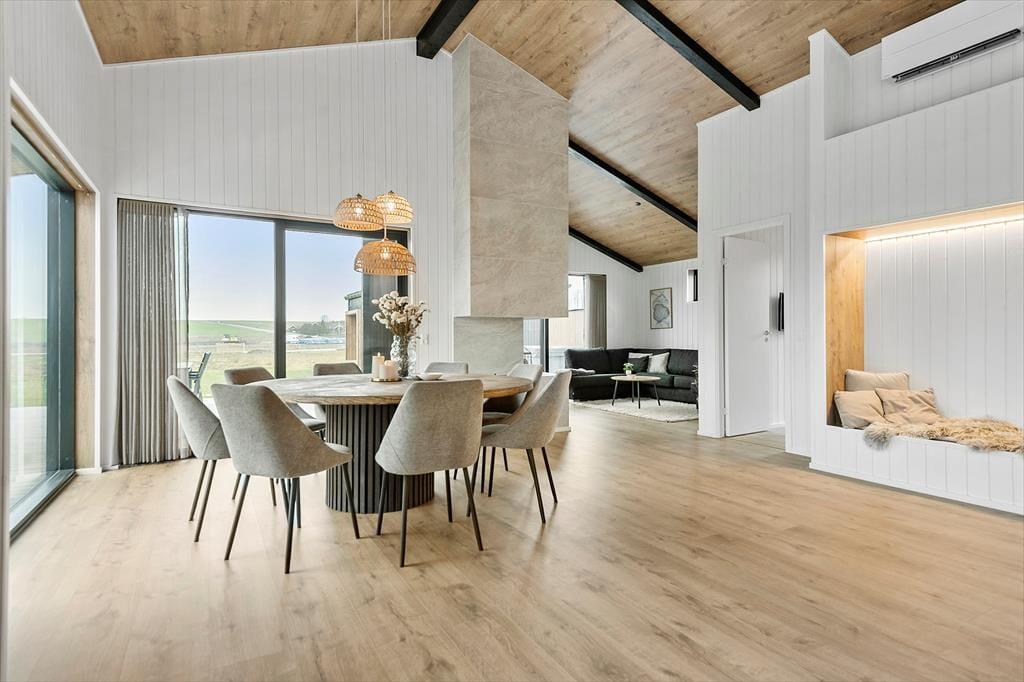 Sobald Sie das Ferienhaus betreten, spüren Sie die gemütliche und einladende Atmosphäre. Die hellen Holzwände, der offene Wohn- und Küchenbereich und die großen Fenster schaffen eine freundliche Umgebung, in der das Beisammensein im Mittelpunkt steht. Genießen Sie lange Abende am Esstisch mit guten Gesprächen und Brettspielen, während das Feuer des Bio-Kamins eine wohlige Wärme verbreitet.