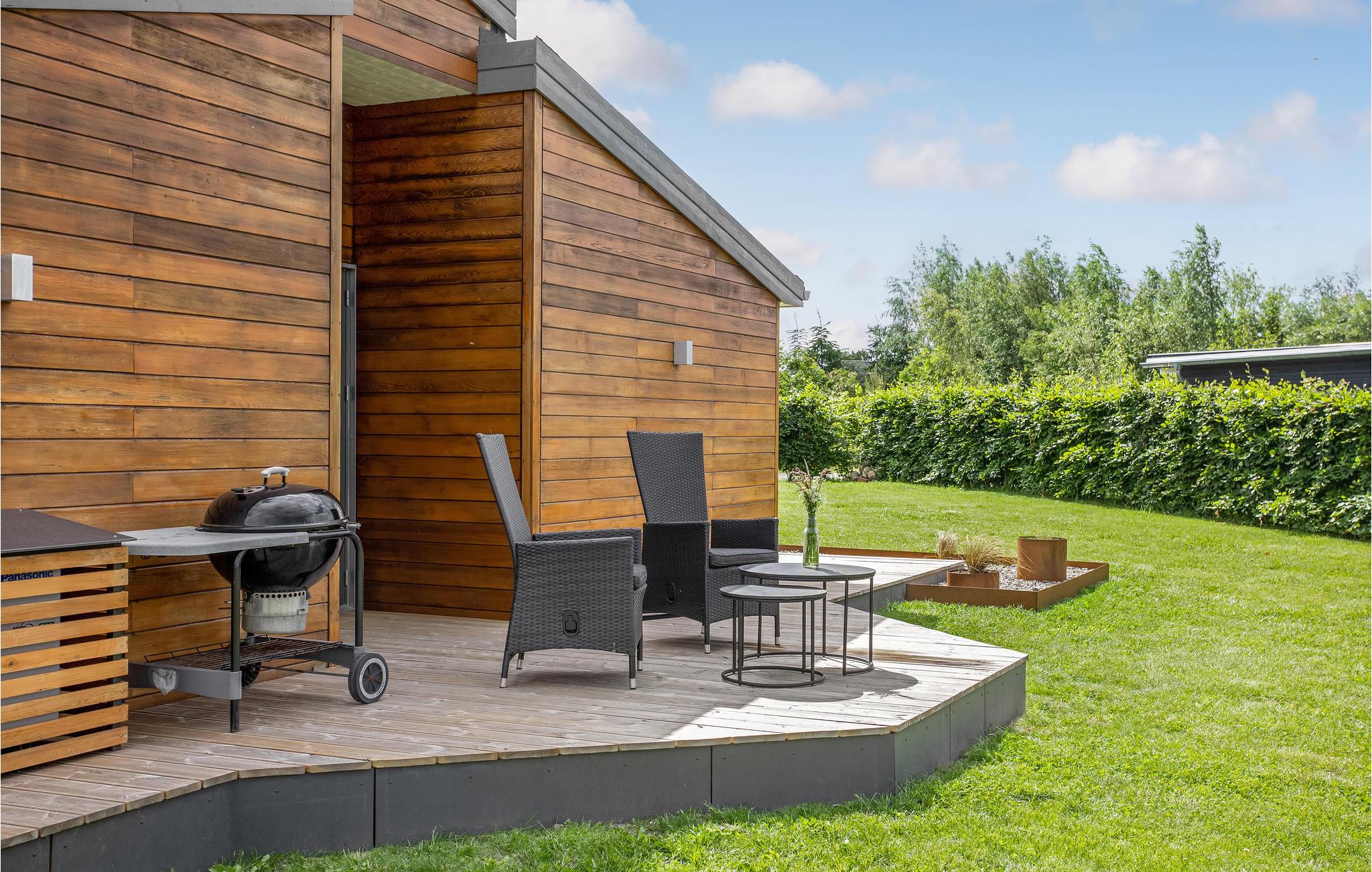 Modernes, CO2-neutrales Ferienhaus mit Holzterrasse und Badezuber nahe dem weißen Strand von Saksild.