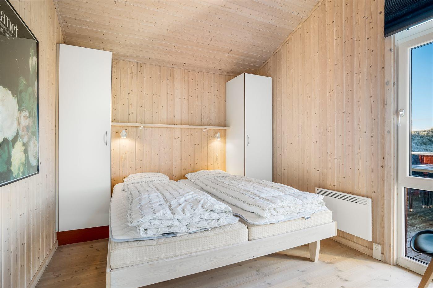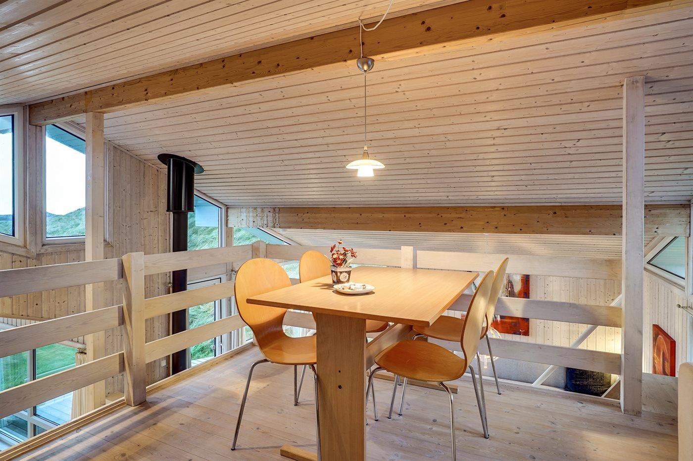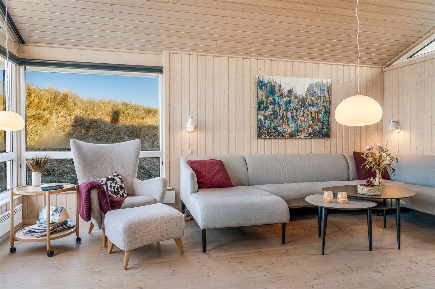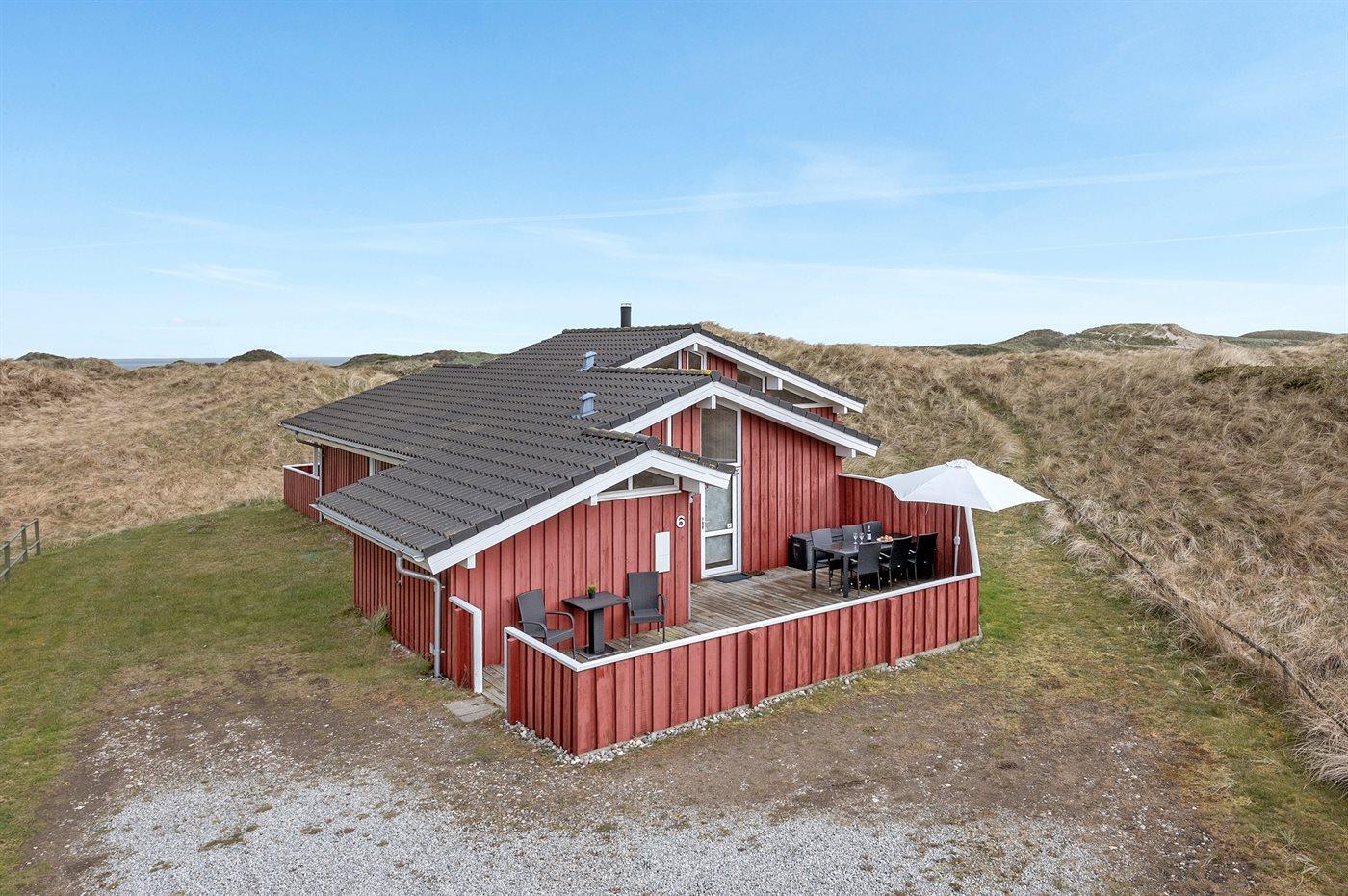 Sehr schönes Ferienhaus auf einem Dünengrundstück gelegen, nur 400 m von einem der besten Badestrände Dänemarks entfernt. Vom Wohnzimmer im offenen Obergeschoss Aussicht auf die mit Heide bewachsenen Dünen und auf die Nordsee. Naturschutzgebiet vor dem Haus. Das Haus ist mit 2 hübsch möblierten Wohnzimmer eingerichtet; 1 in versetzter Ebene und 1 im offenen Obergeschoss.