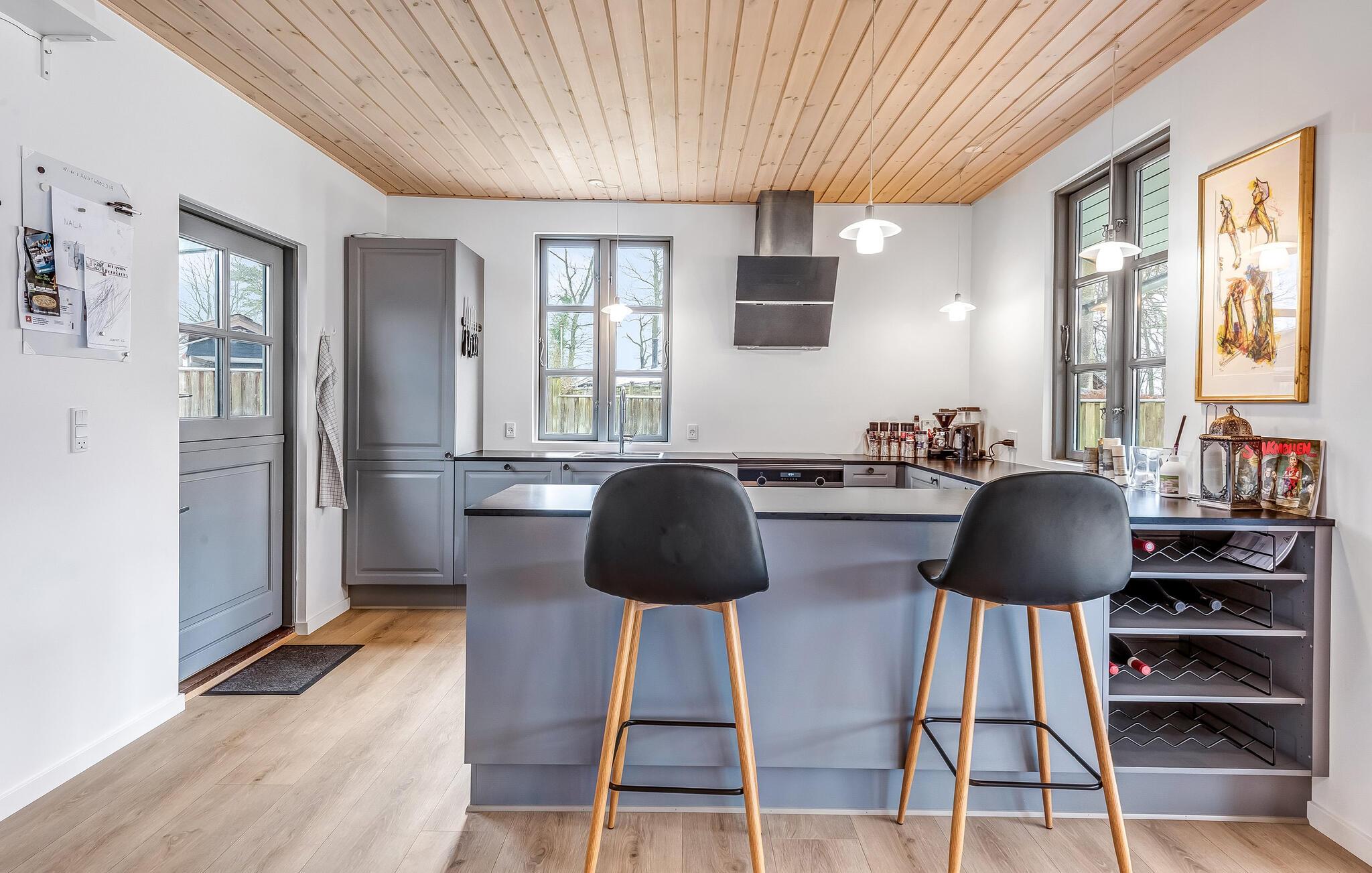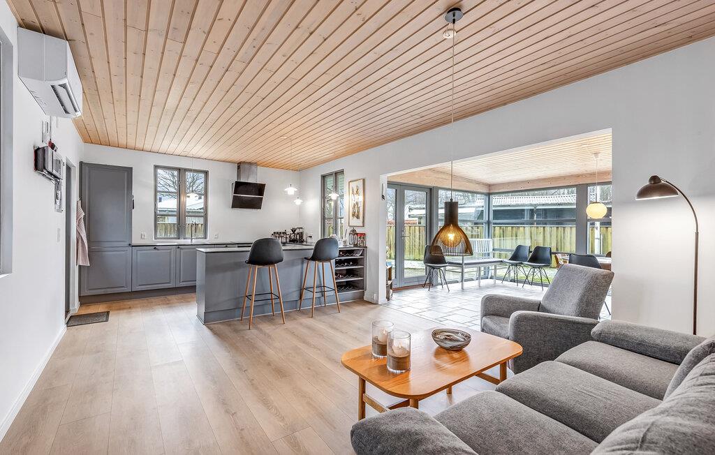 Verbringen Sie eine unbeschwerte Auszeit in diesem Ferienhaus, eingebettet in eine ruhige Umgebung und nur wenige Gehminuten vom Strand entfernt. Das Haus überzeugt durch seine lichtdurchfluteten Räume und bietet reichlich Platz für gemeinsame Aktivitäten und erholsame Stunden. Entspannen Sie sich im offenen Wohnbereich, wo ein Kamin an kühlen Abenden für wohlige Wärme sorgt. Bereiten Sie in der schönen, offenen Küche leckere Mahlzeiten zu und nutzen Sie den Wintergarten, in dem der Esstisch für gesellige Runden mit der Familie oder Freunden.