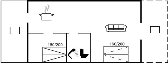 Es gibt einen Schlafraum. 2 Schlafplätze in einem Doppelbett. 2 Schlafplätze auf einer Doppelschlafcouch. 2 von diesen Schlafplätzen befinden sich im Wohnzimmer.