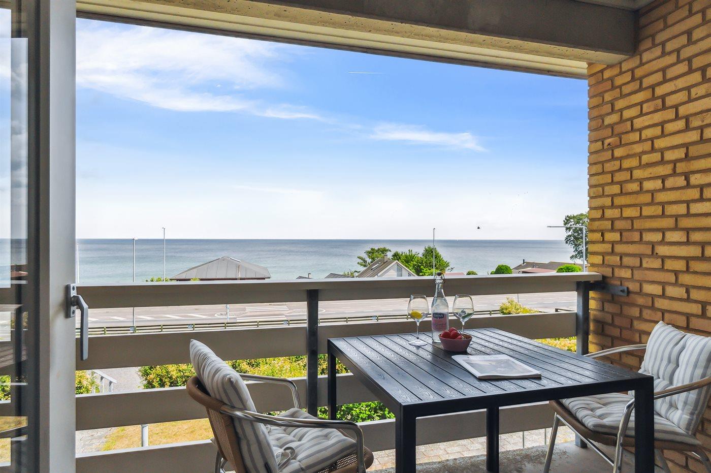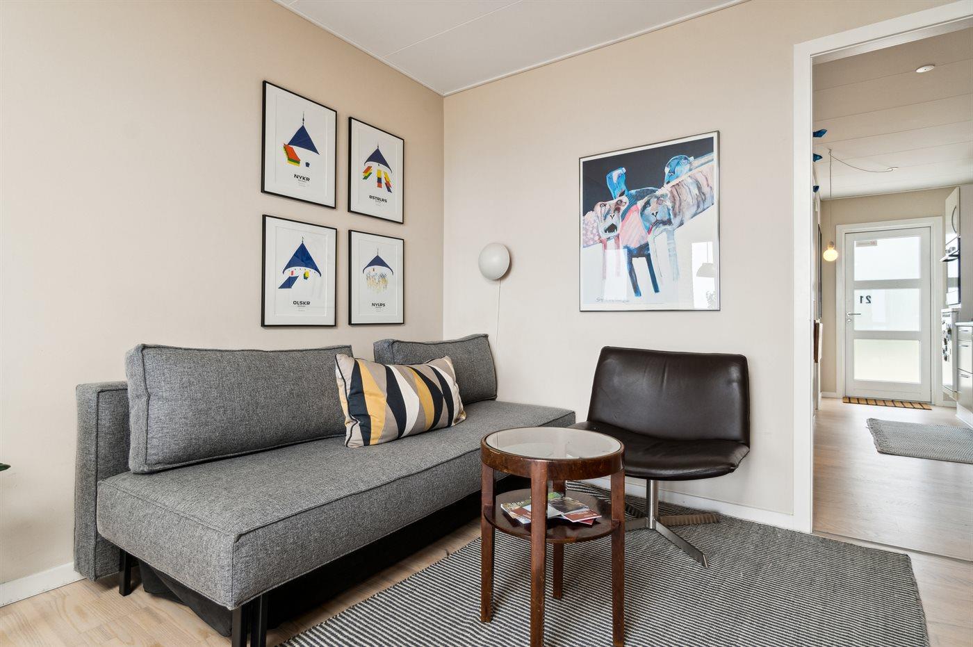 Diese schön eingerichtete Ferienwohnung im Obergeschoss bietet einen 180-Grad-Meerblick über die wunderschöne Ostsee. Die Wohnung ist Teil einer Reihenhauslösung, die am Hang zum Sandstrand in Sandkås liegt. Die Wohnung ist besonders hell, da in dieser Wohnung ein großes Oberlichtfenster montiert wurde, dadurch wird die Wohnung vor allem an bewölkten Tagen heller. Zum Oberlichtfenster gehören Jalousien, sodass das man das Fenster zuziehen kann, wenn die Schlafcouch im Wohnzimmer benutzt wird. Am anderen Ende der Wohnung befindet sich eine kleine Terrasse, auf der man die Sonne genießen kann, wenn sie von der Meerseite verschwindet.